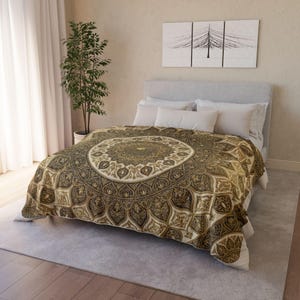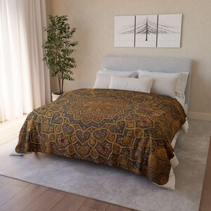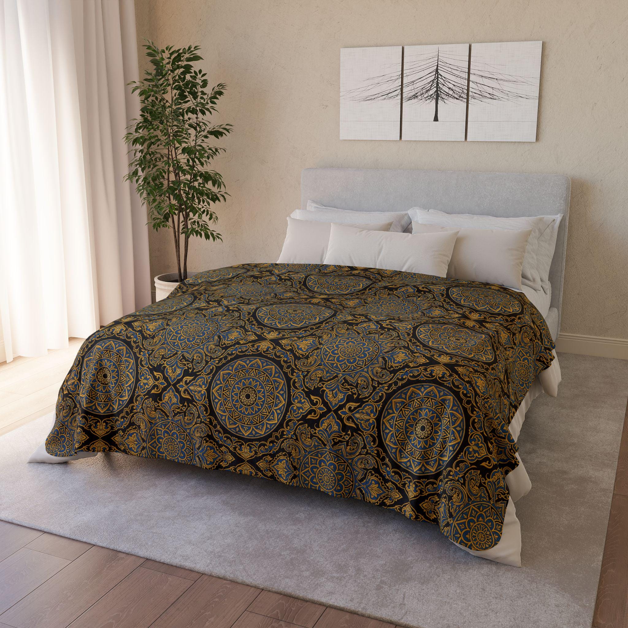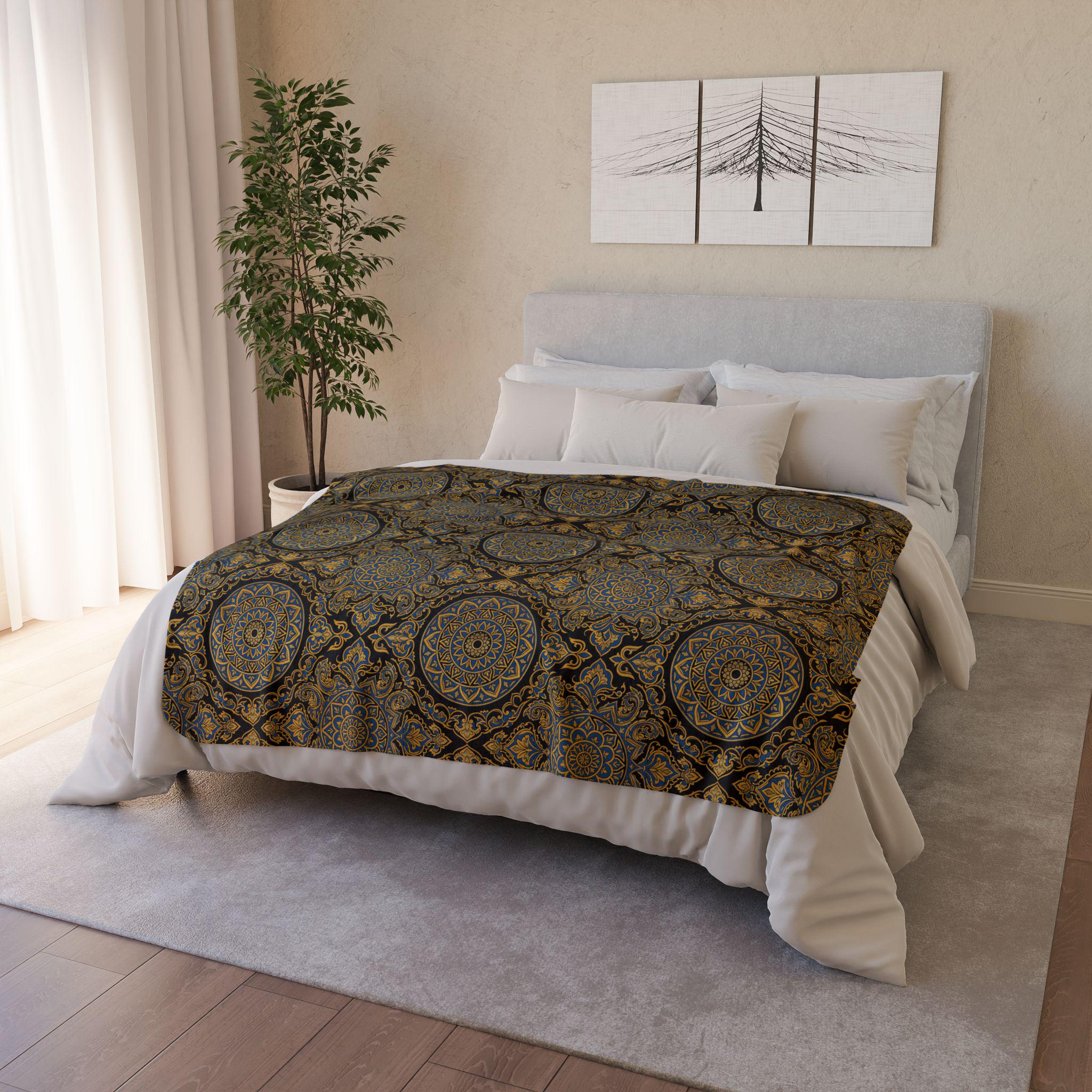 The design features an intricate Mughal mandala pattern, radiating with burnished golds and deep azures against a dark background. It offers the visual depth of a woven tapestry with the modern comfort of high-performance bedding. The dual-texture design features a smooth, vibrant print on one side and a fluffy, cloud-like Sherpa lining on the other.