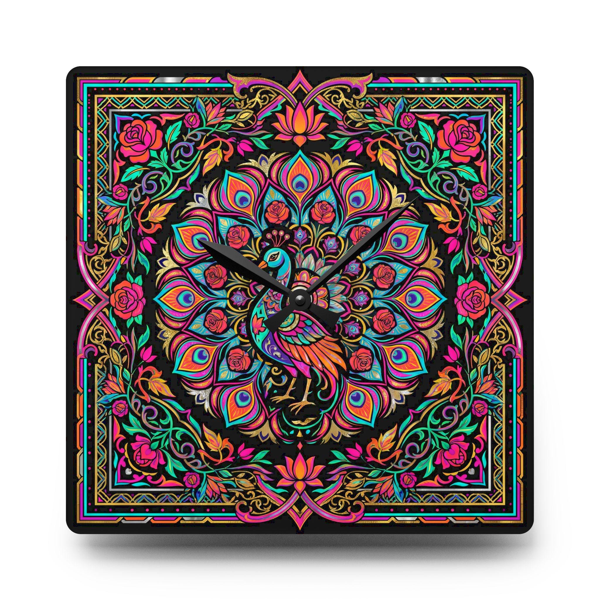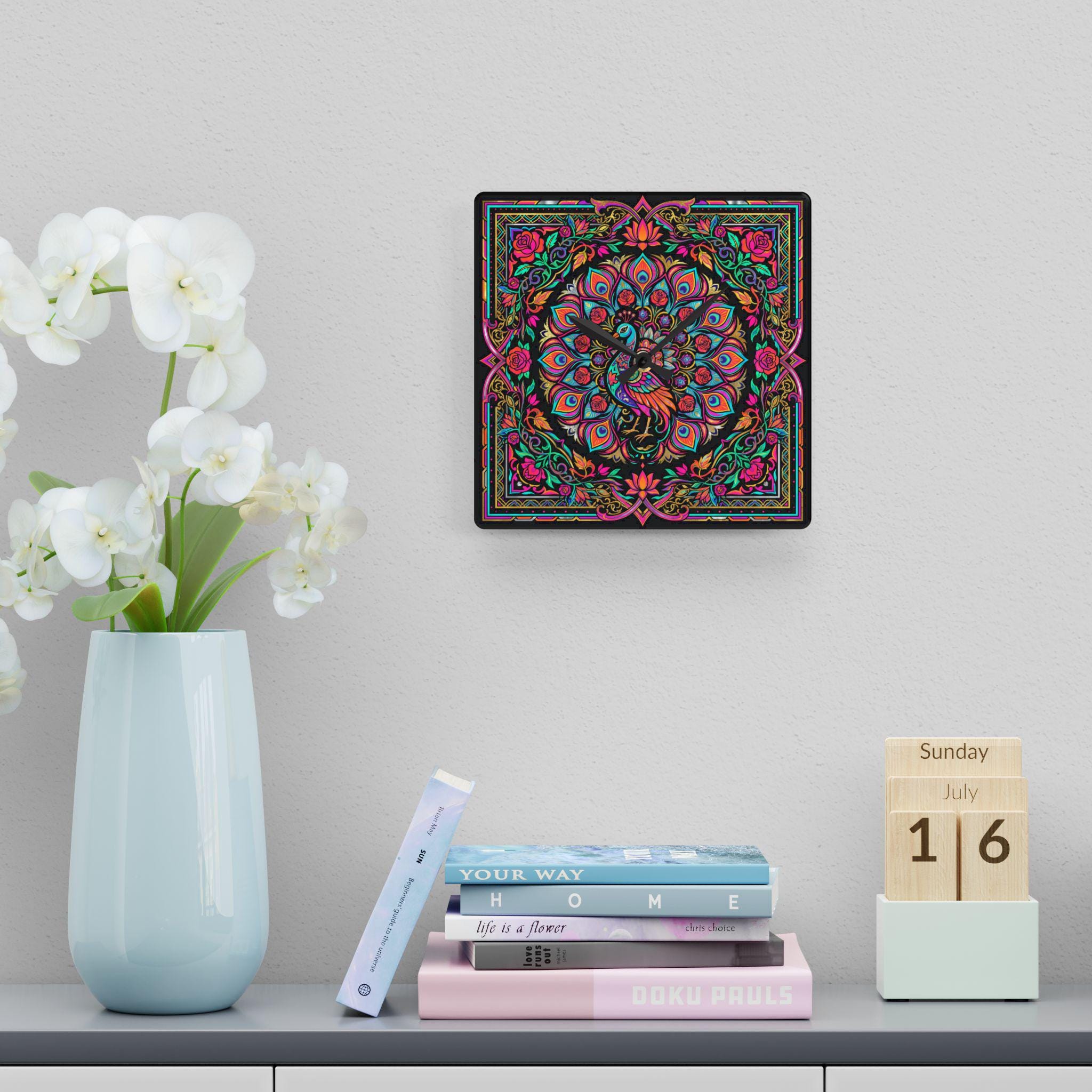 The intricate mandala design features hand-drawn floral and geometric patterns in vibrant jewel tones (deep pink, turquoise, coral, gold) printed on crystal-clear acrylic. It catches the light, adds color to any room, and sparks conversations. Every time they glance at it, they'll think of you.