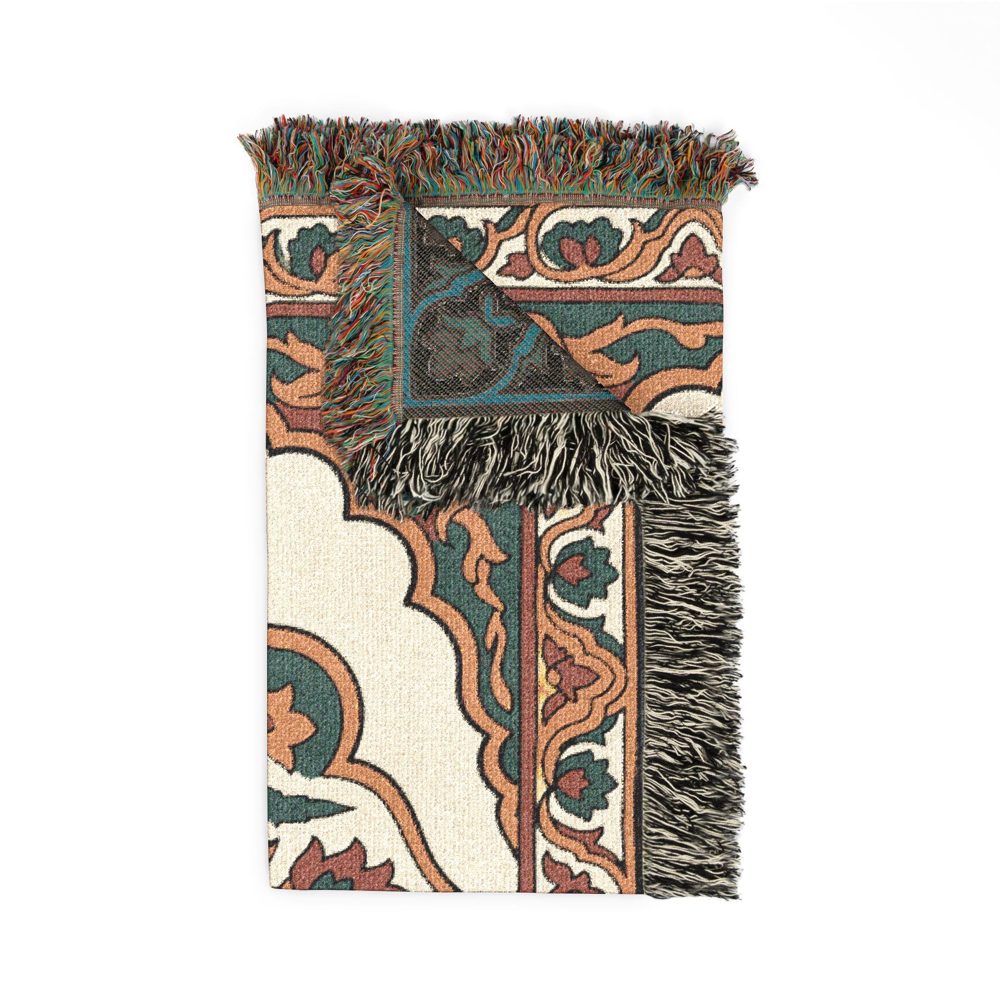 Transform your space with this stunning Moroccan-inspired woven cotton blanket that brings artisan craftsmanship and cottagecore charm to any room. Handwoven-style jacquard construction creates a rich, textured medallion pattern in warm terracotta, deep teal, and cream tones with decorative fringed edges.