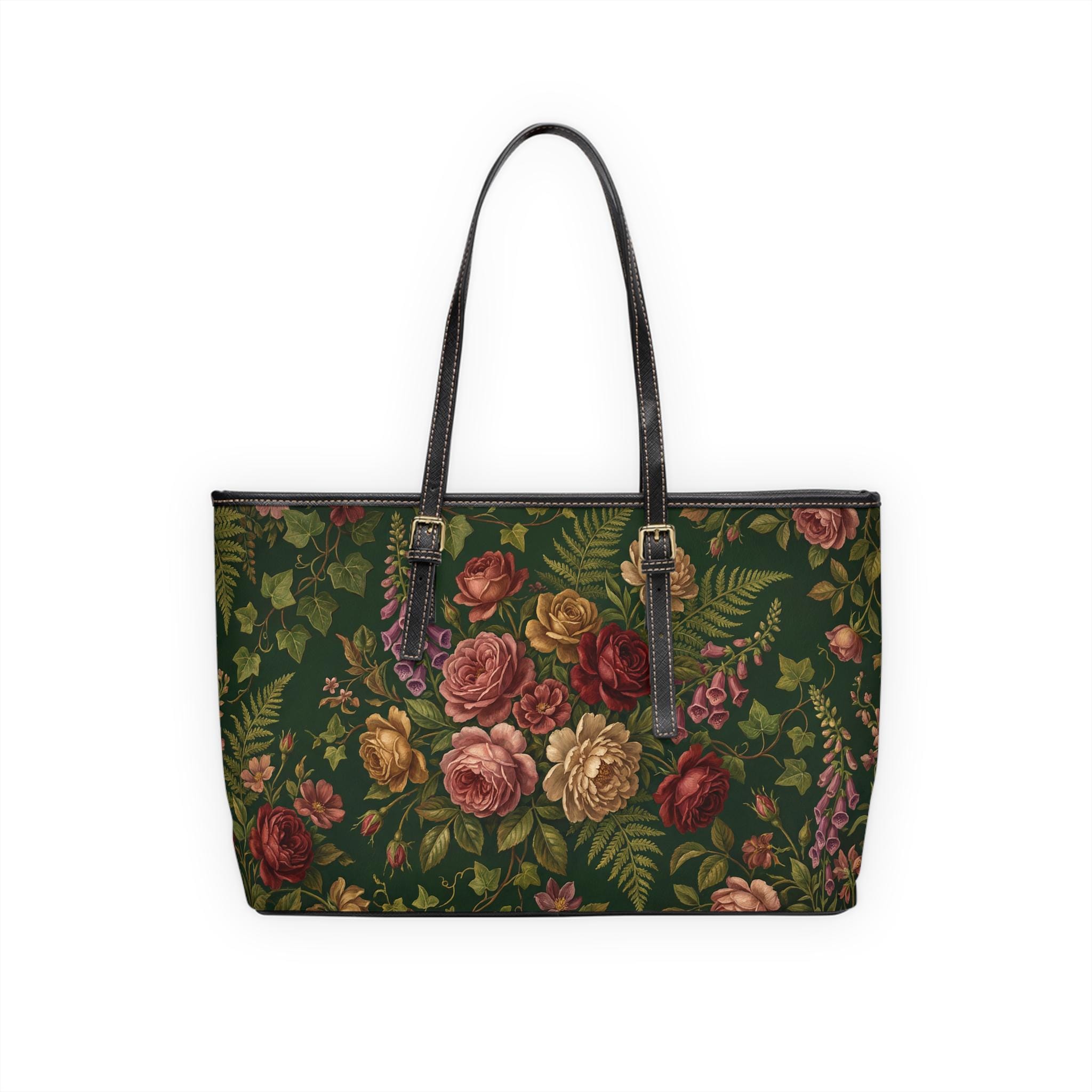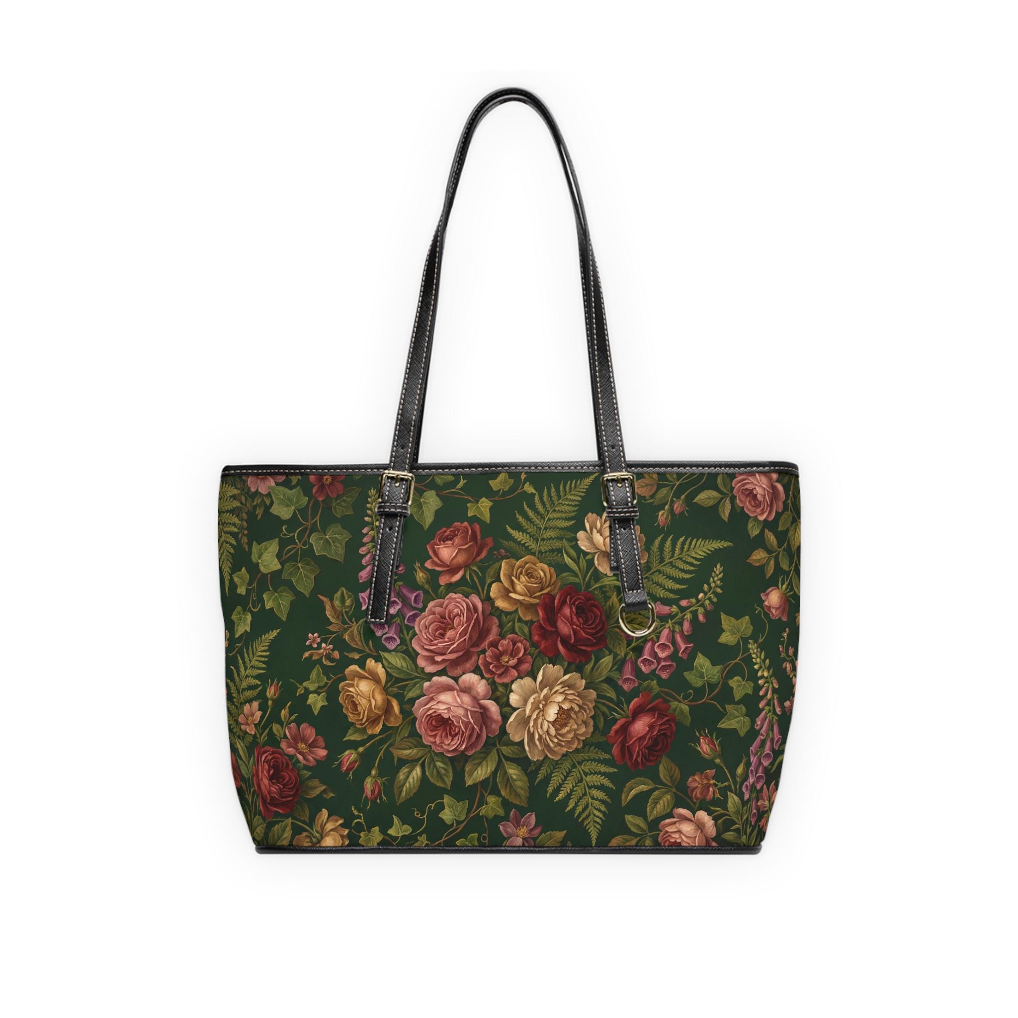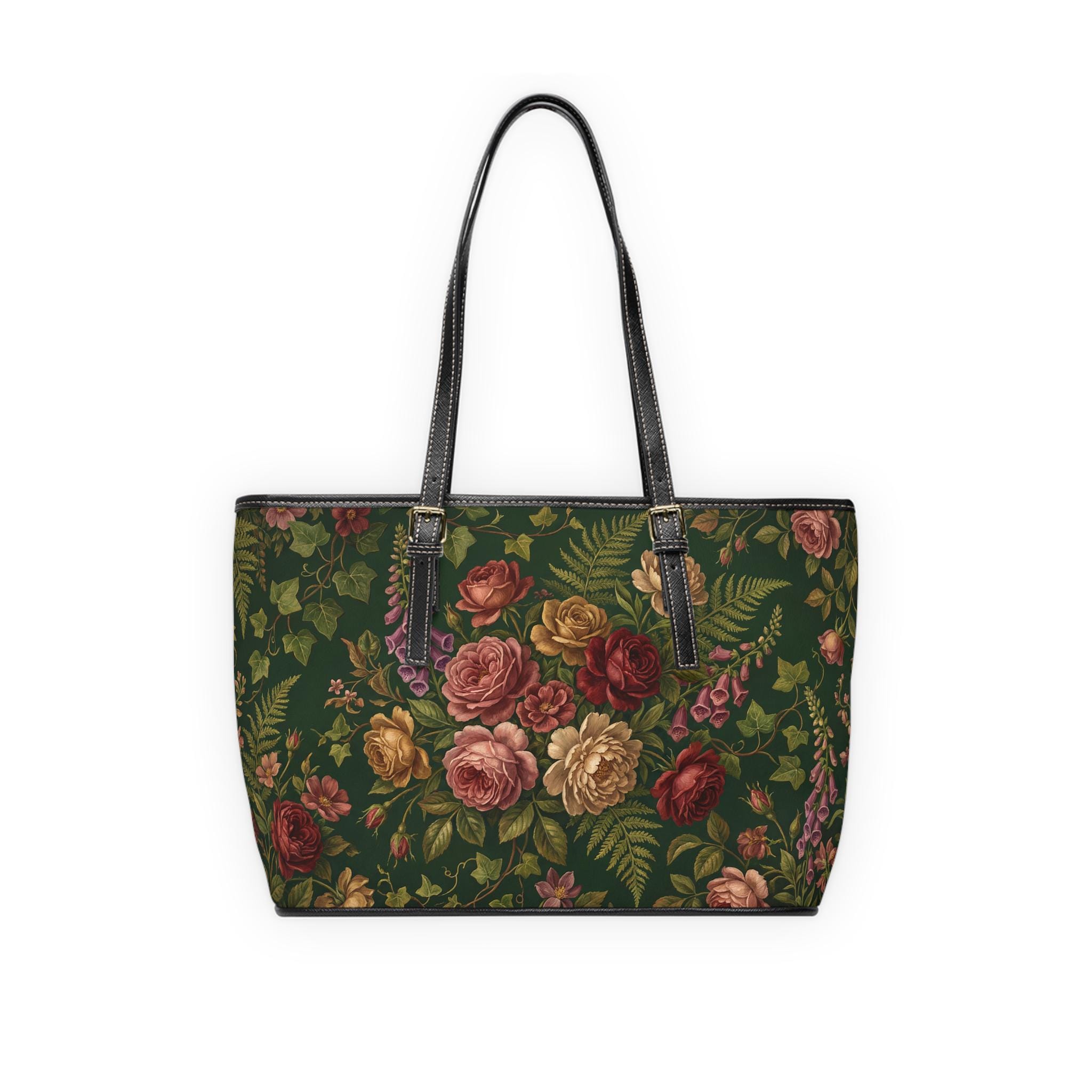 Vintage Rose Floral Pattern PU Leather Shoulder Bag | Dark Green Botanical Tote