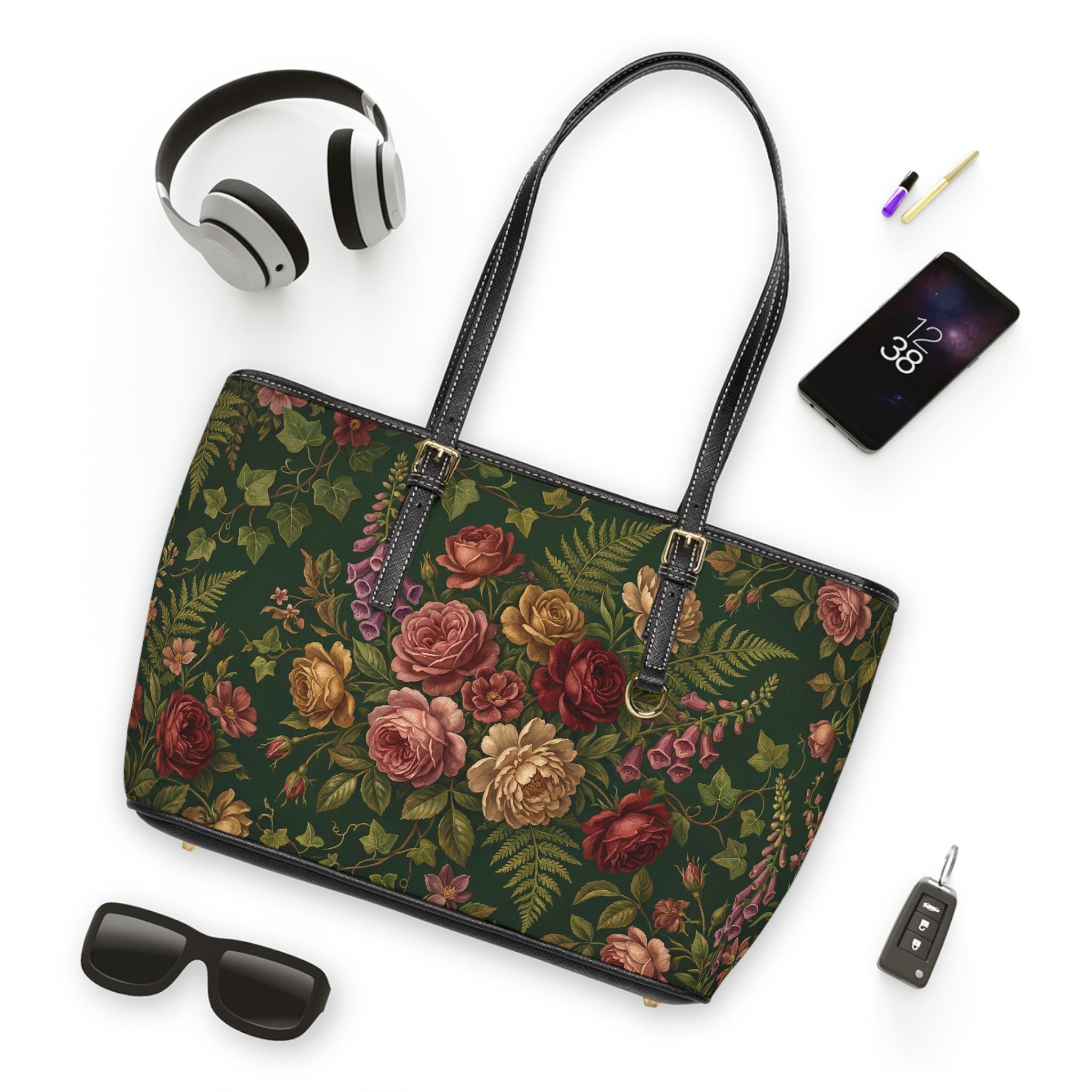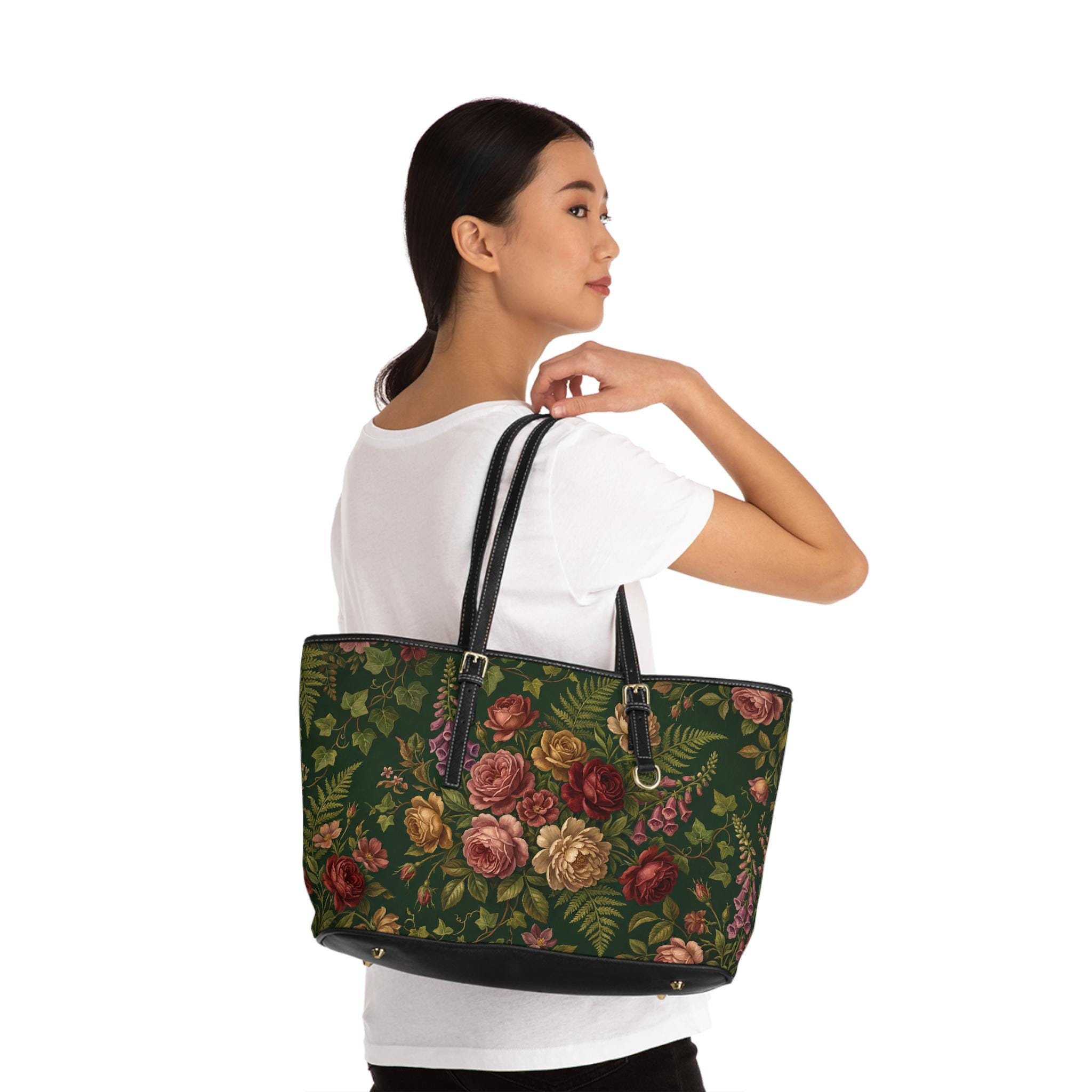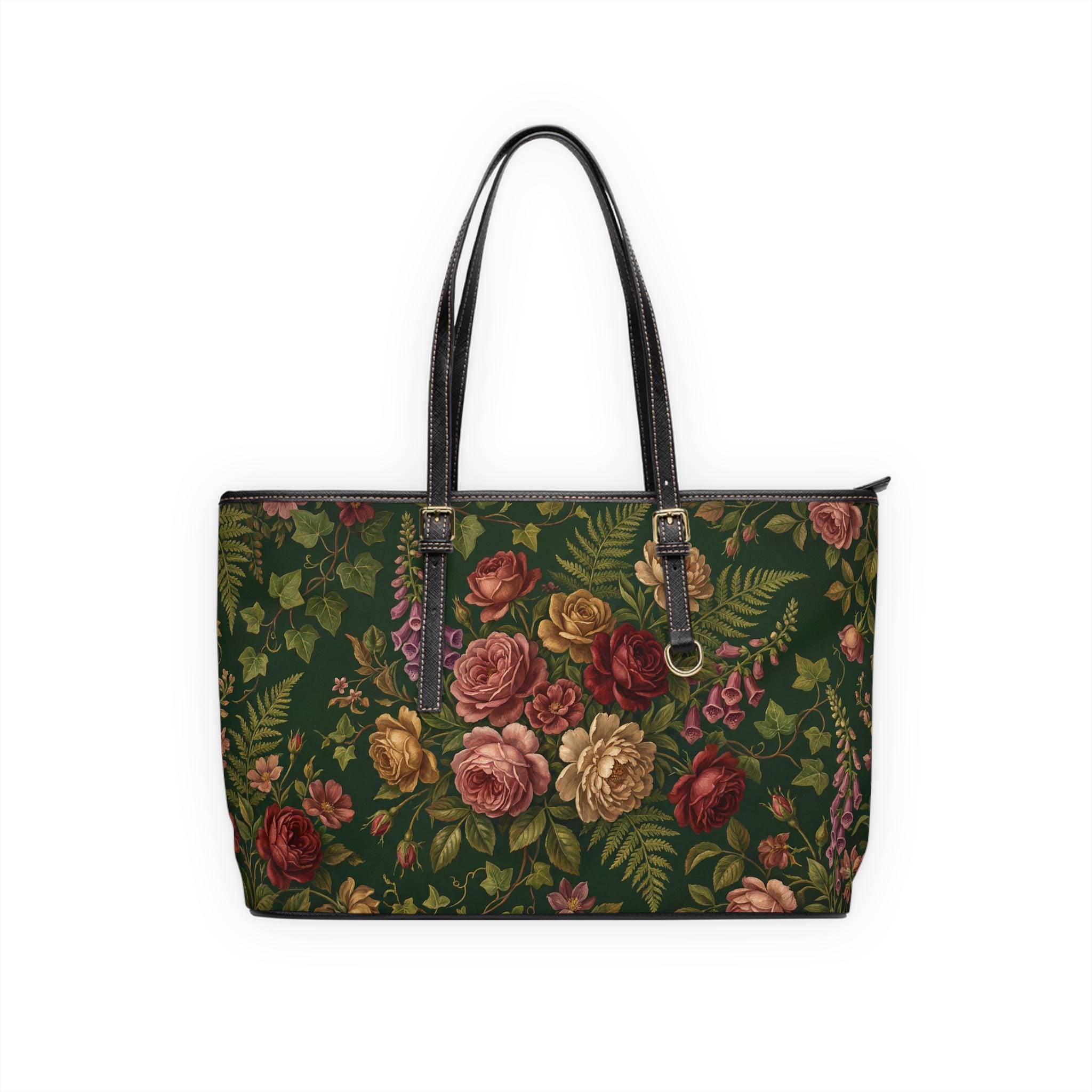 Vintage Rose Floral Pattern PU Leather Shoulder Bag | Dark Green Botanical Tote