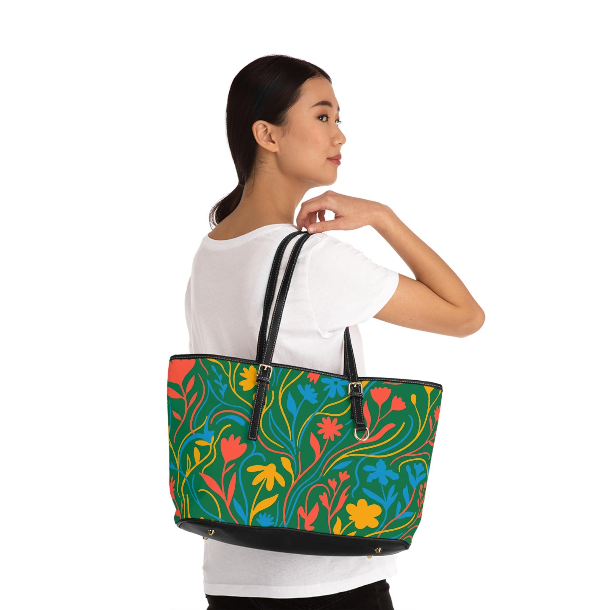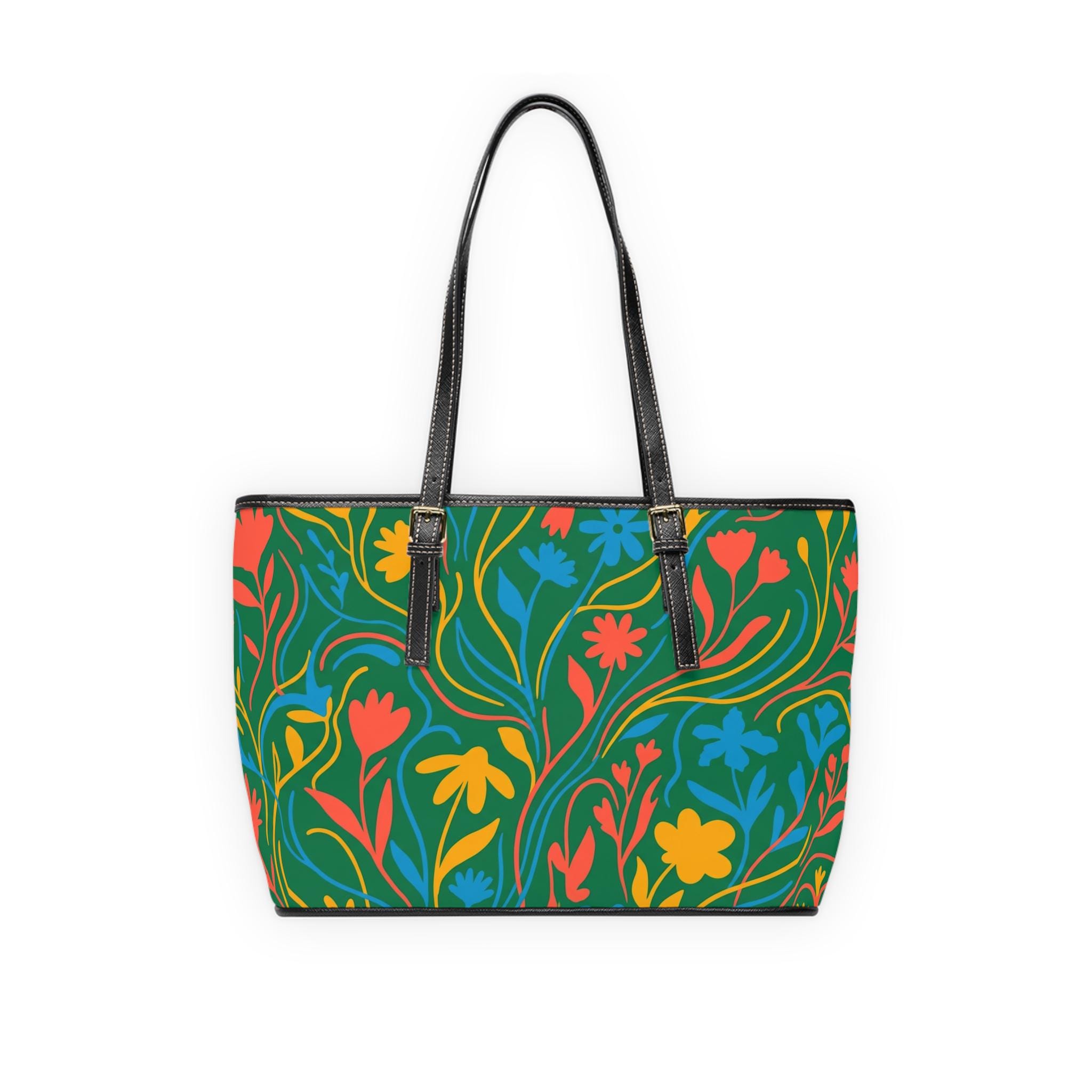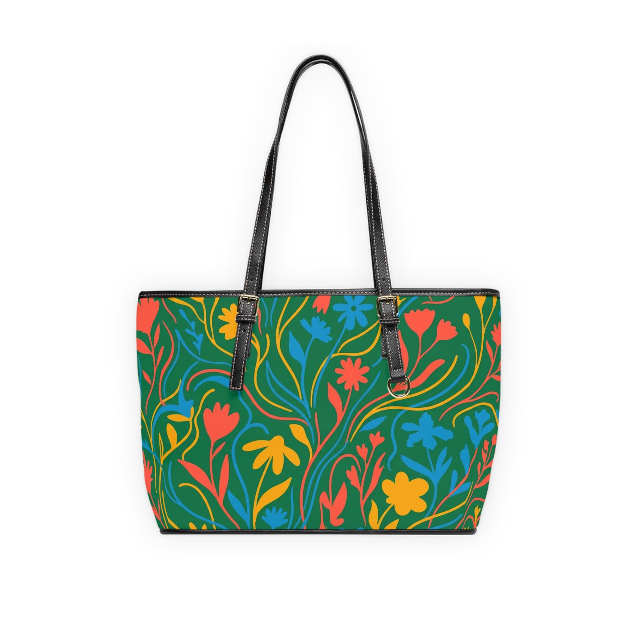 Colorful Floral Pattern PU Leather Shoulder Bag | Green Tote, Spring Flowers