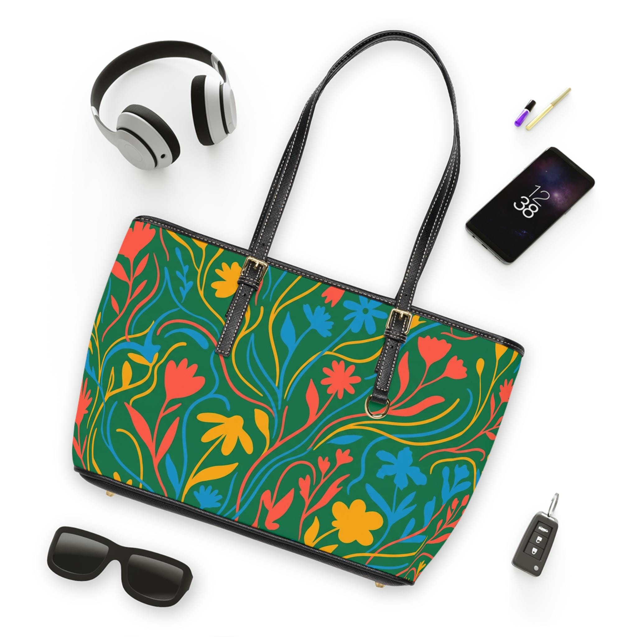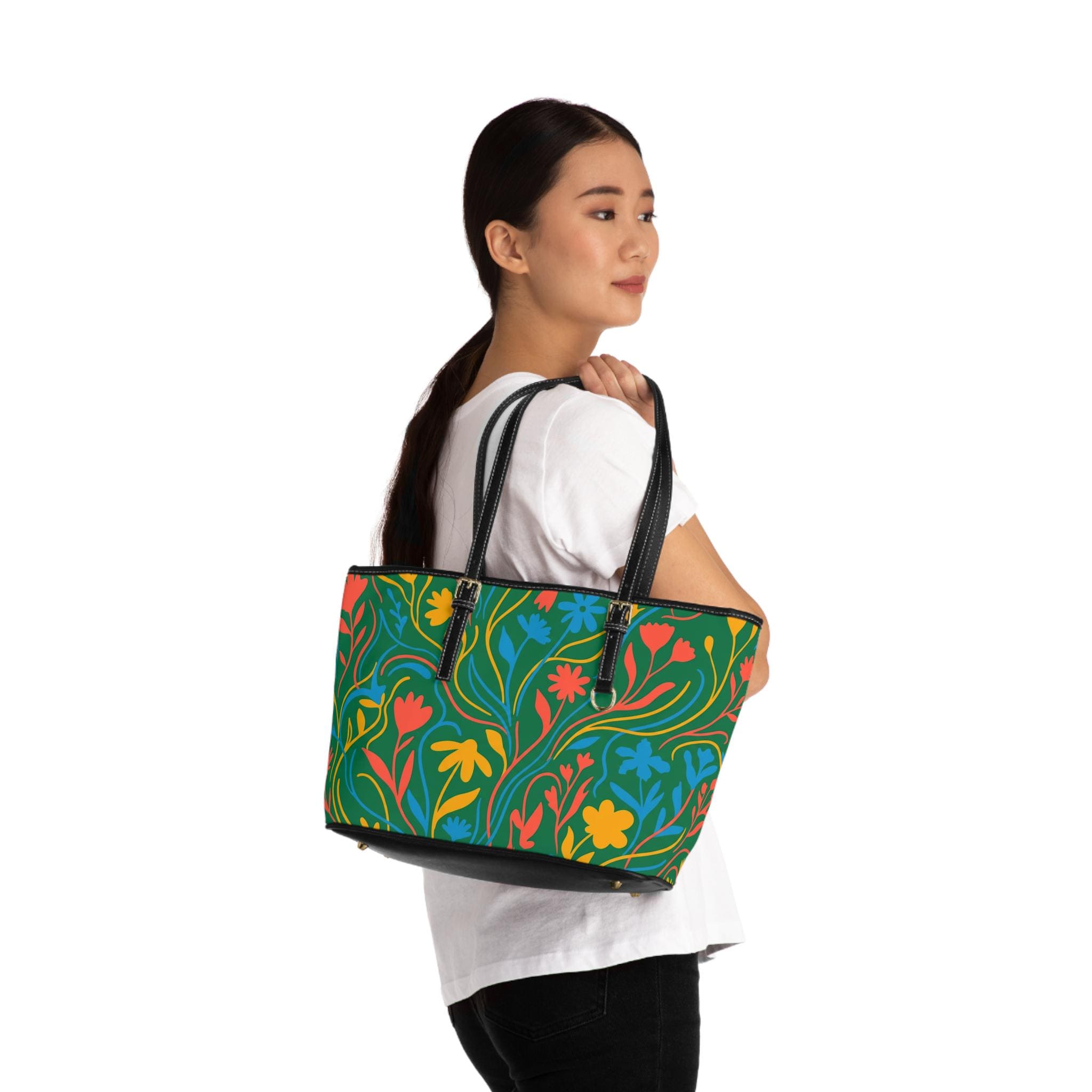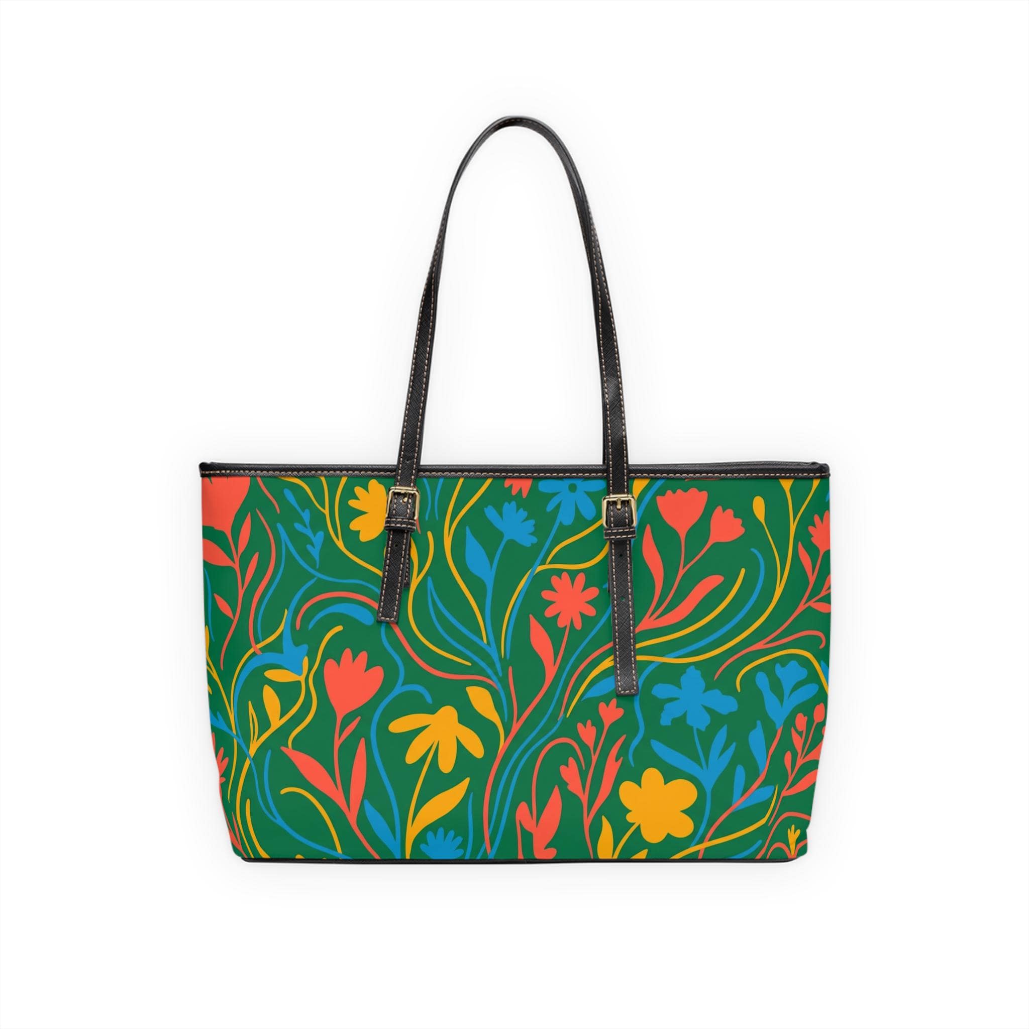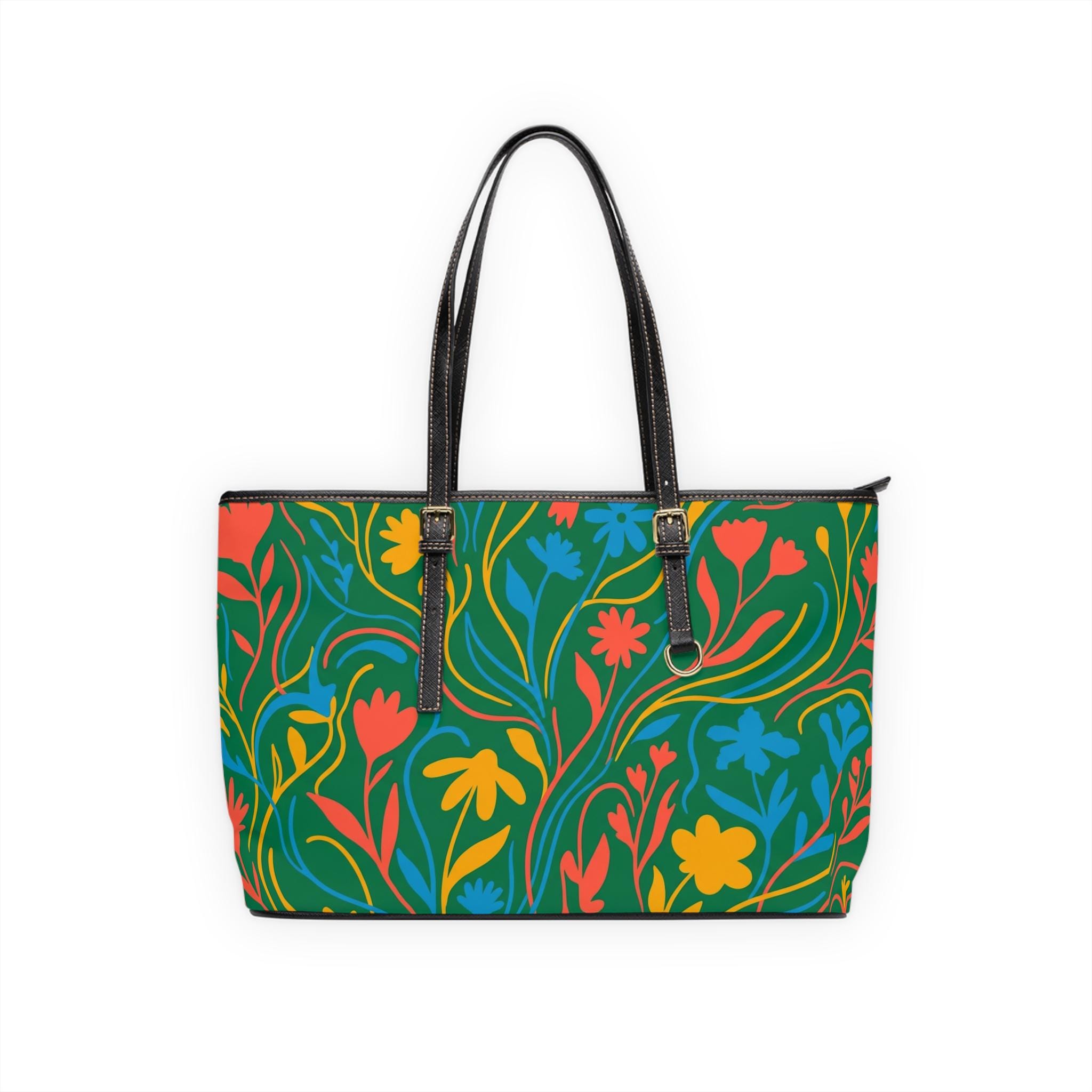 Colorful Floral Pattern PU Leather Shoulder Bag | Green Tote, Spring Flowers