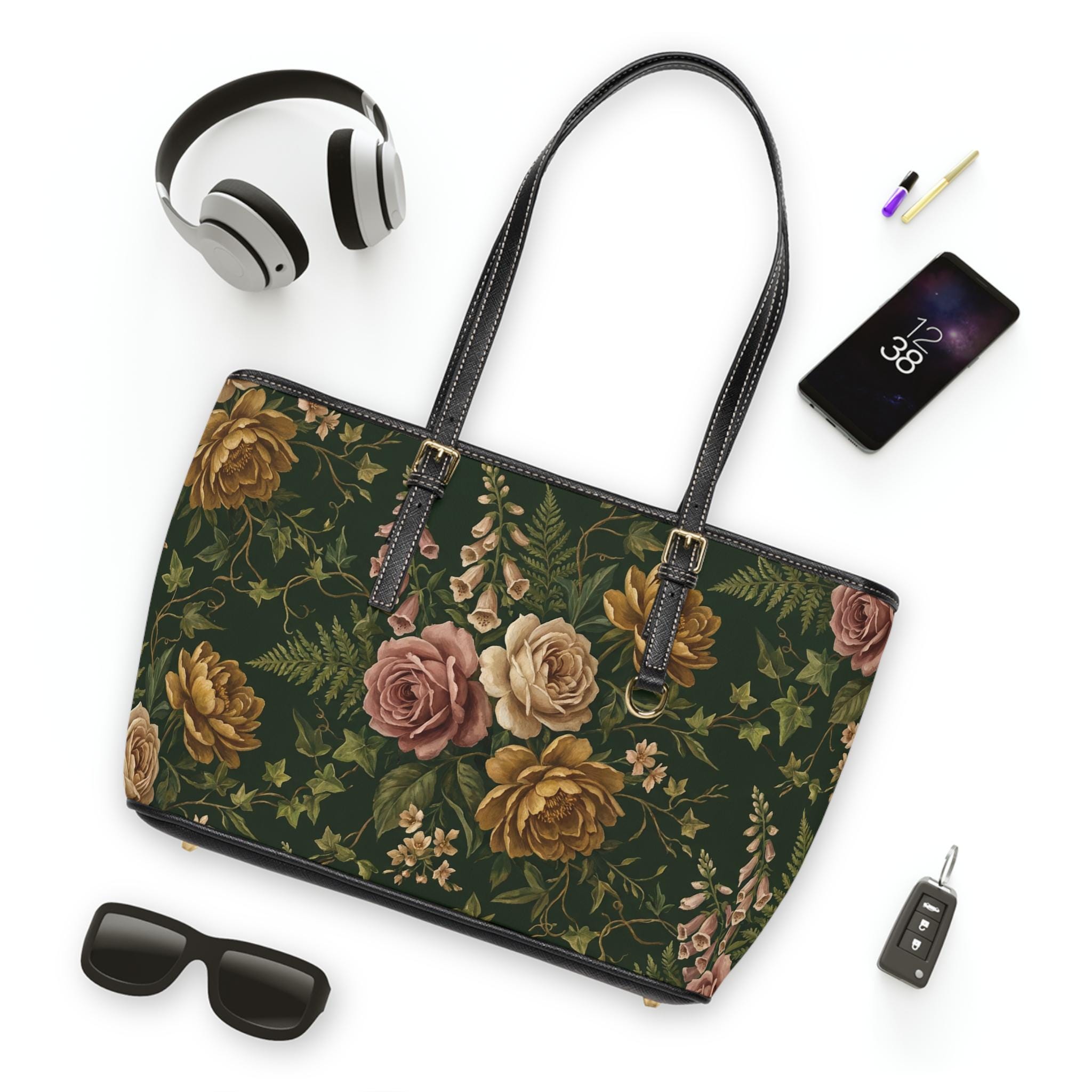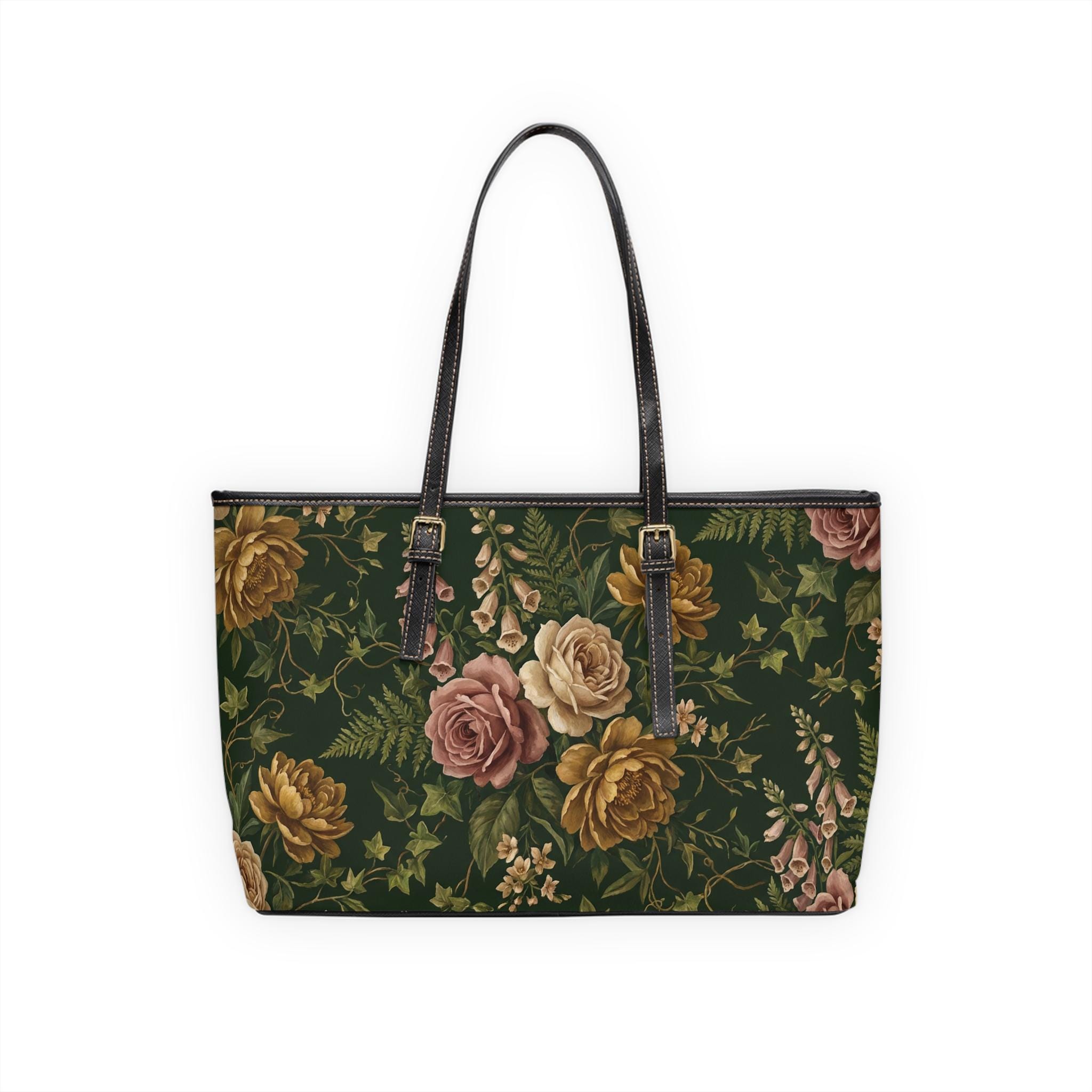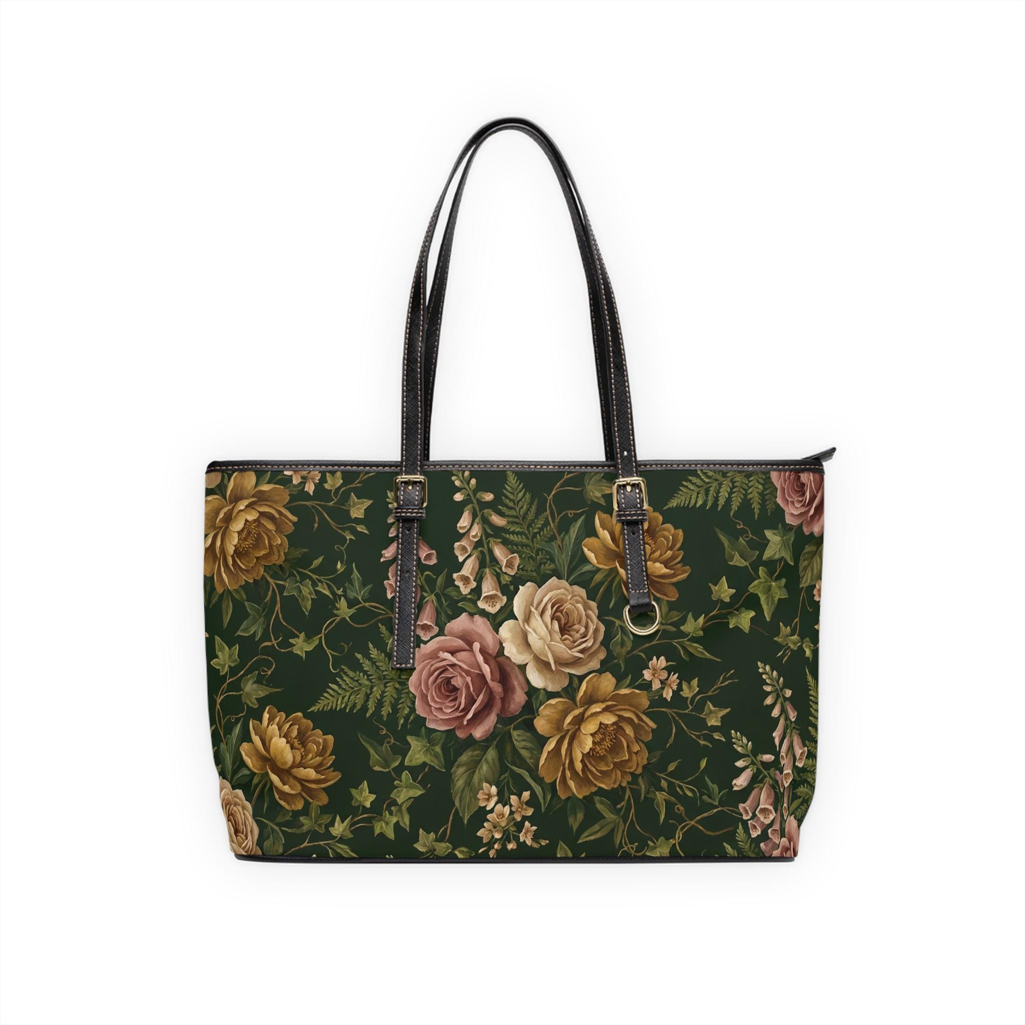This roomy PU leather shoulder bag blends vintage romance with modern durability. A deep forest background sets off painterly roses and climbing ivy in warm, muted tones — a design that feels like an heirloom scarf reimagined for everyday life. The structured silhouette holds its shape while the adjustable straps let you carry it as a shoulder tote or a hand-carry companion. Inside, a polyester-lined interior and thoughtfully placed pockets keep essentials organized: a zippered pocket for valuables and two open pockets for your phone and keys. Gold-colored hardware and a double-sided print give it a polished finish that reads both feminine and sophisticated. It’s the kind of bag that quietly elevates a sweater-and-jeans day or complements a dress for a weekend brunch, bringing a soft, nostalgic mood to daily routines.