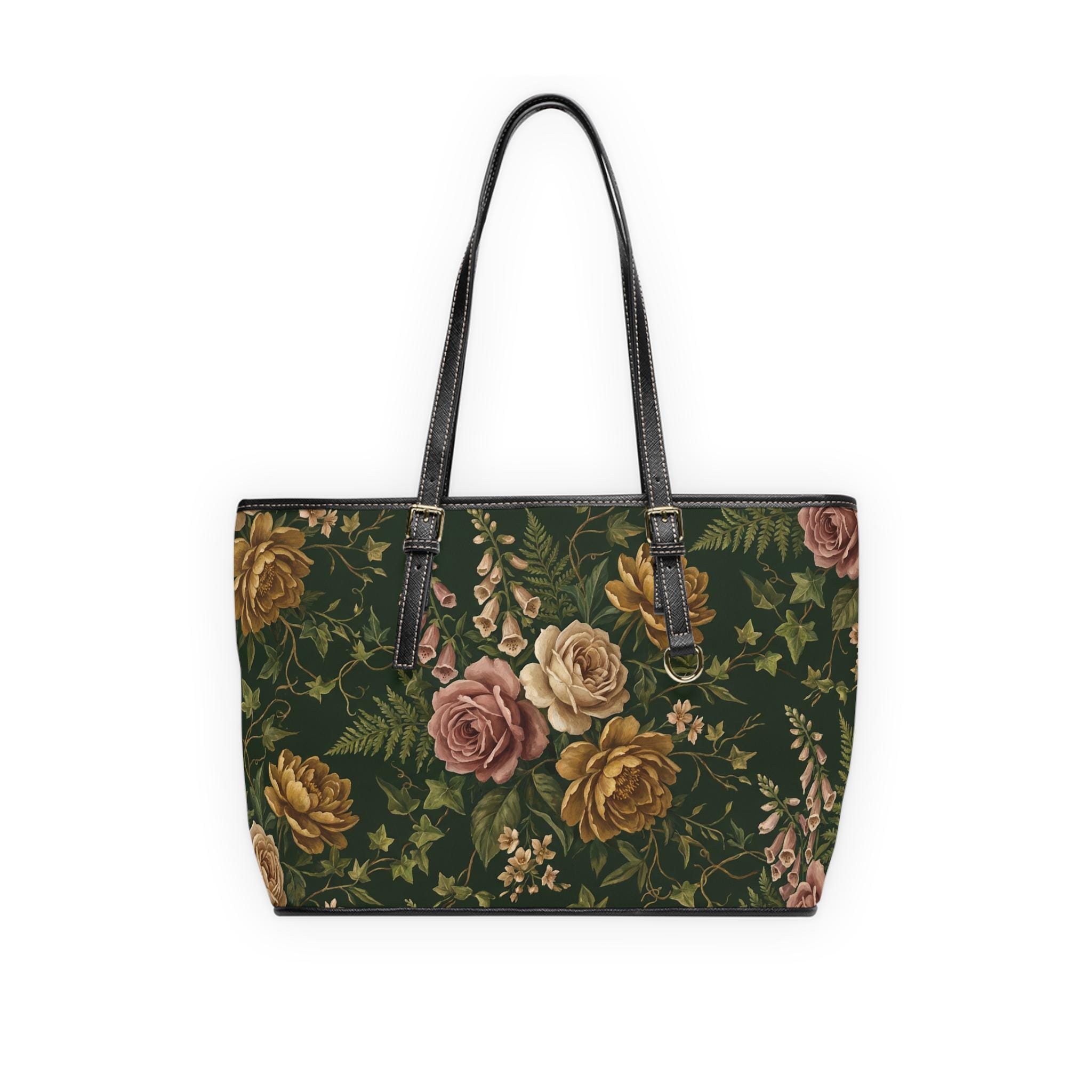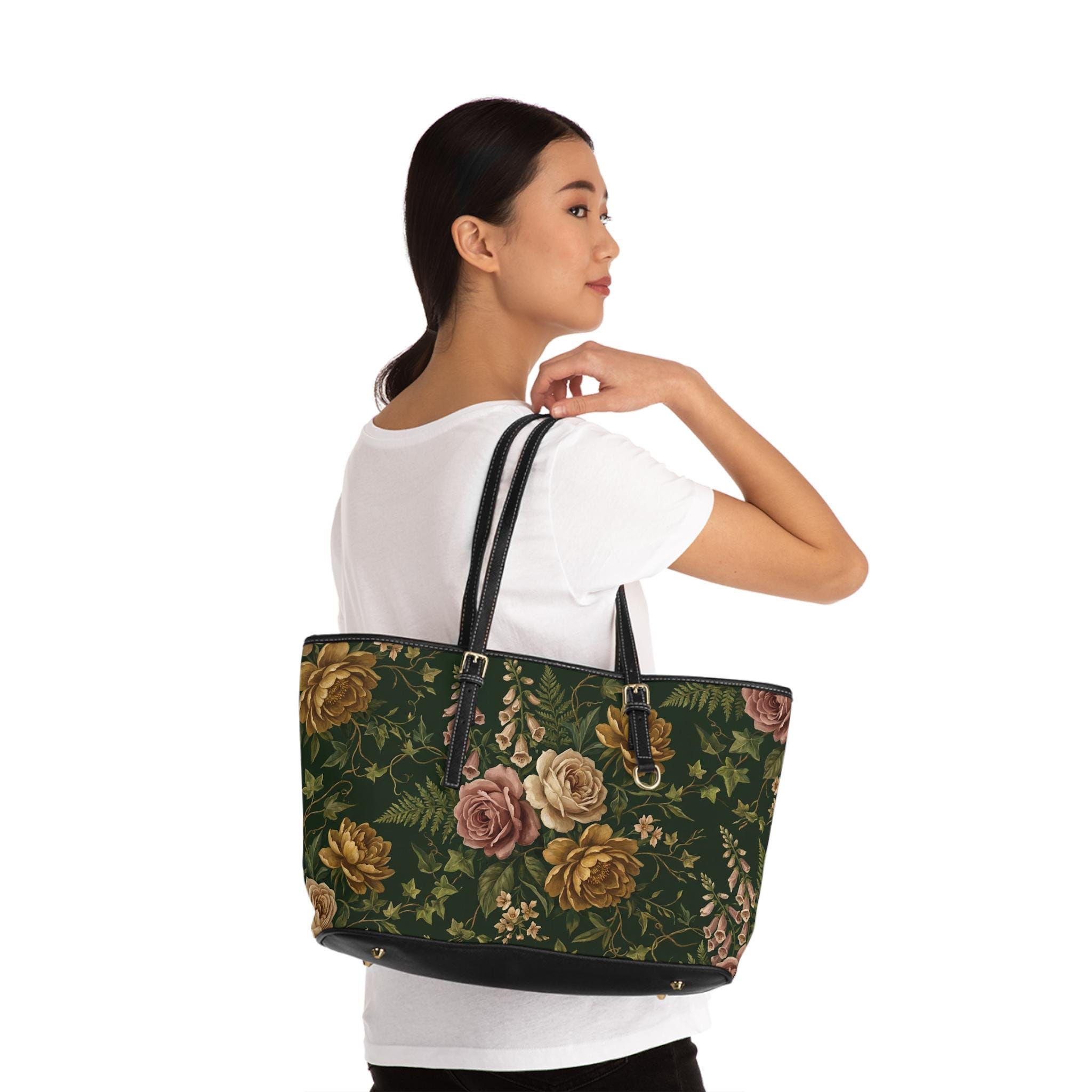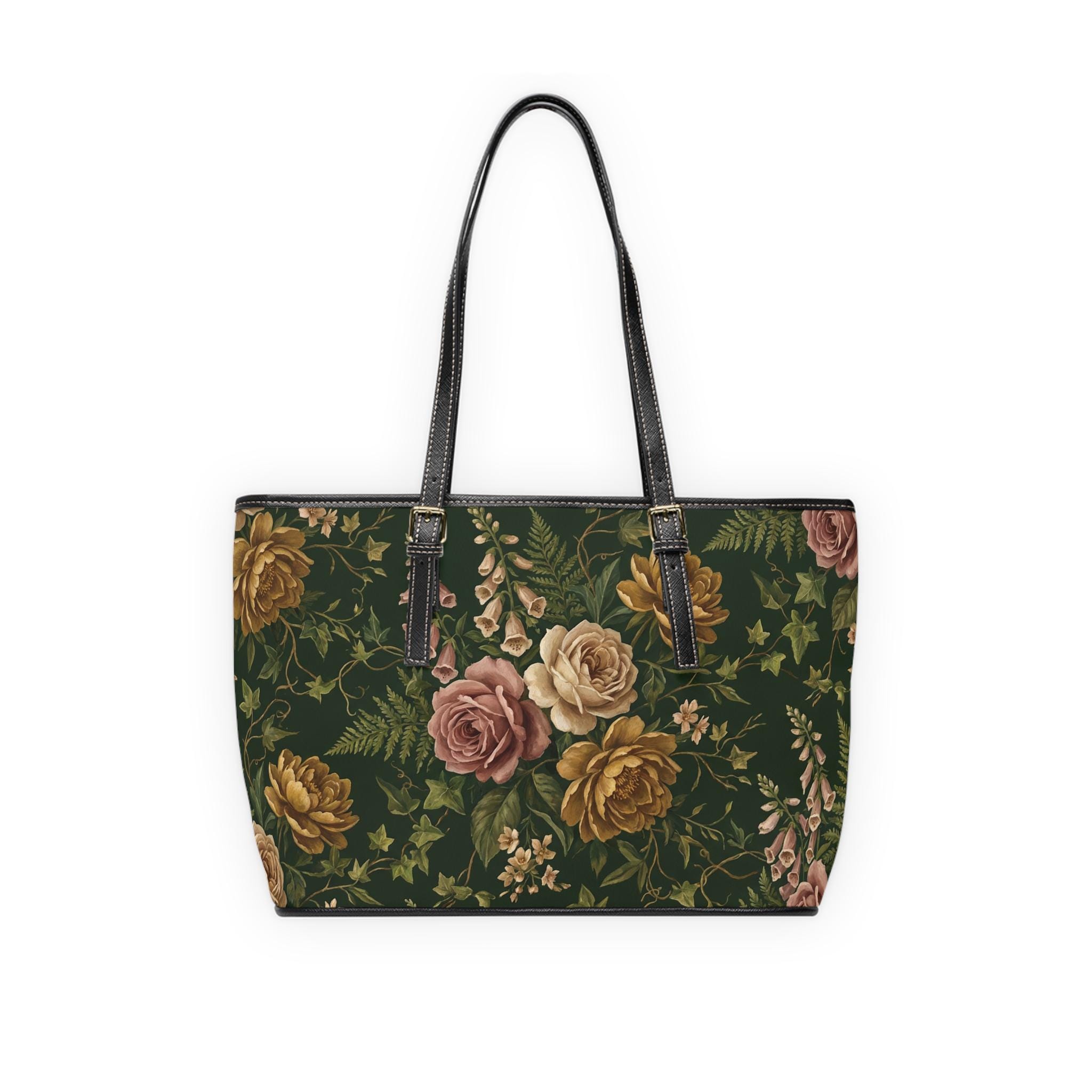 Vintage Rose Floral PU Leather Shoulder Bag | Dark Green Botanical Tote