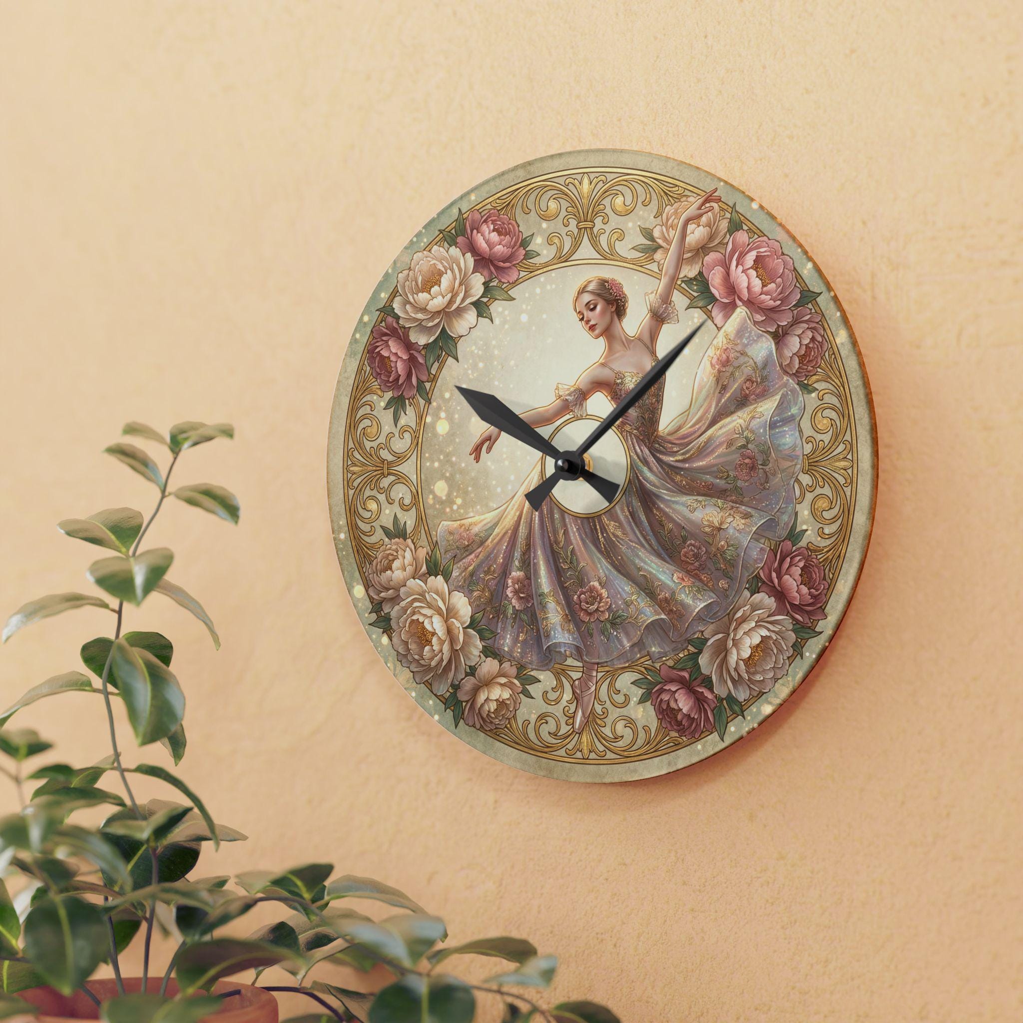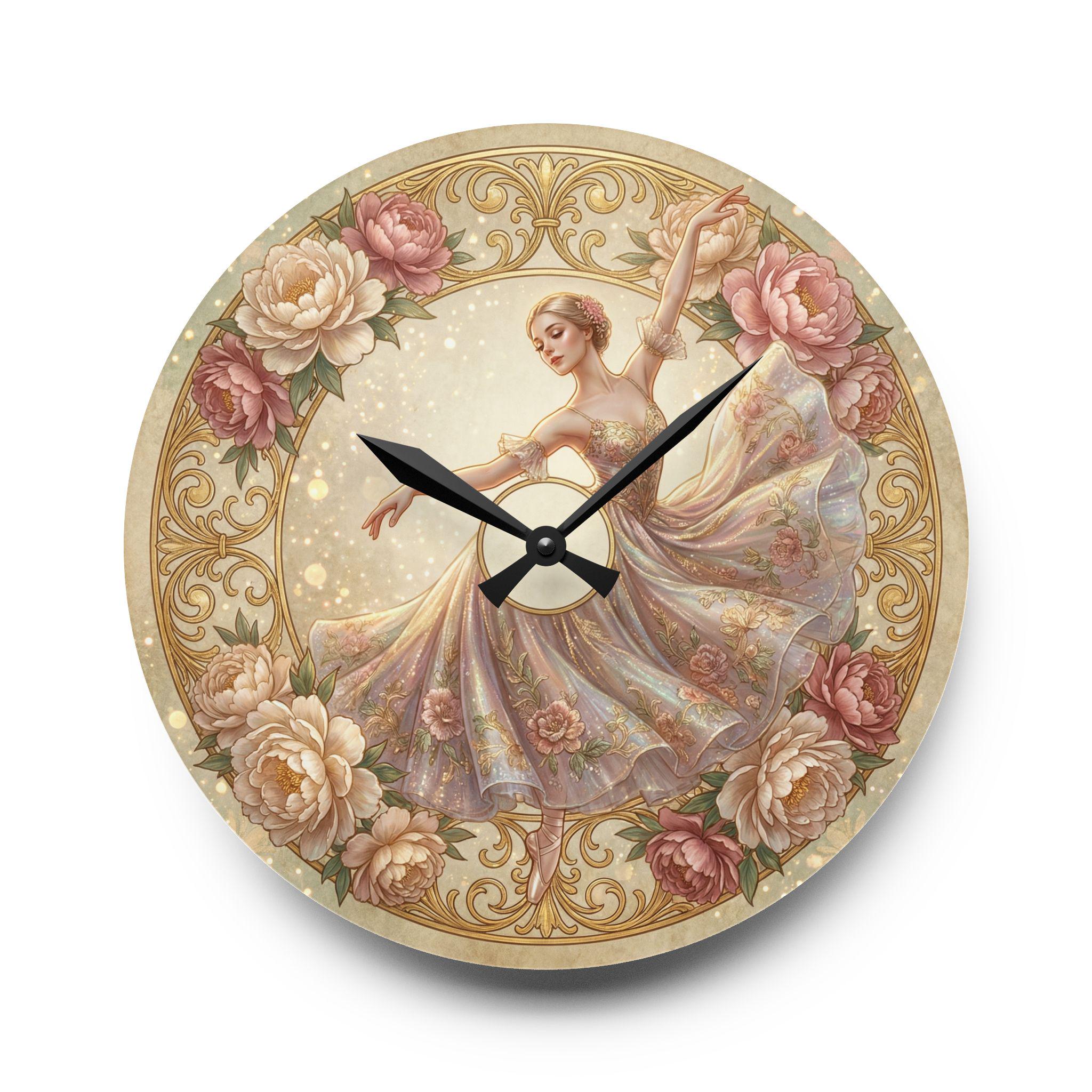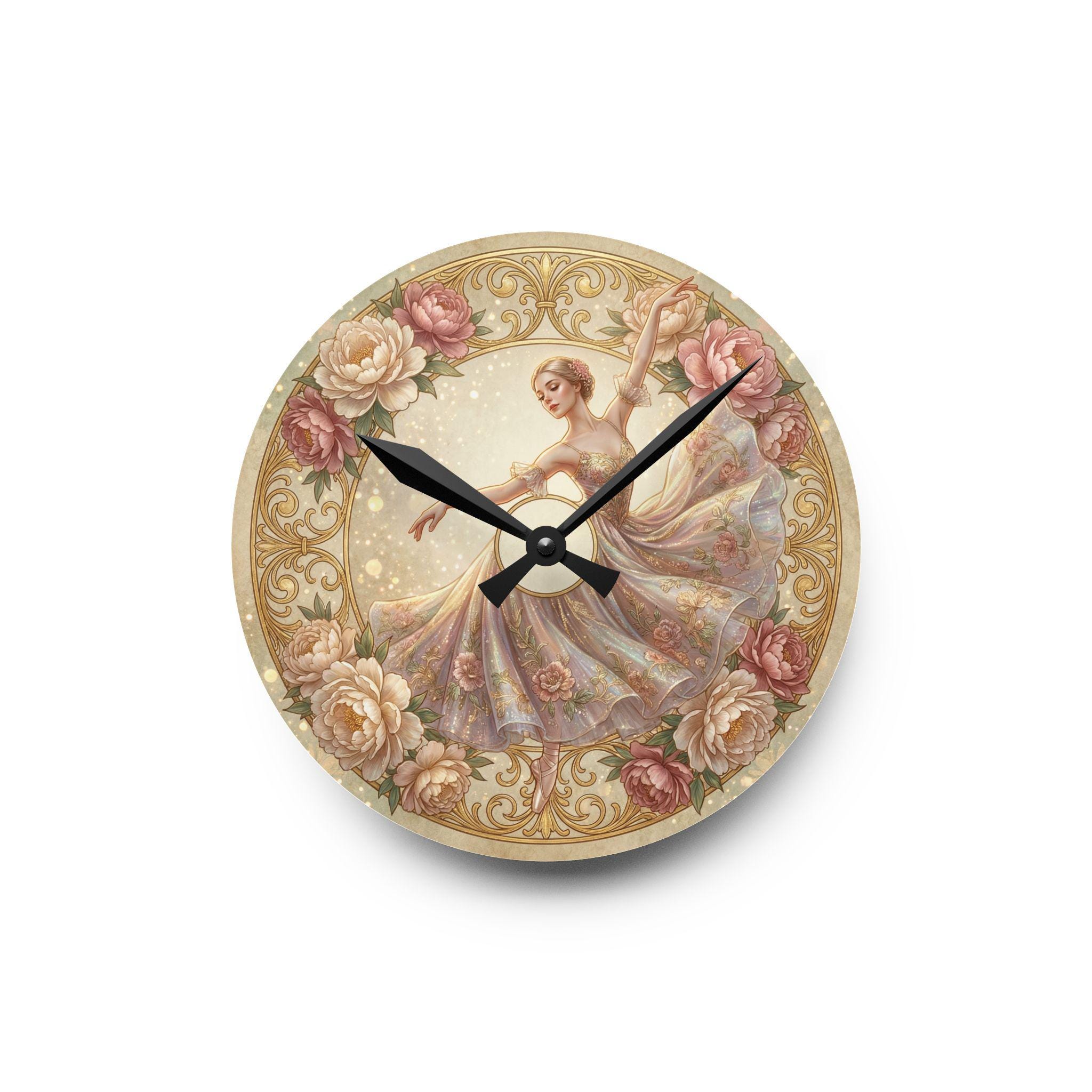 Soft, graceful, and quietly ornamental — this acrylic wall clock brings a vintage ballet motif into everyday moments. A dreamy ballerina floats across a background of roses and ornate filigree, rendered in warm, antique tones that age like a treasured print. The clock’s glossy acrylic face keeps colors vivid while remaining lightweight on the wall. Hang it above a dressing table, in a nursery, or in a cozy reading nook to add a whisper of nostalgia and gentle motion to the room. The silent sweep of the hands lets the artwork stay the focus while time passes with calm and elegance.