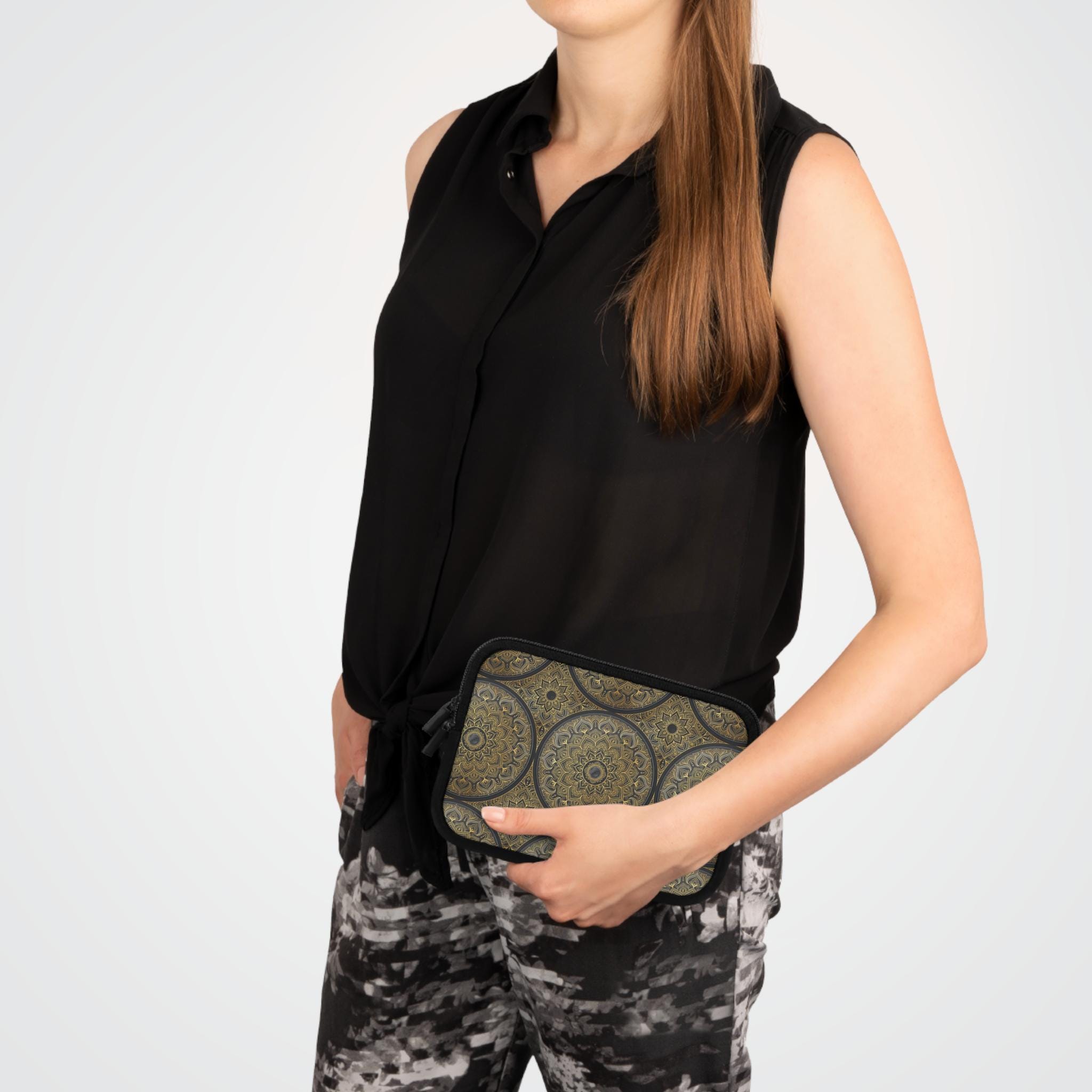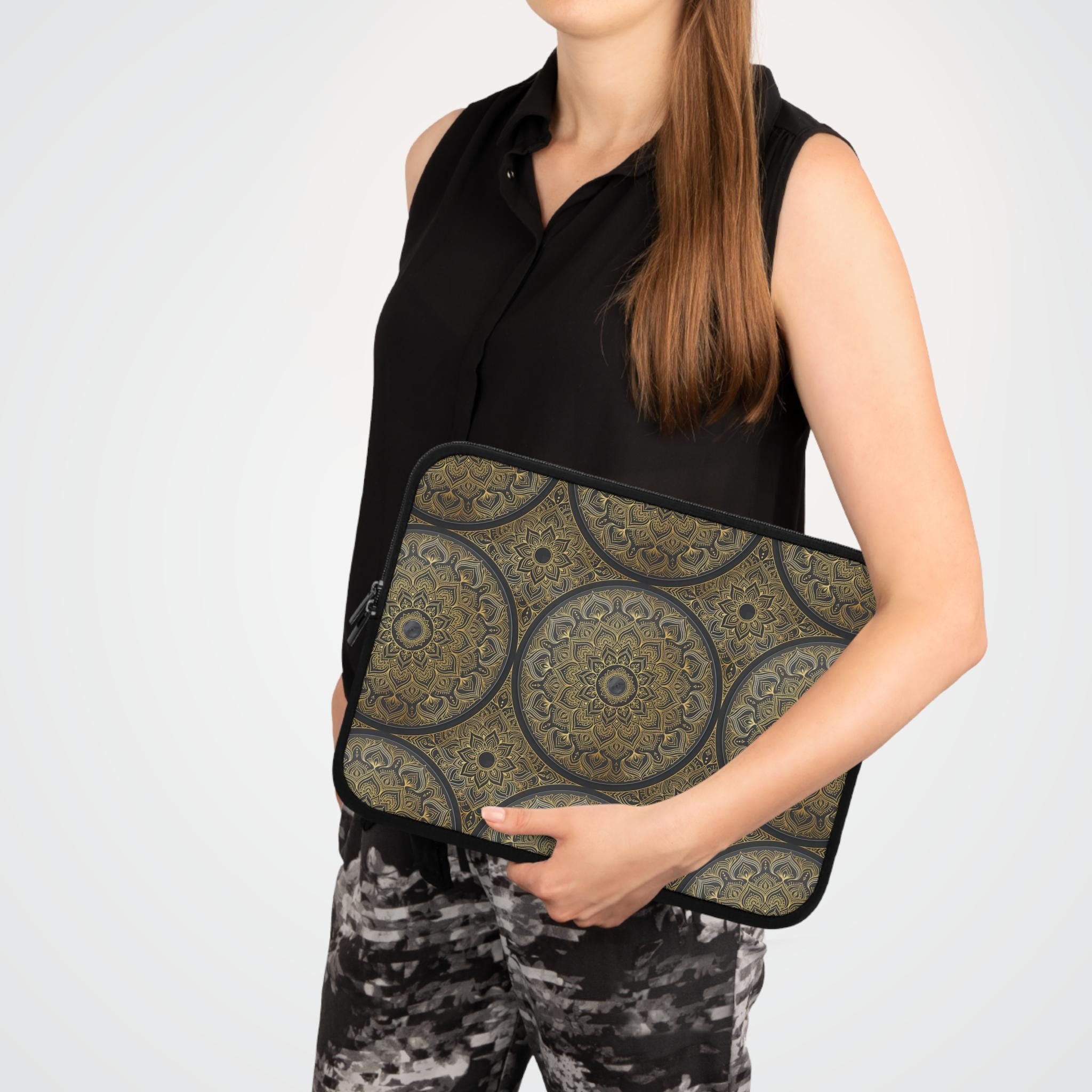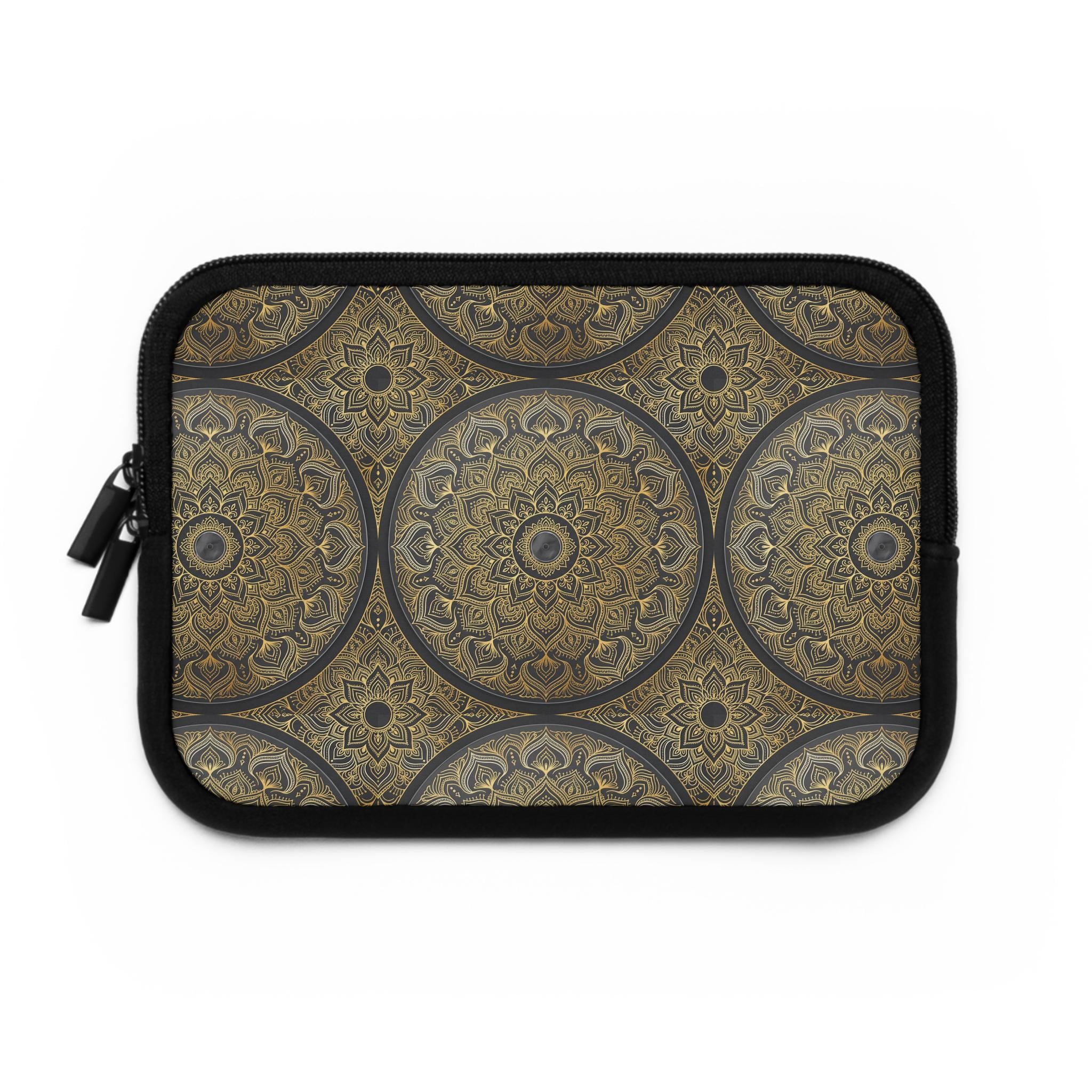 This Laptop Sleeve carries the intricate spirit of Mughal mehndi—delicate floral vines and paisley swirls rendered with thoughtful detail. The design feels like a quiet-minute ritual: tracing patterns with a fingertip, settling into focus before the day begins. Slim and light, the sleeve slips easily into a bag and becomes the small everyday ceremony that protects your device while reflecting a love for ornamental craftsmanship. For someone who carries both work and tradition, the floral motif reads personal and intentional. It’s a comfortable, confident layer between your laptop and the world—water-resistant, softly padded, and built to travel with you to cafés, studios, and long commutes while keeping the design front-and-center against a solid black back.