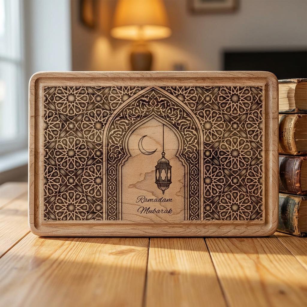 This engraved wooden cutting board brings a quiet, reverent beauty to Ramadan gatherings. The Mughal-inspired Islamic art engraving traces elegant floral arabesques and balanced geometric patterns across rich walnut or maple, catching the light like a mosque at dusk. It’s tactile — smooth edges, a warm, natural grain you can feel under your palm — and it settles into the rhythm of a kitchen preparing dates, soups, and shared plates. For people who observe Ramadan and those who cherish culturally resonant tableware, this board moves beyond function: it marks the table with cultural memory and calm. Choose the shape that fits your serving style, keep it tended with gentle hand washing, and let the engraved motif anchor moments of hospitality during iftar and quiet morning reflection.