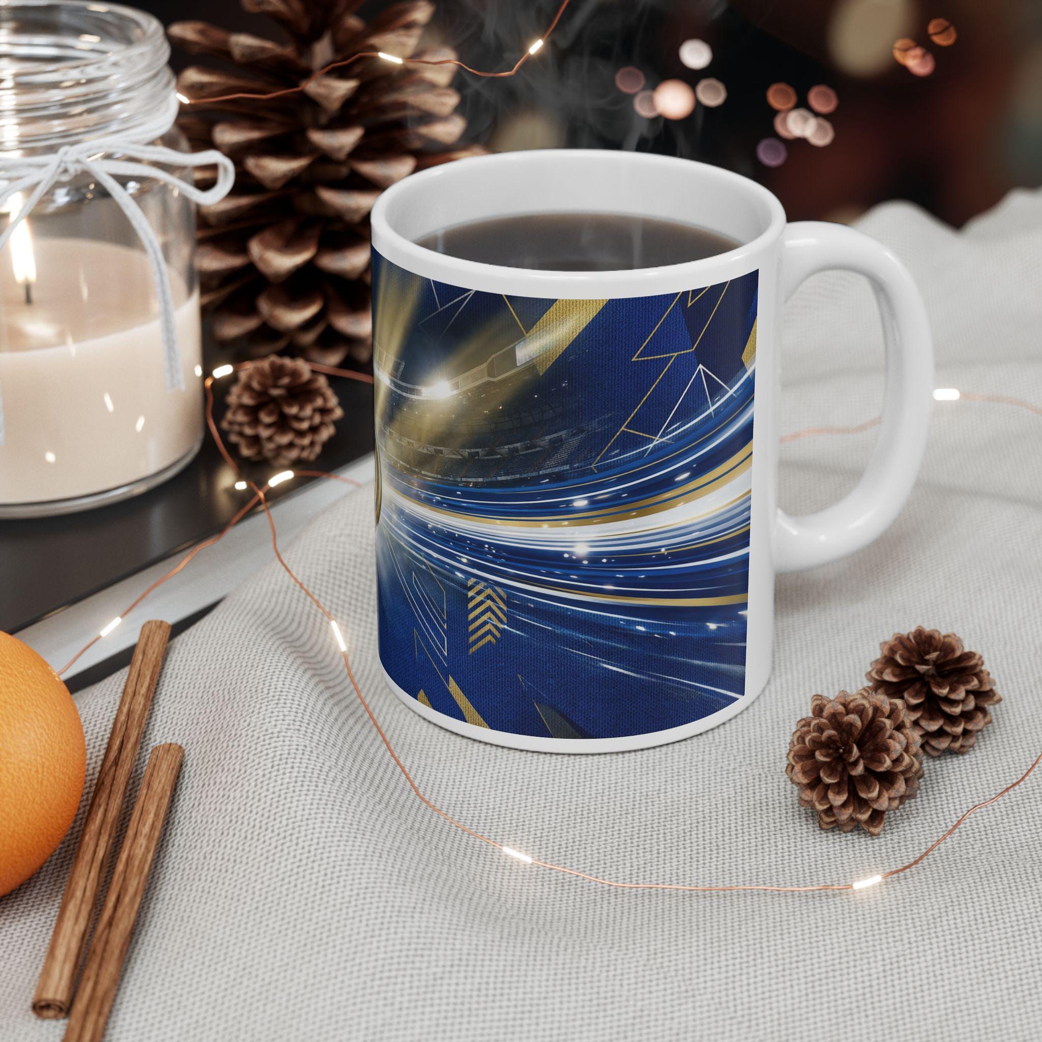 This glossy ceramic mug brings matchday energy to your kitchen. Rich navy and gold graphics wrap around the mug, centering on a bold heraldic crest that catches the eye. Morning routines become a small ritual — steam rising, color and light reflected off the shiny finish. It feels sturdy in hand with a comfortable C-handle and a balanced weight that suits both quick coffee runs and slow, thoughtful sips. Available in two sizes to fit your preferred pour, the durable white ceramic keeps prints vivid through everyday use, and the microwave- and dishwasher-safe construction makes it easy to live with. Lead- and BPA-free for peace of mind, it’s designed to stand out on your shelf and hold up to daily life.