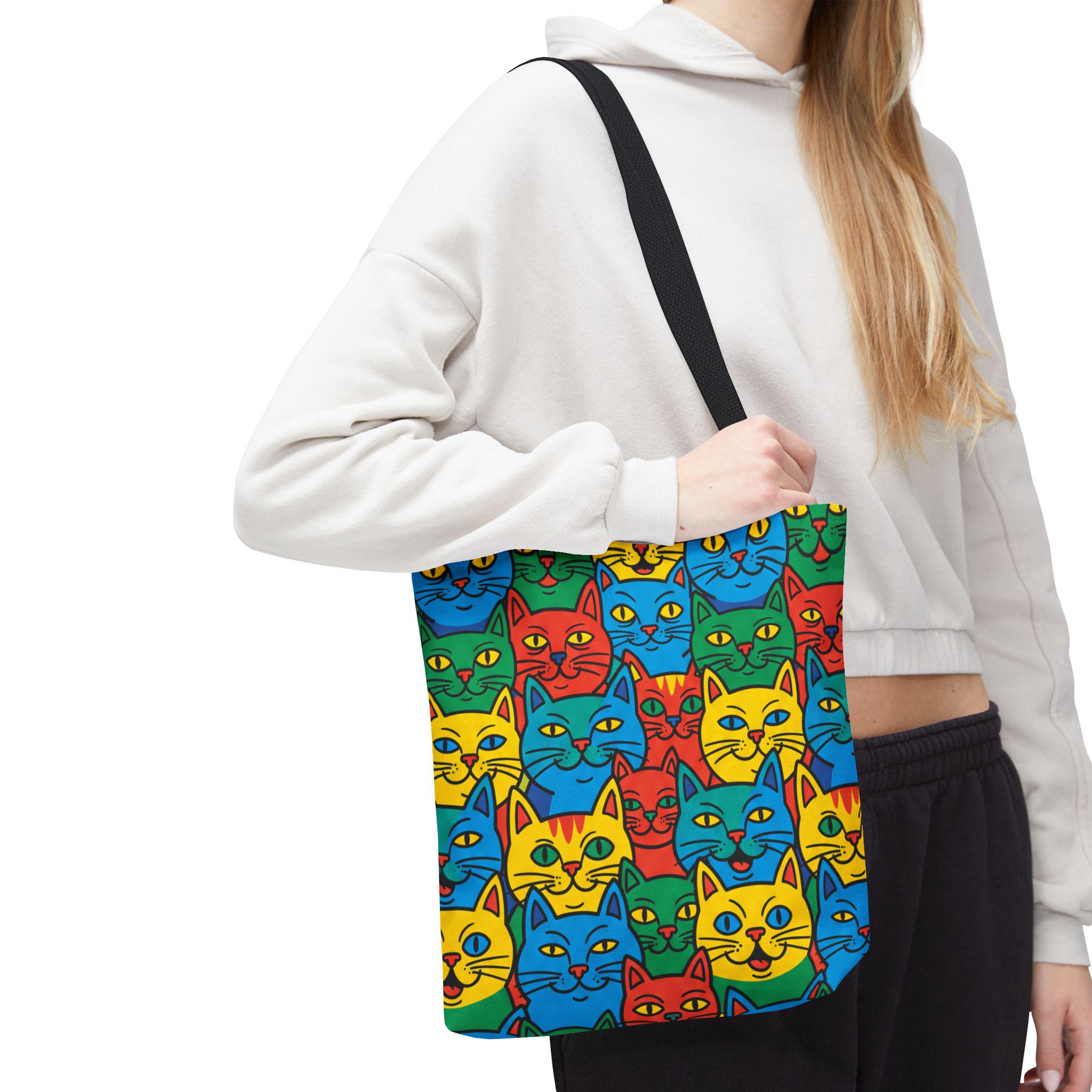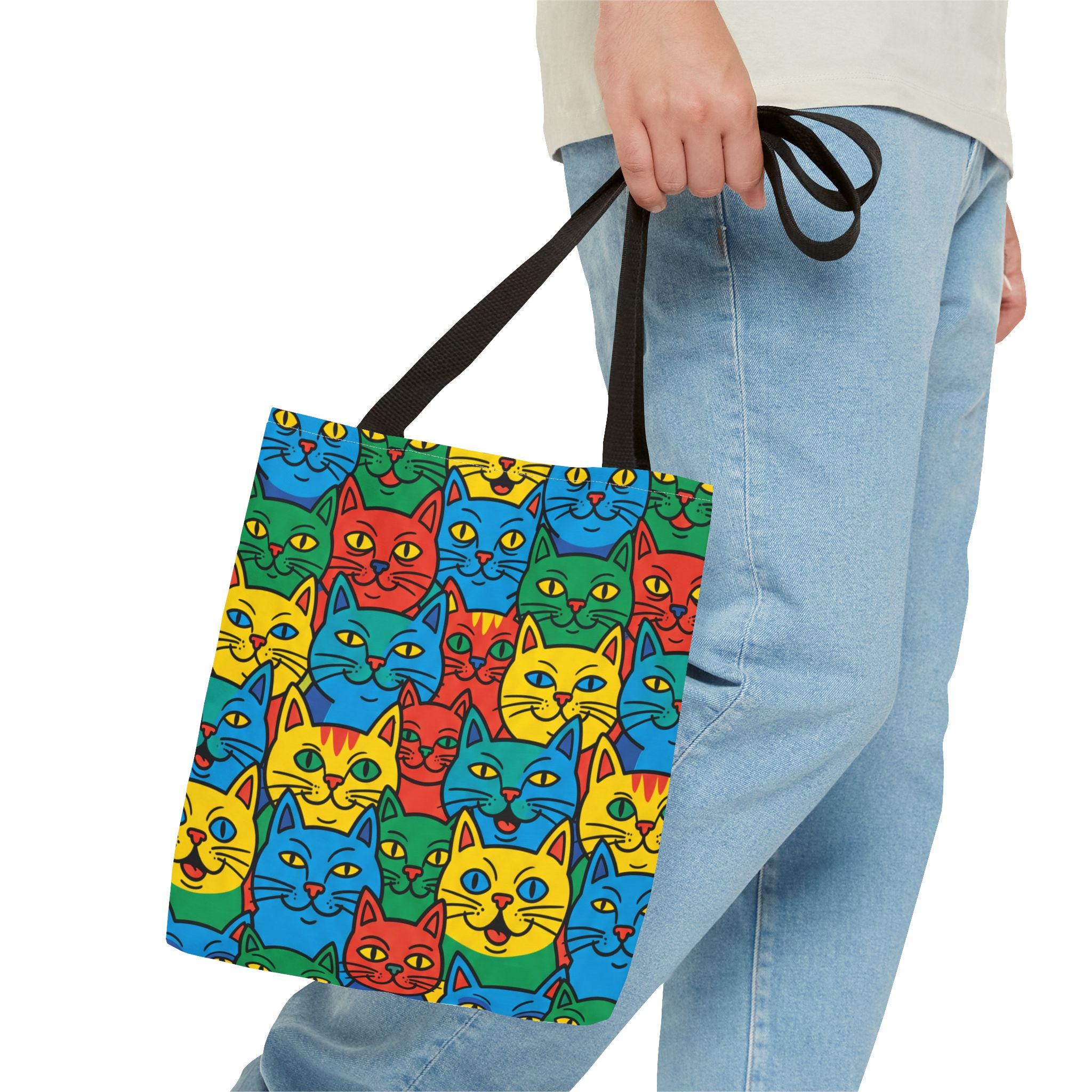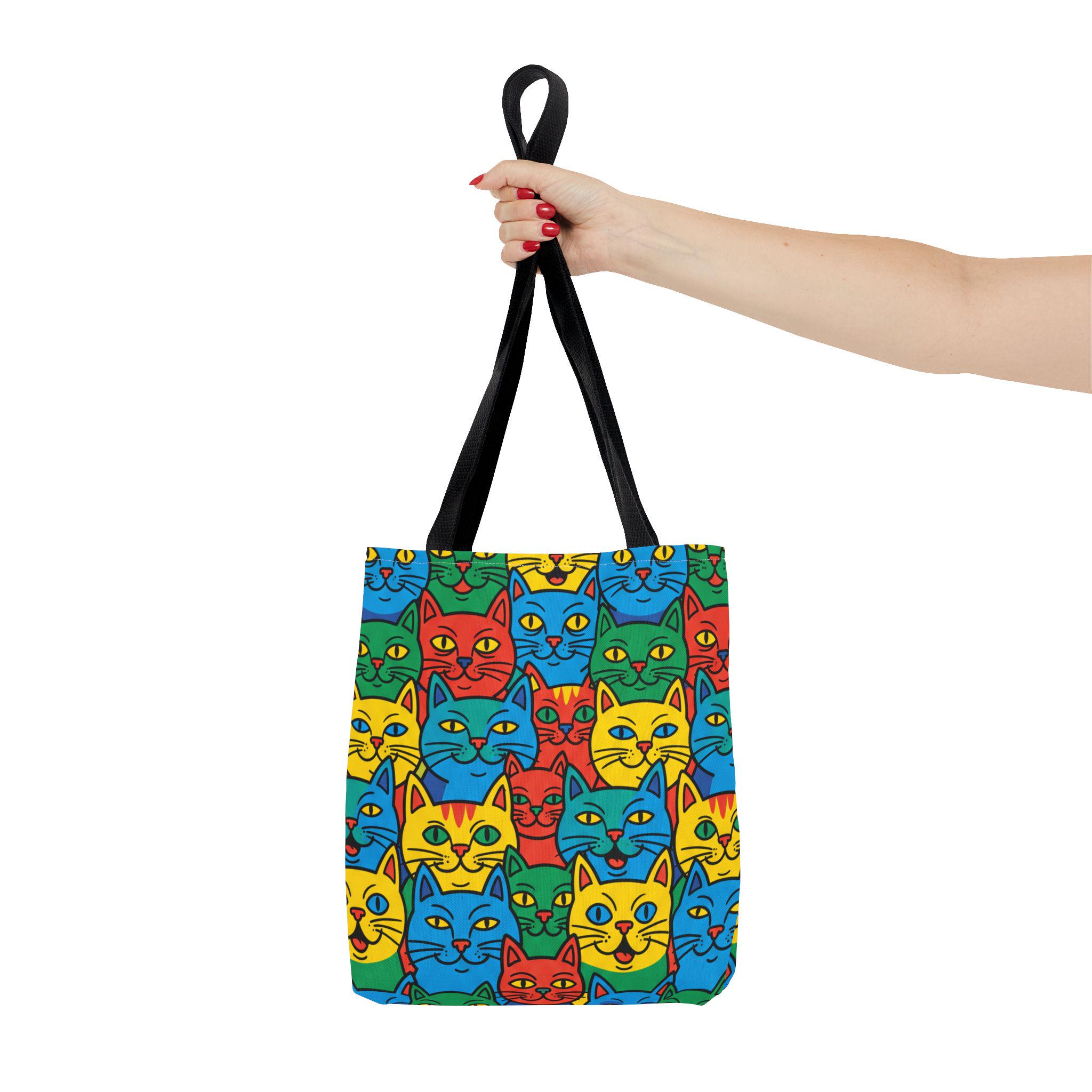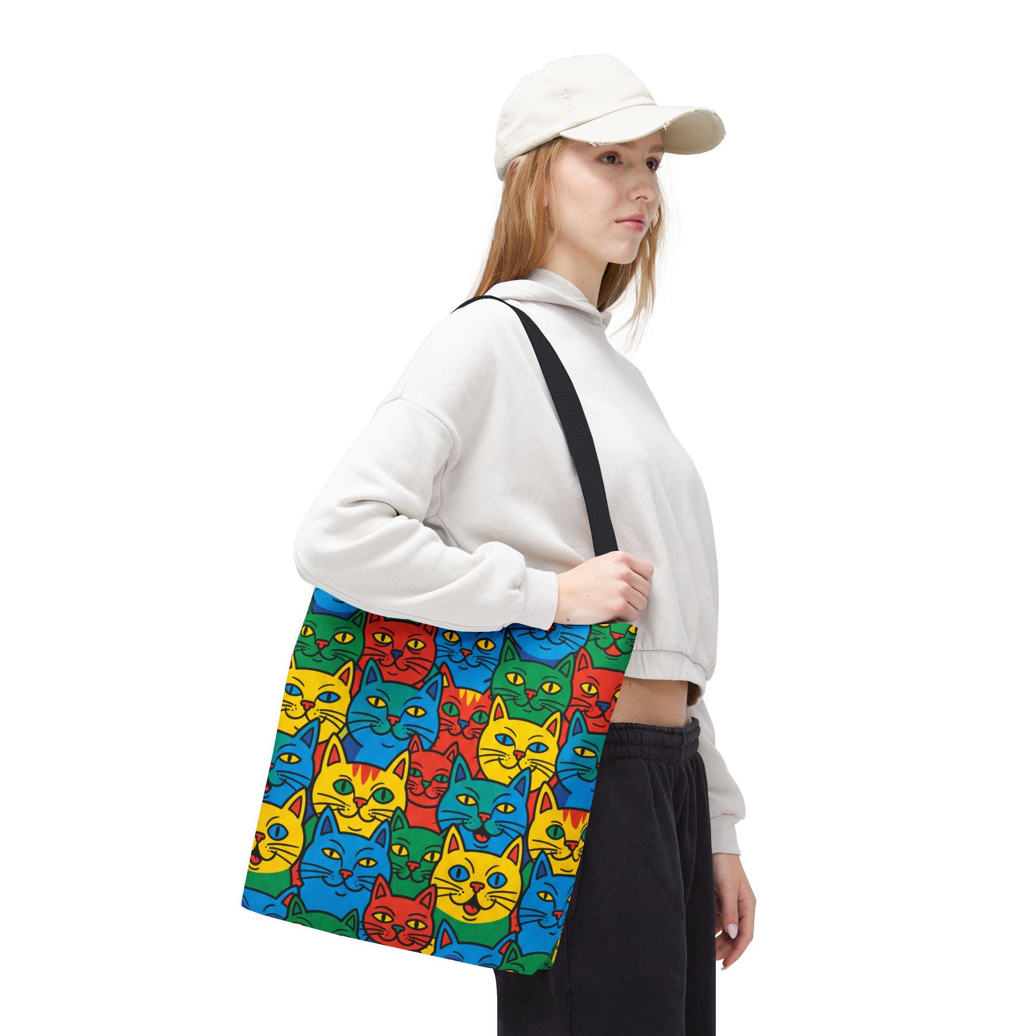 Bright, playful, and made to carry joy, this tote brings a neighborhood of colorful cat faces with you wherever you go. The cheerful pop-art pattern folds into daily life — grocery runs, library trips, or an afternoon at the farmer’s market — and adds a spark to mundane moments. Lightweight yet sturdy, the bag holds its shape and breathes confidence: boxed corners give extra room, reinforced stitch handles stand up to frequent use, and the laminated interior protects against spills. Choose a handle color to match your vibe and carry a little gallery of feline smiles that make errands feel like a small celebration.