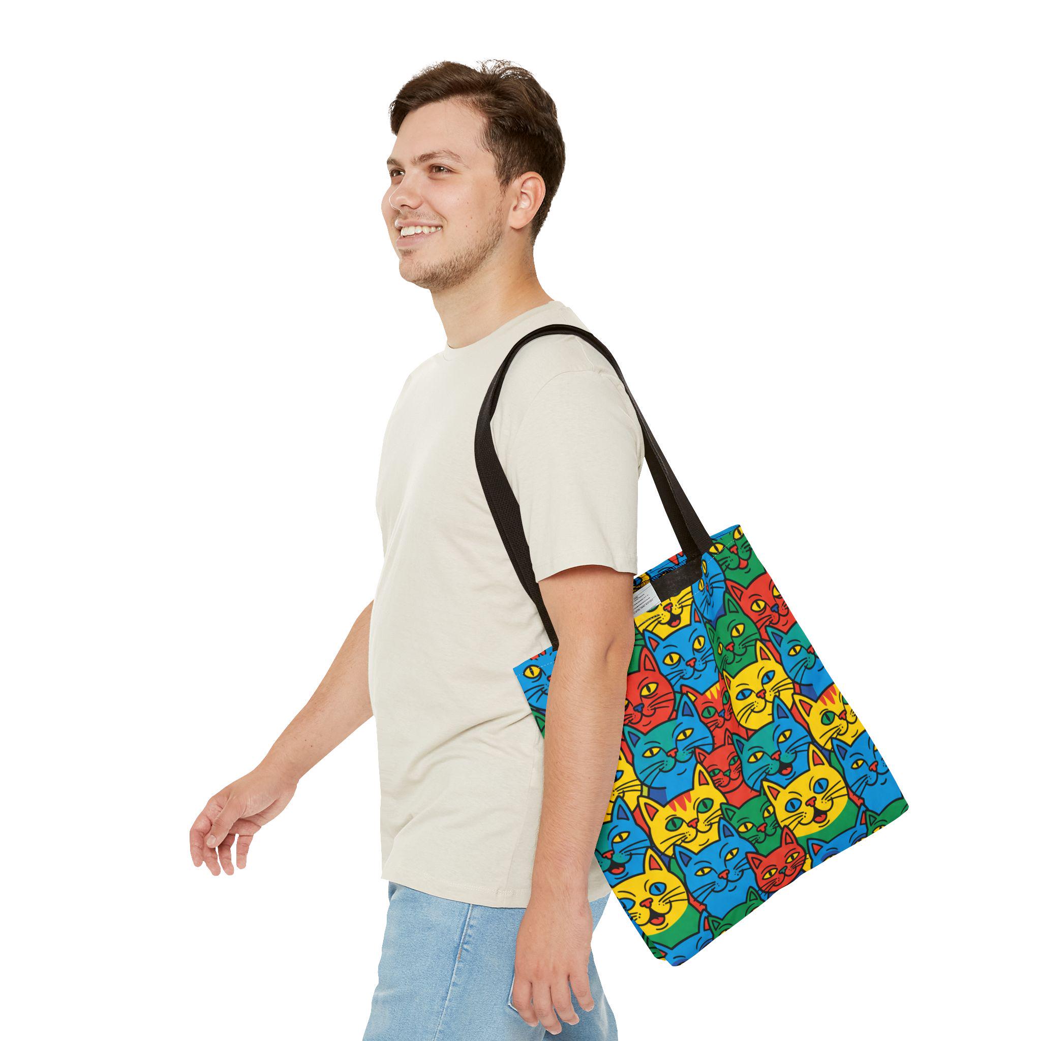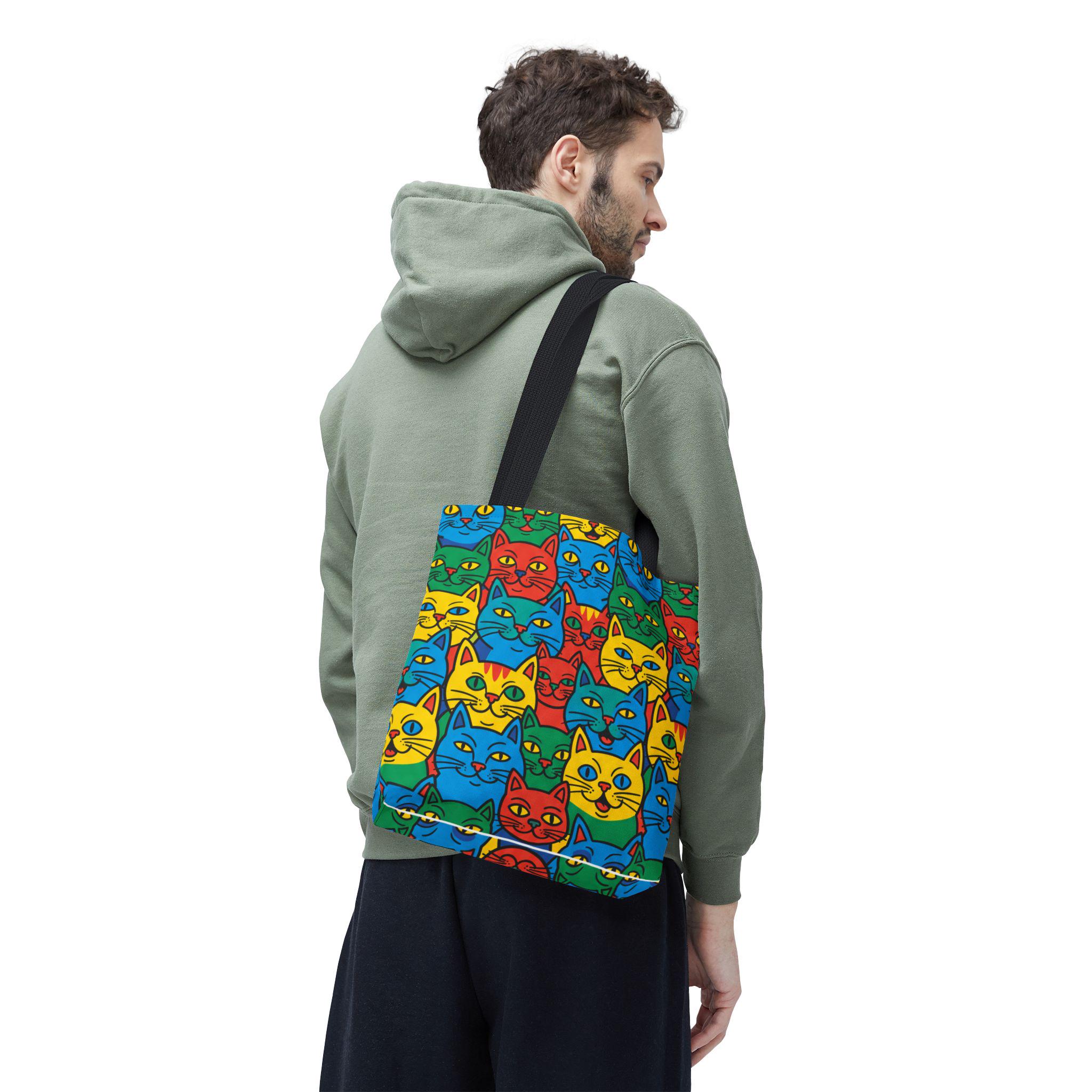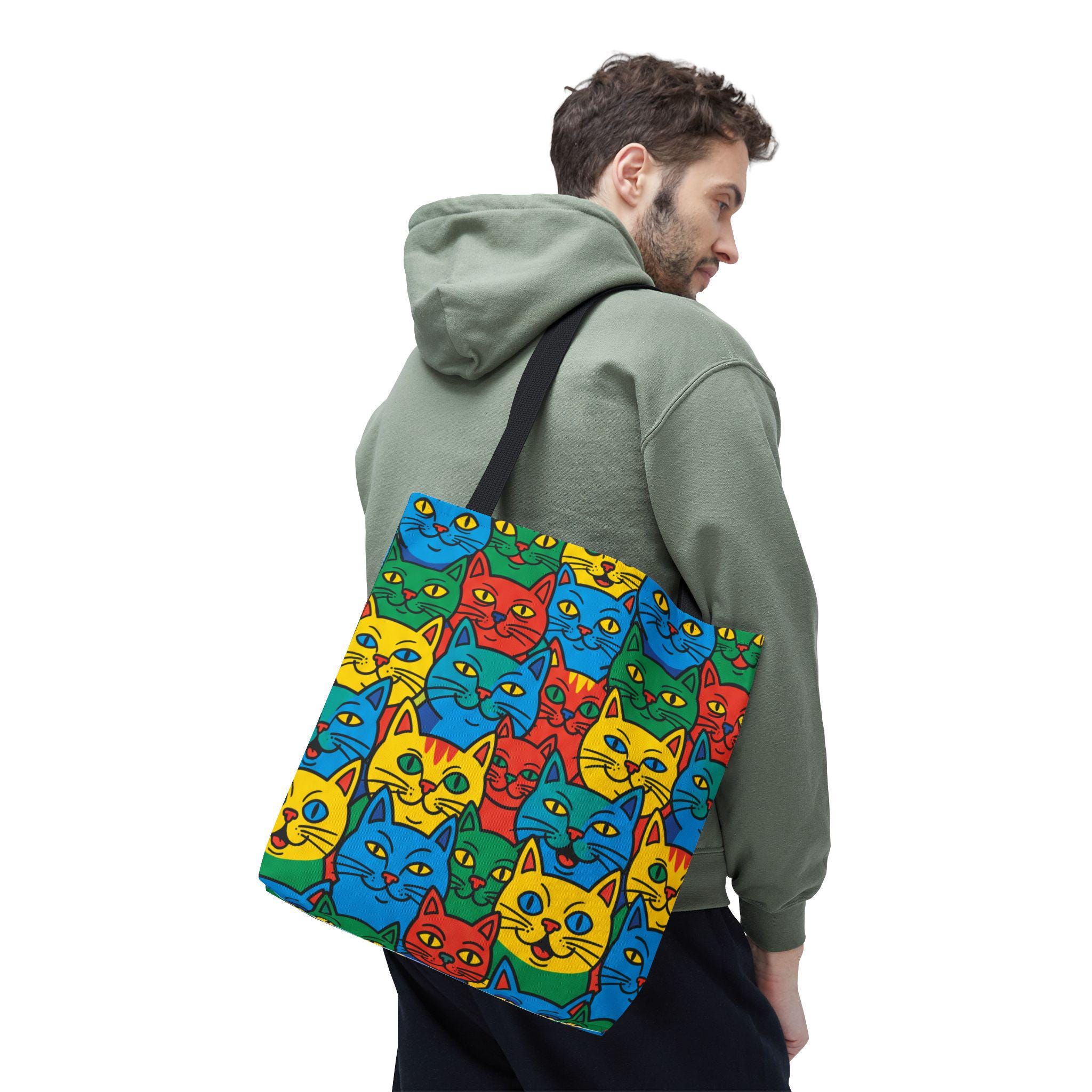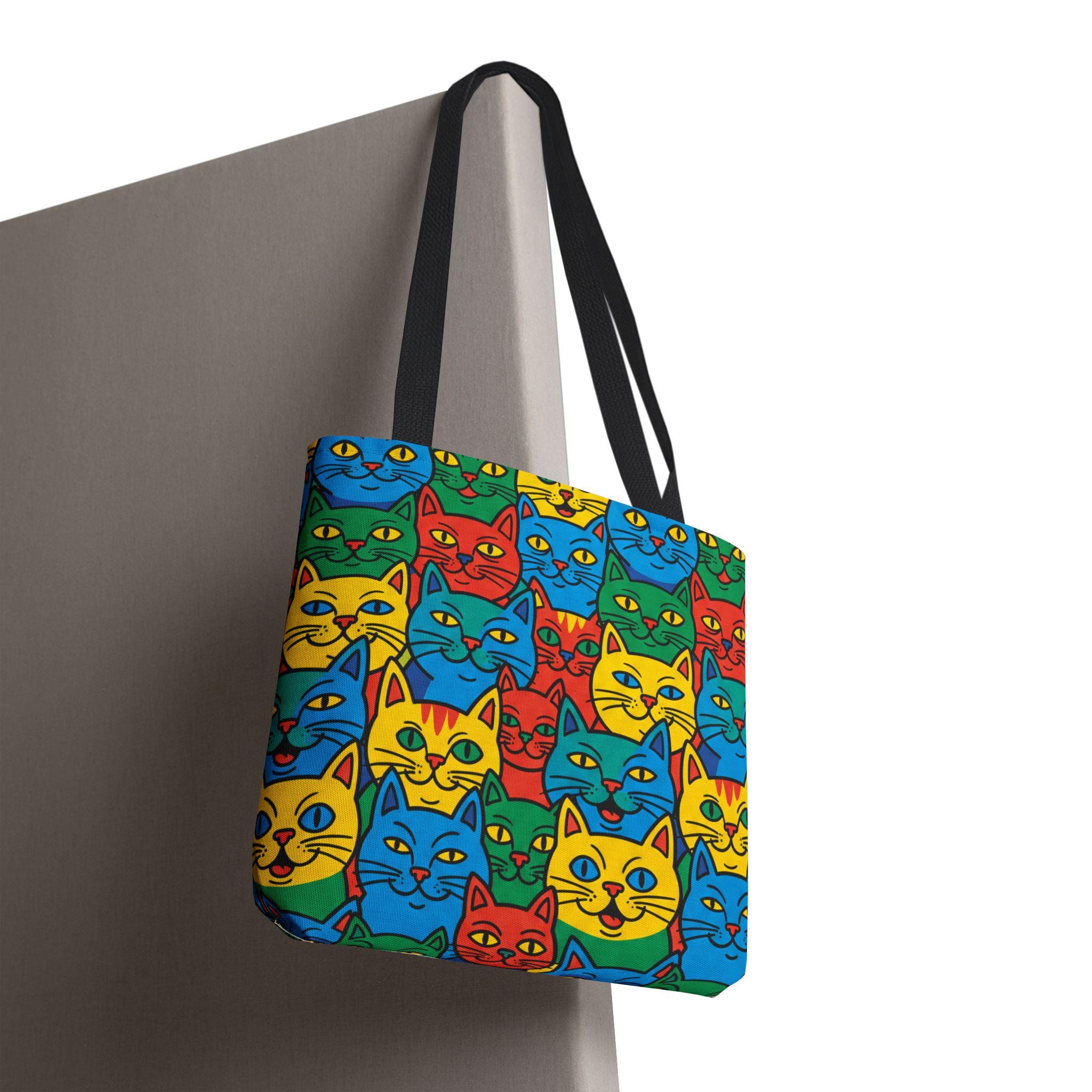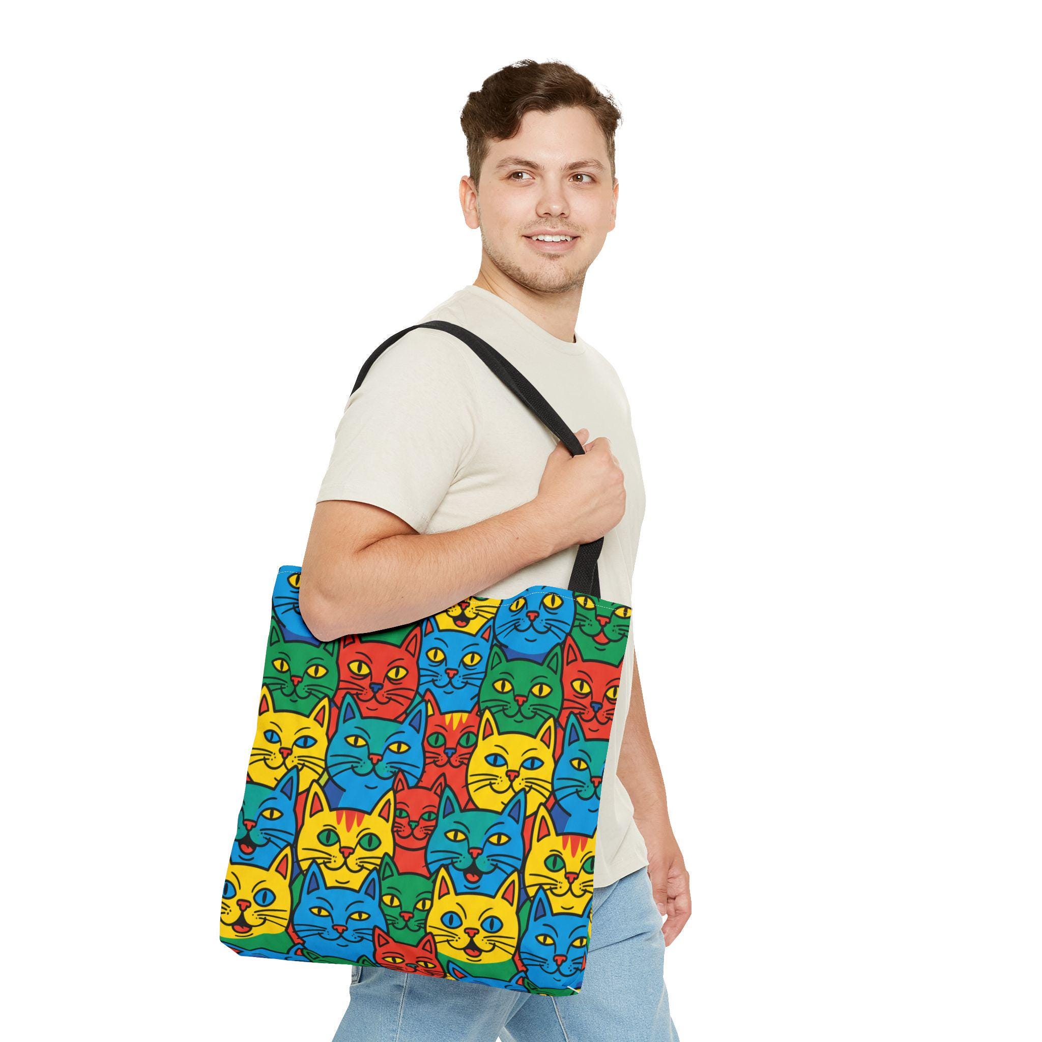 Bright, playful, and made to carry joy, this tote brings a neighborhood of colorful cat faces with you wherever you go. The cheerful pop-art pattern folds into daily life — grocery runs, library trips, or an afternoon at the farmer’s market — and adds a spark to mundane moments. Lightweight yet sturdy, the bag holds its shape and breathes confidence: boxed corners give extra room, reinforced stitch handles stand up to frequent use, and the laminated interior protects against spills. Choose a handle color to match your vibe and carry a little gallery of feline smiles that make errands feel like a small celebration.