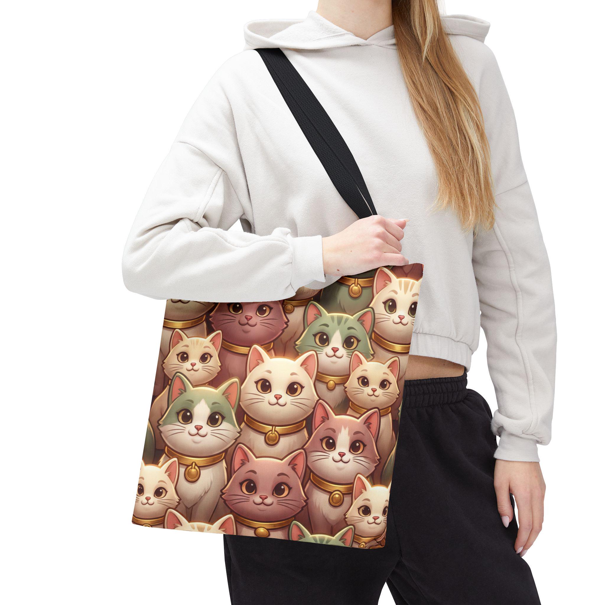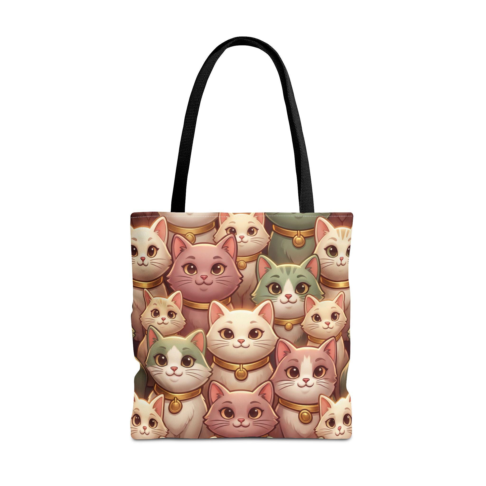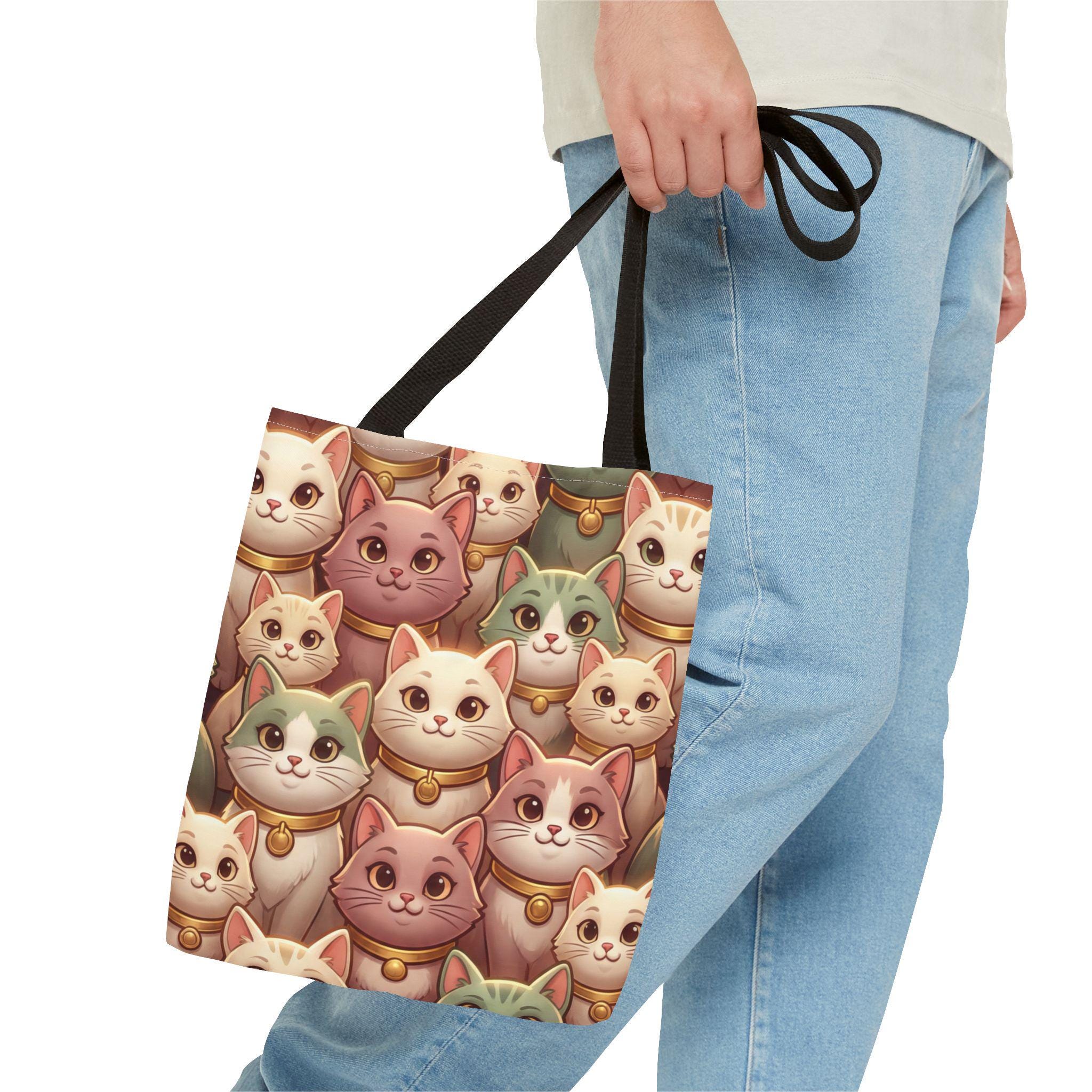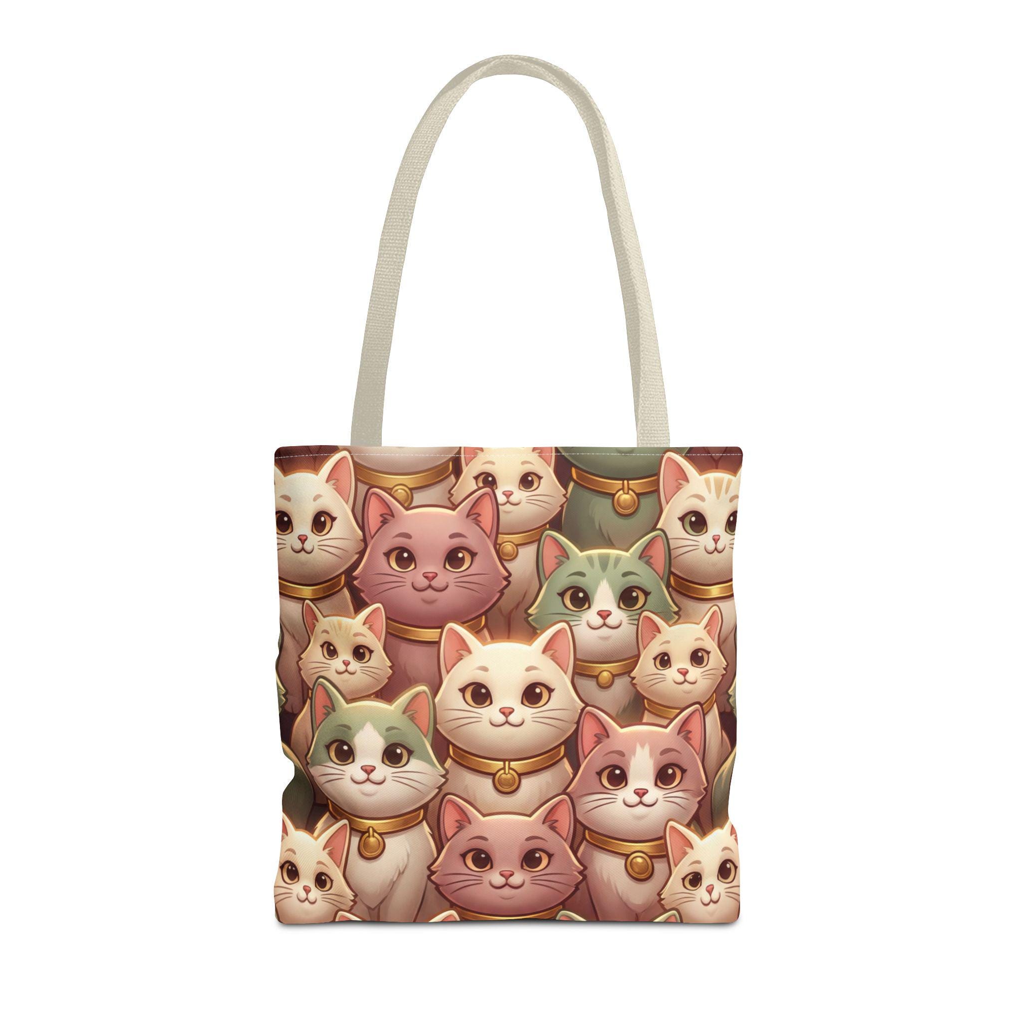 A cheerful, roomy tote printed edge-to-edge with a charming collage of pastel, bell-wearing cats. Lightweight but rugged, the polyester body holds its shape while the boxed corners give extra room for groceries, notebooks, or a small laptop. The black inner stitching and choice of five handle colors let you customize the look, while reinforced handle seams and a non-woven laminate interior keep everyday carry secure and tidy. Carry this tote on market mornings, casual outings, or when you simply want a warm, whimsical companion at your side.
