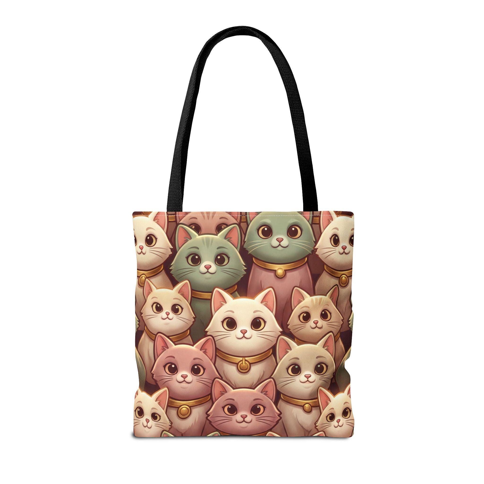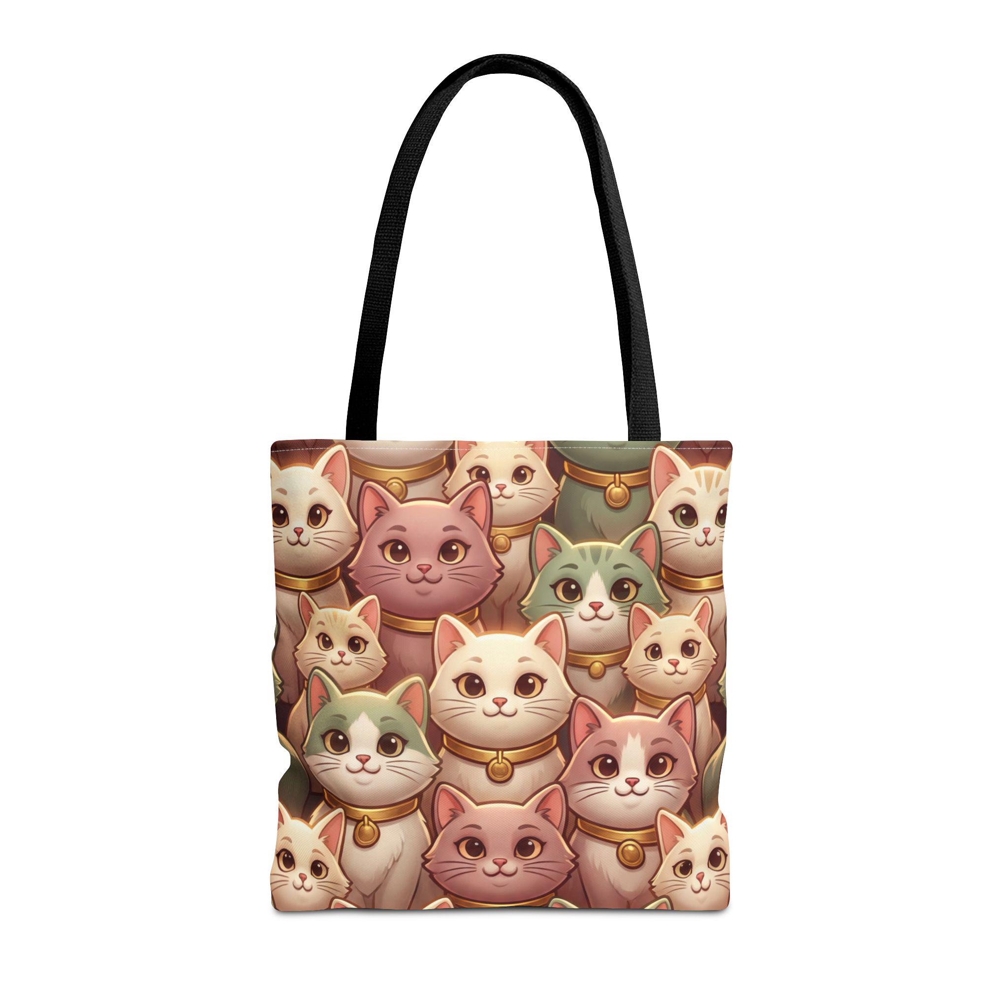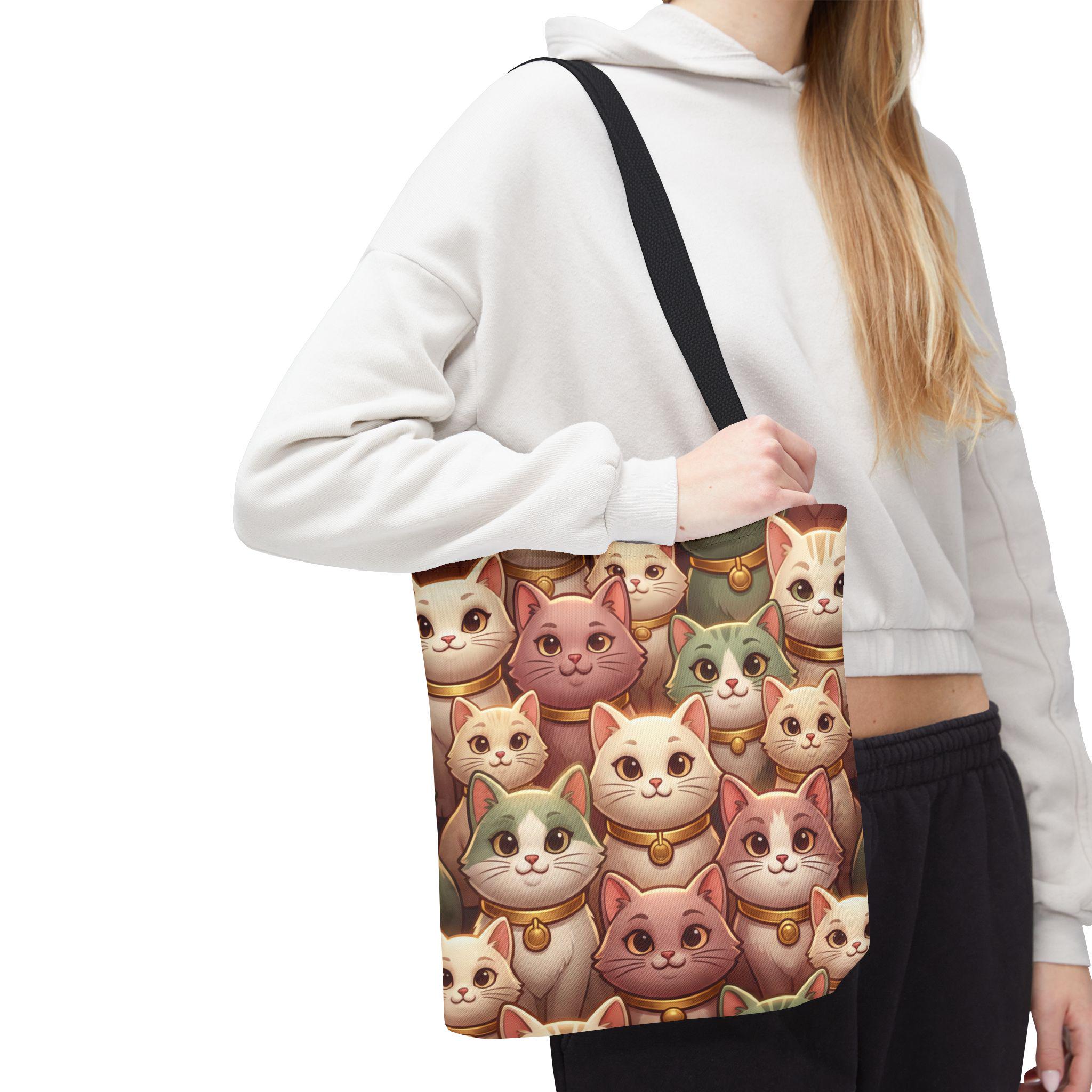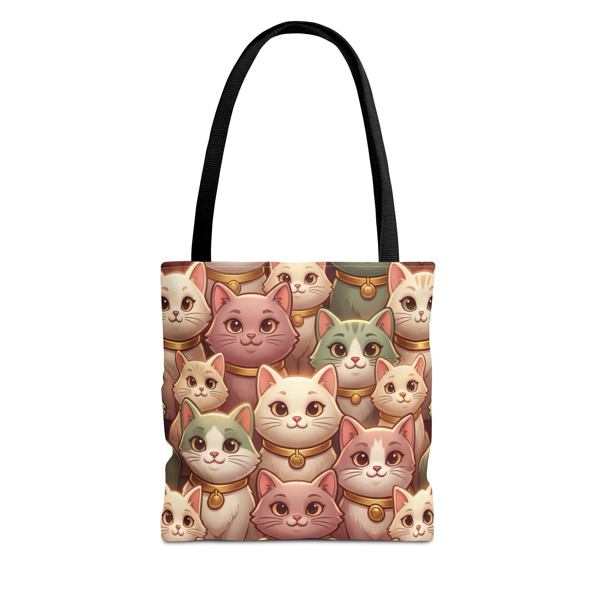 A cheerful, roomy tote printed edge-to-edge with a charming collage of pastel, bell-wearing cats. Lightweight but rugged, the polyester body holds its shape while the boxed corners give extra room for groceries, notebooks, or a small laptop. The black inner stitching and choice of five handle colors let you customize the look, while reinforced handle seams and a non-woven laminate interior keep everyday carry secure and tidy. Carry this tote on market mornings, casual outings, or when you simply want a warm, whimsical companion at your side.