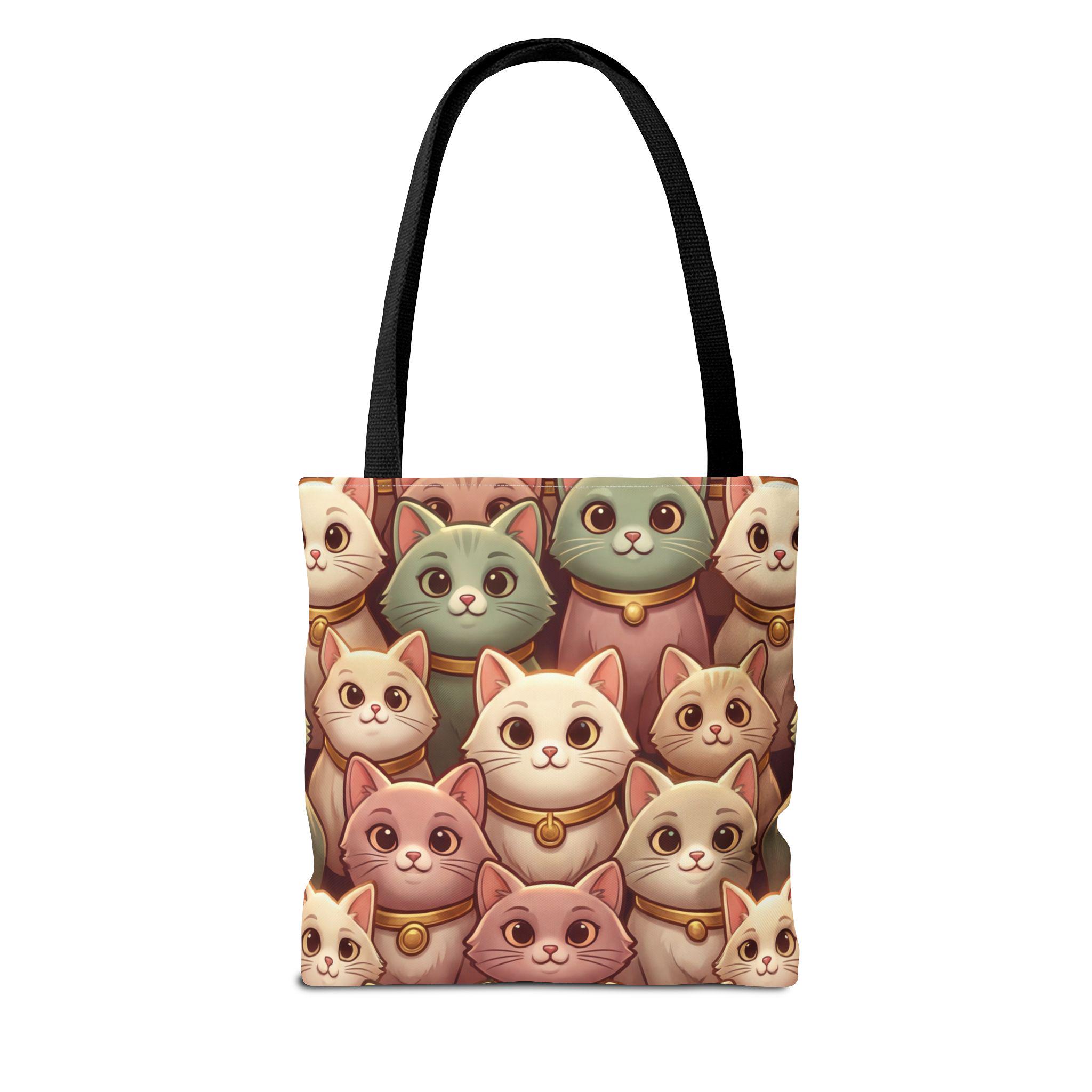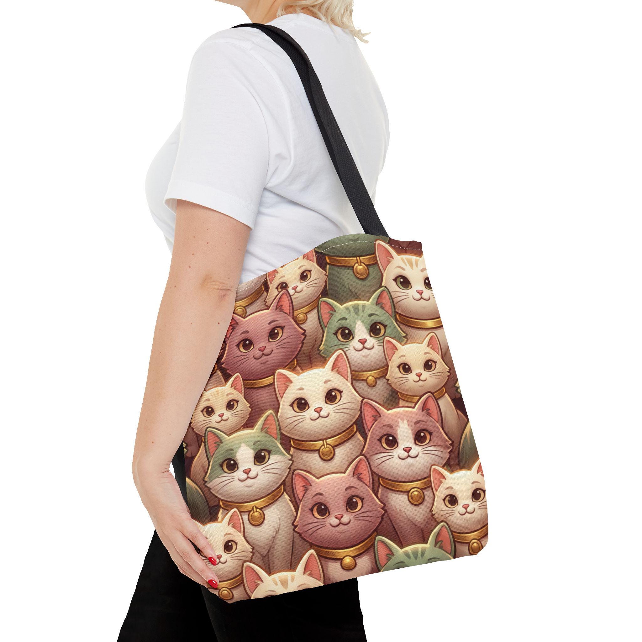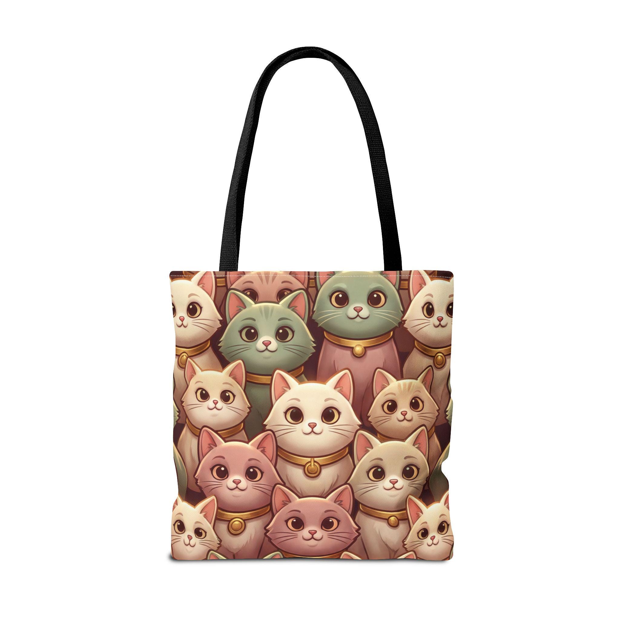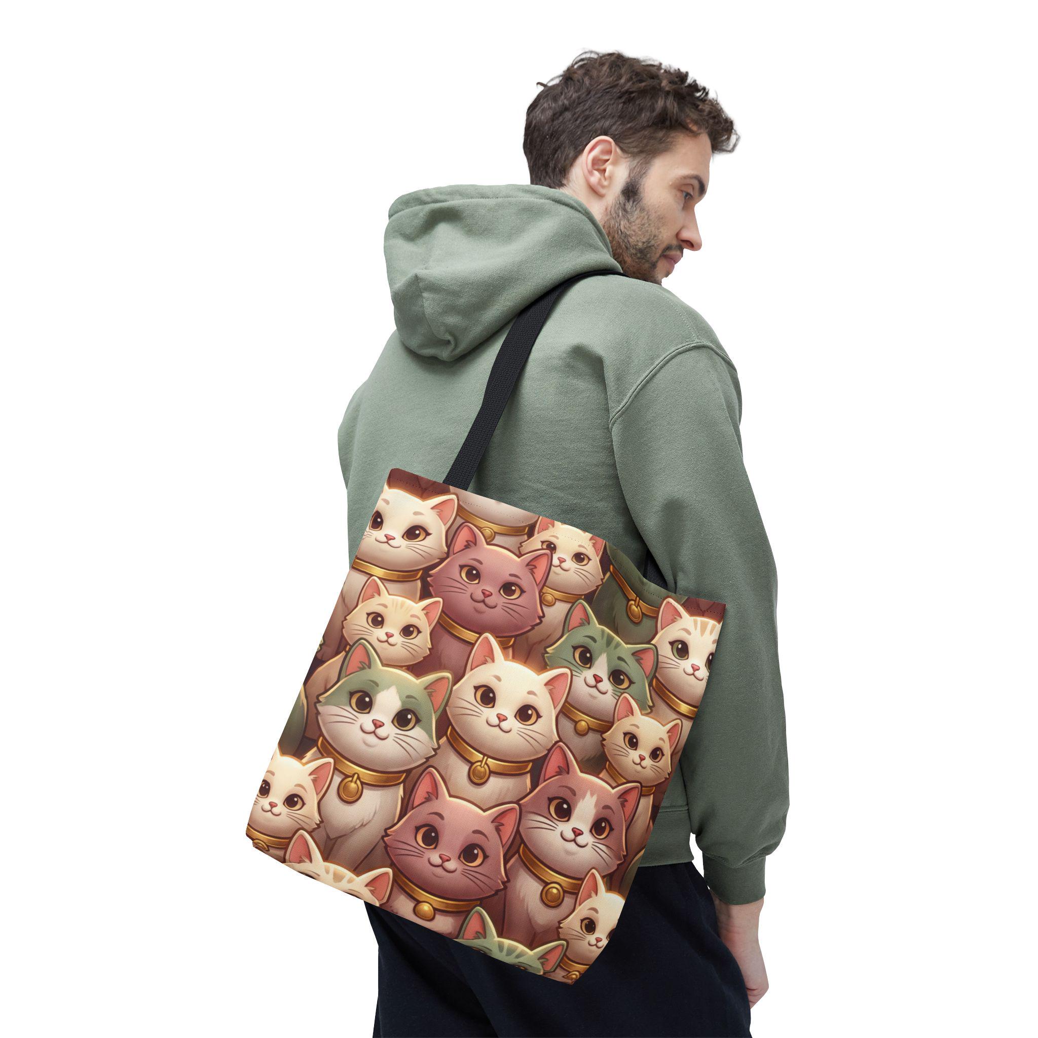A cheerful, roomy tote printed edge-to-edge with a charming collage of pastel, bell-wearing cats. Lightweight but rugged, the polyester body holds its shape while the boxed corners give extra room for groceries, notebooks, or a small laptop. The black inner stitching and choice of five handle colors let you customize the look, while reinforced handle seams and a non-woven laminate interior keep everyday carry secure and tidy. Carry this tote on market mornings, casual outings, or when you simply want a warm, whimsical companion at your side.