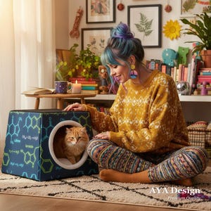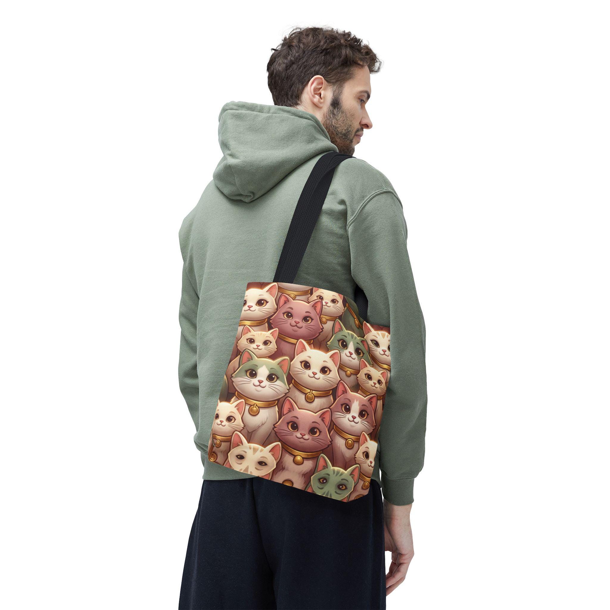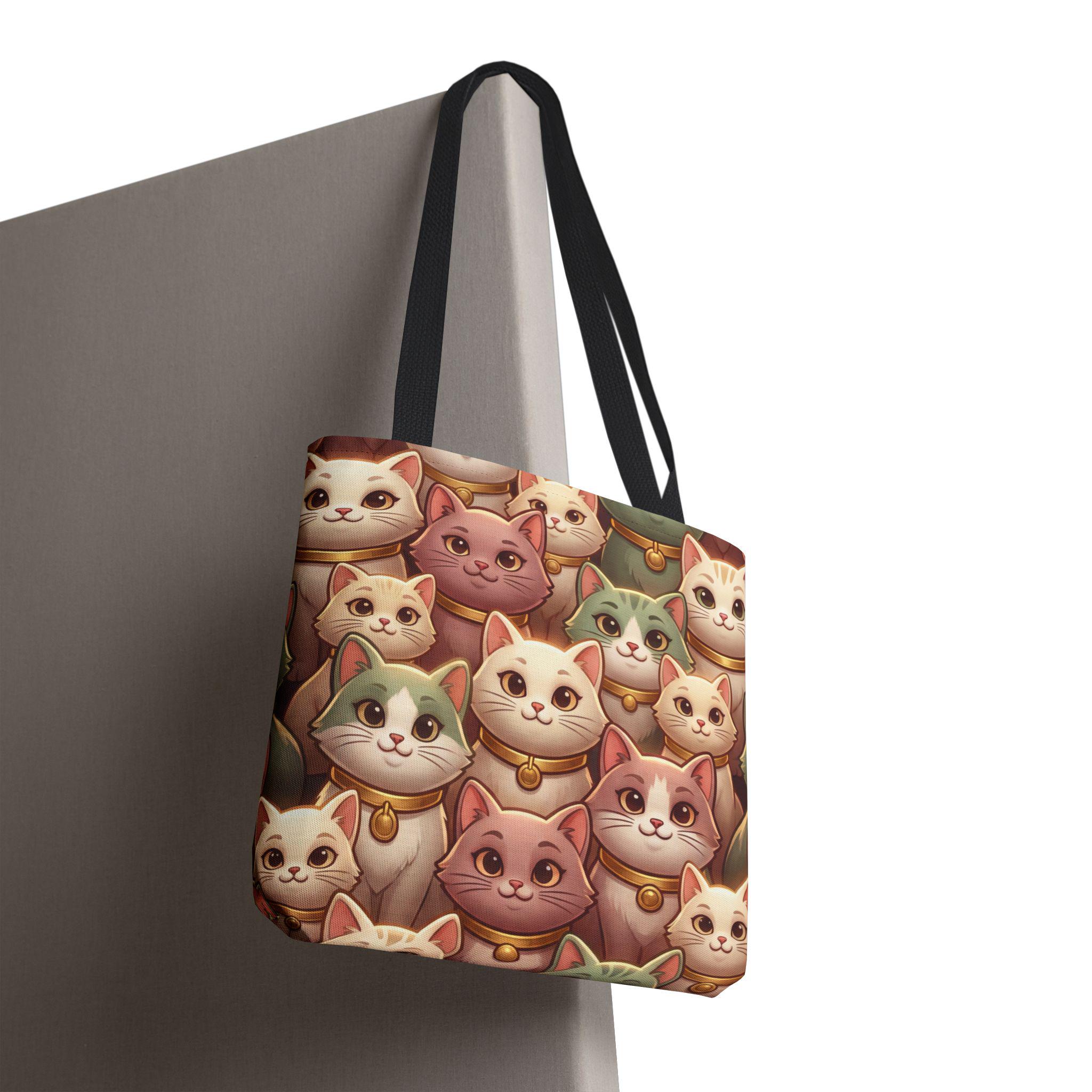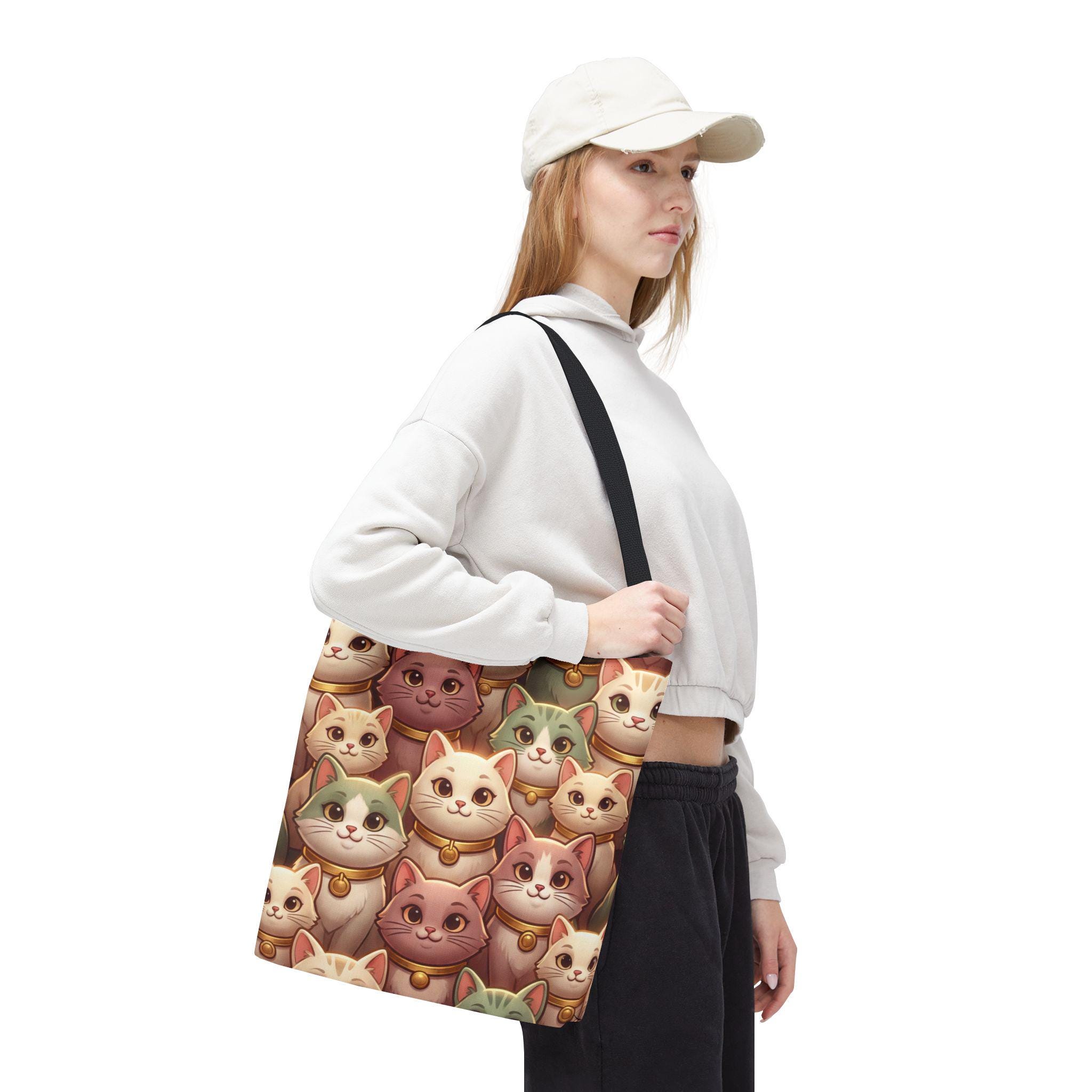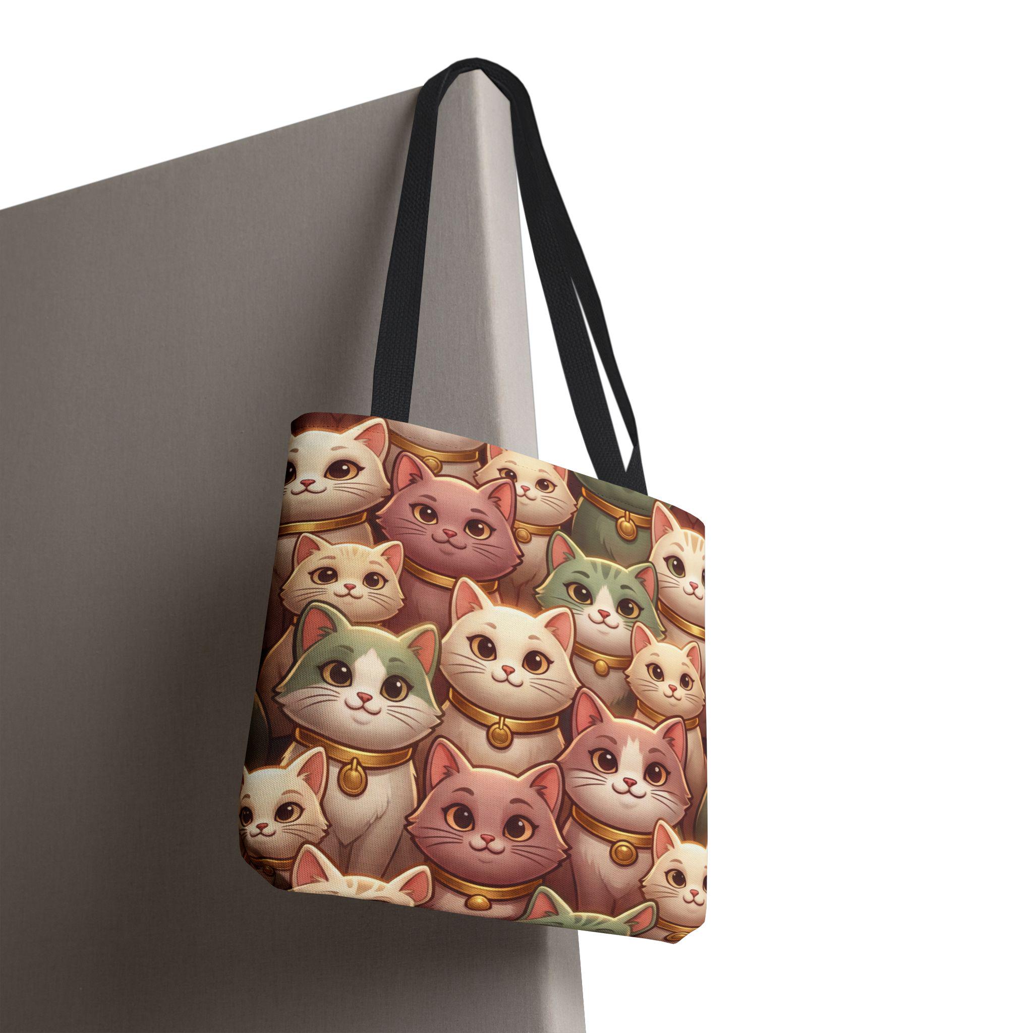A cheerful, roomy tote printed edge-to-edge with a charming collage of pastel, bell-wearing cats. Lightweight but rugged, the polyester body holds its shape while the boxed corners give extra room for groceries, notebooks, or a small laptop. The black inner stitching and choice of five handle colors let you customize the look, while reinforced handle seams and a non-woven laminate interior keep everyday carry secure and tidy. Carry this tote on market mornings, casual outings, or when you simply want a warm, whimsical companion at your side.