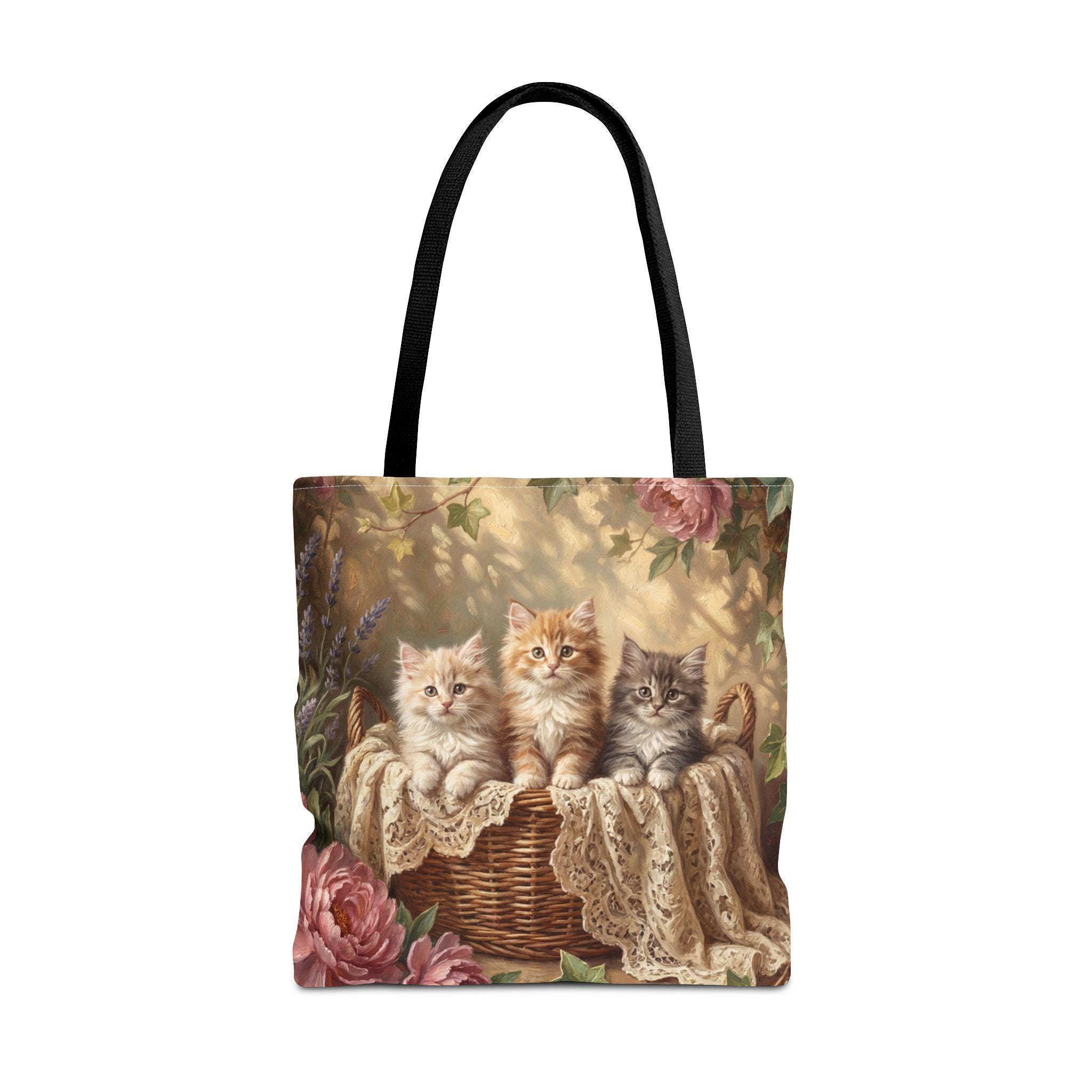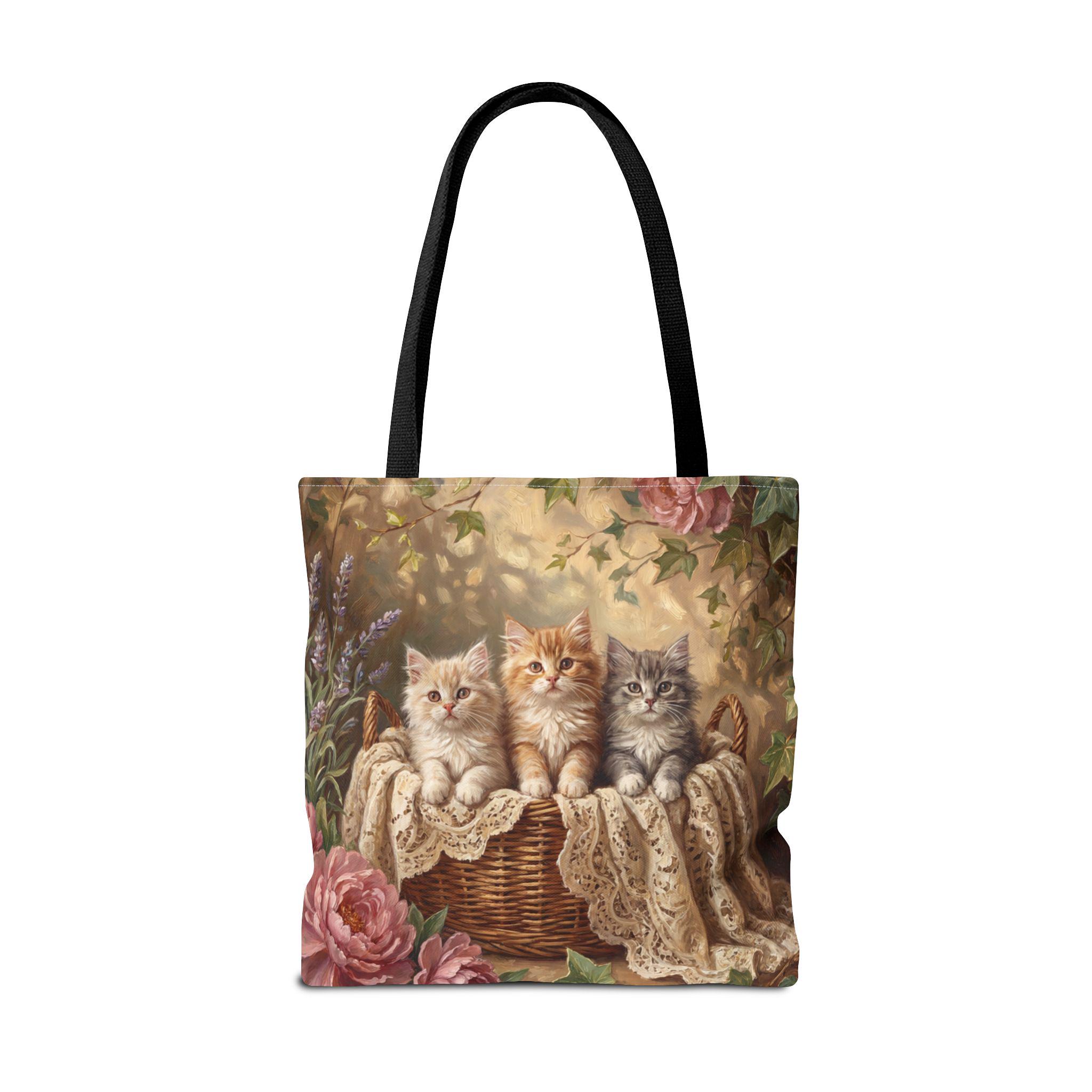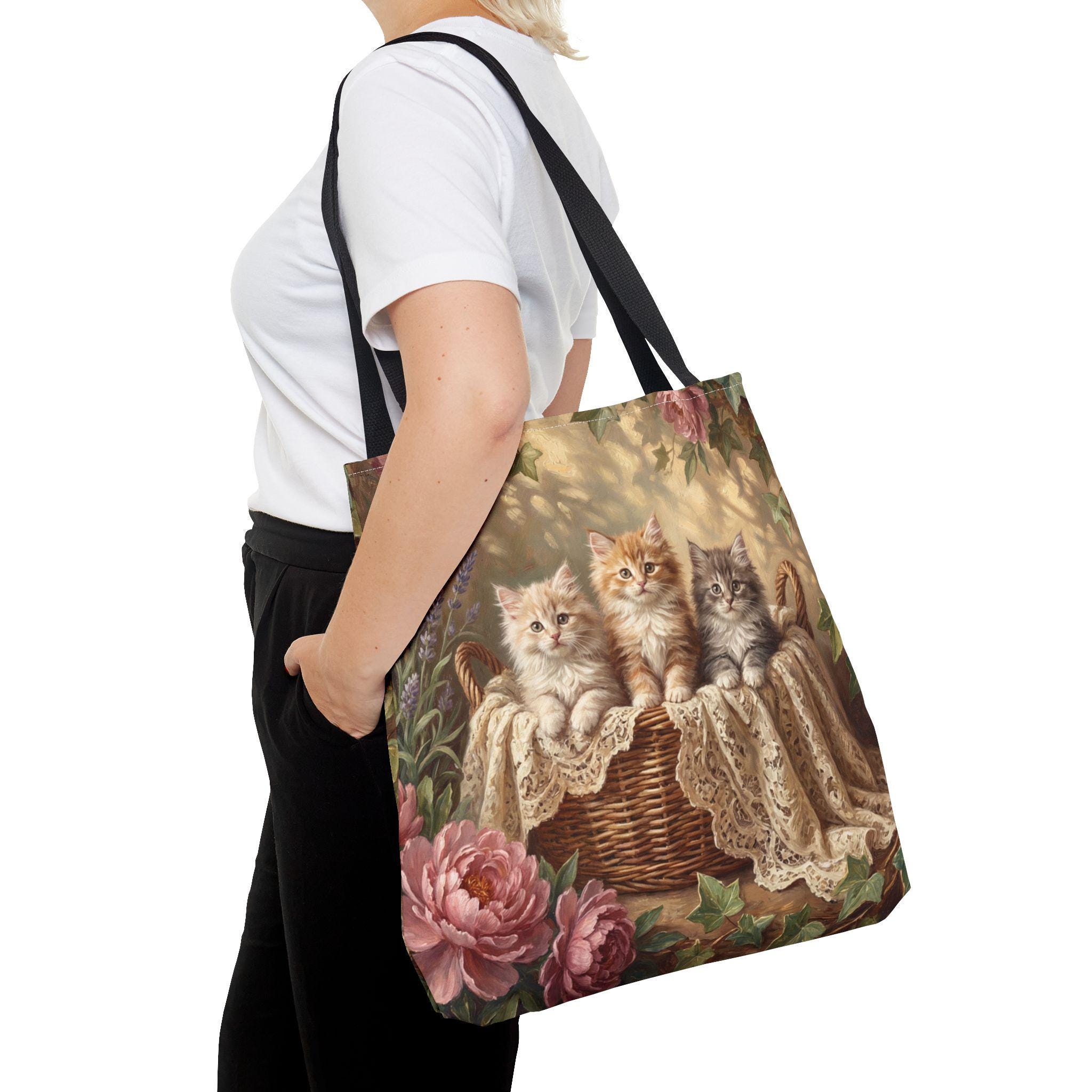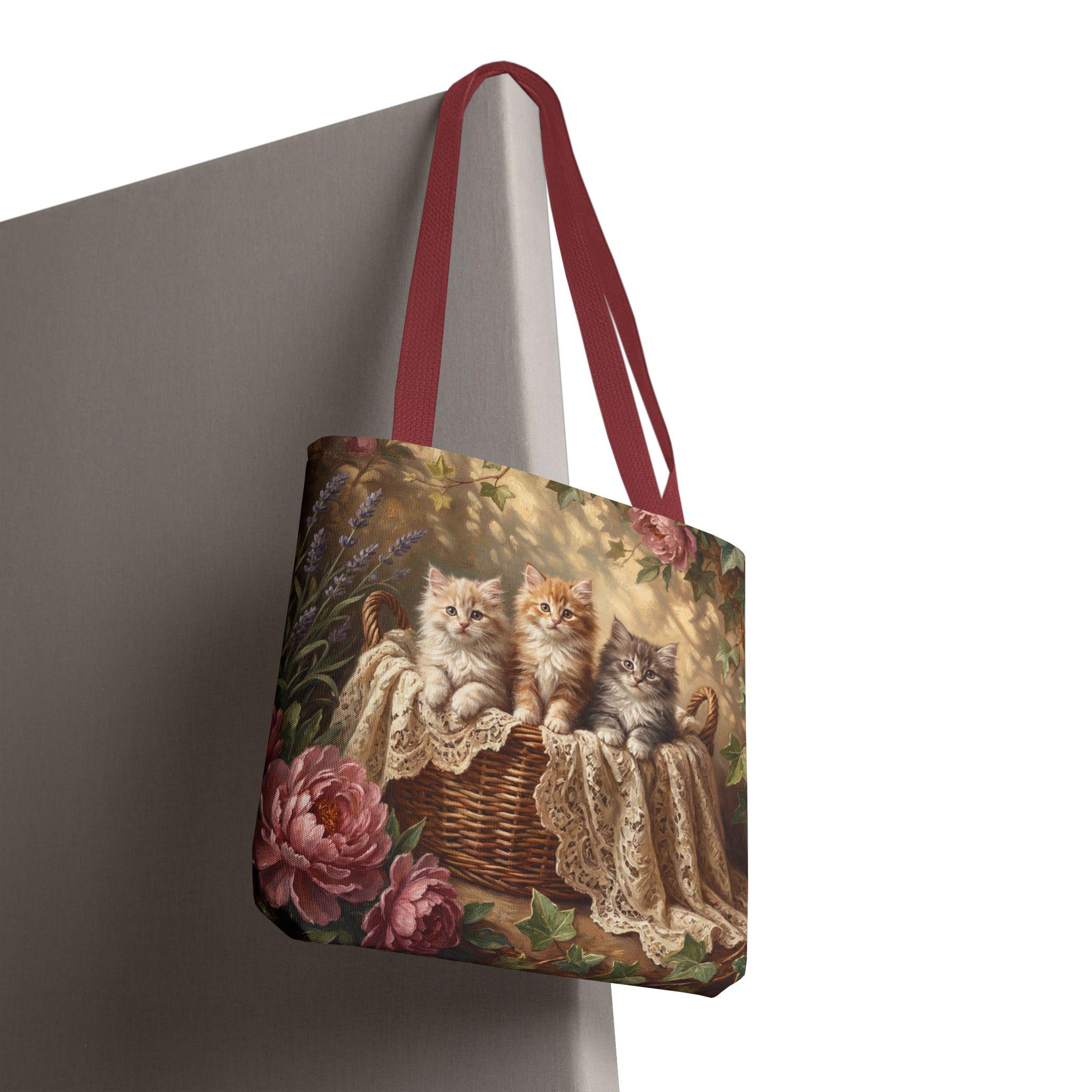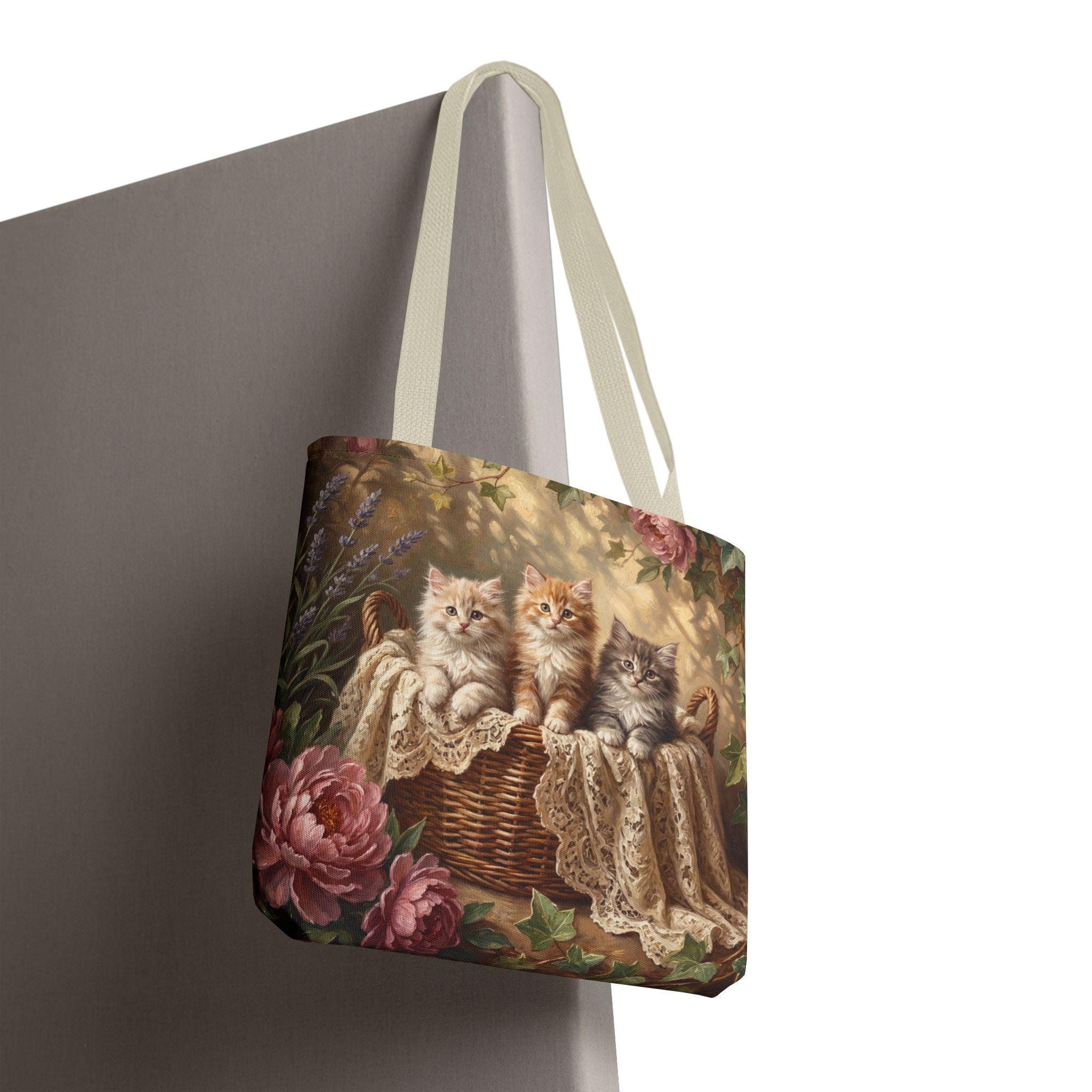 Nostalgia Cottage Kittens Tote Bag | Elegant Cat Illustration, Floral Accents