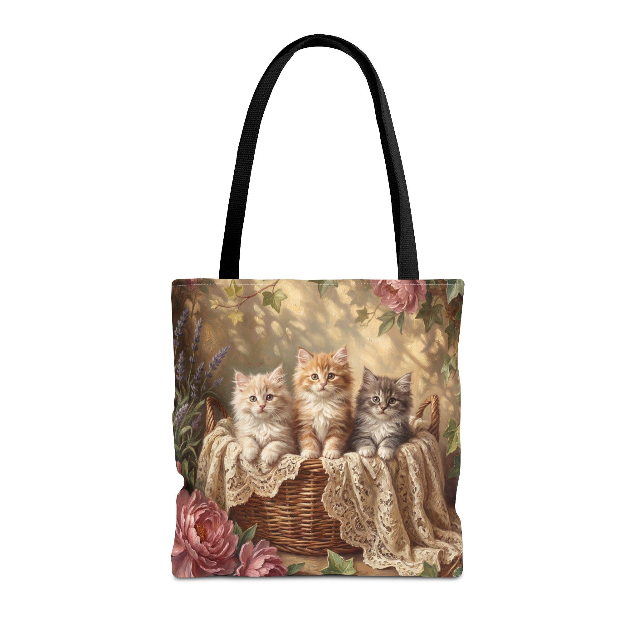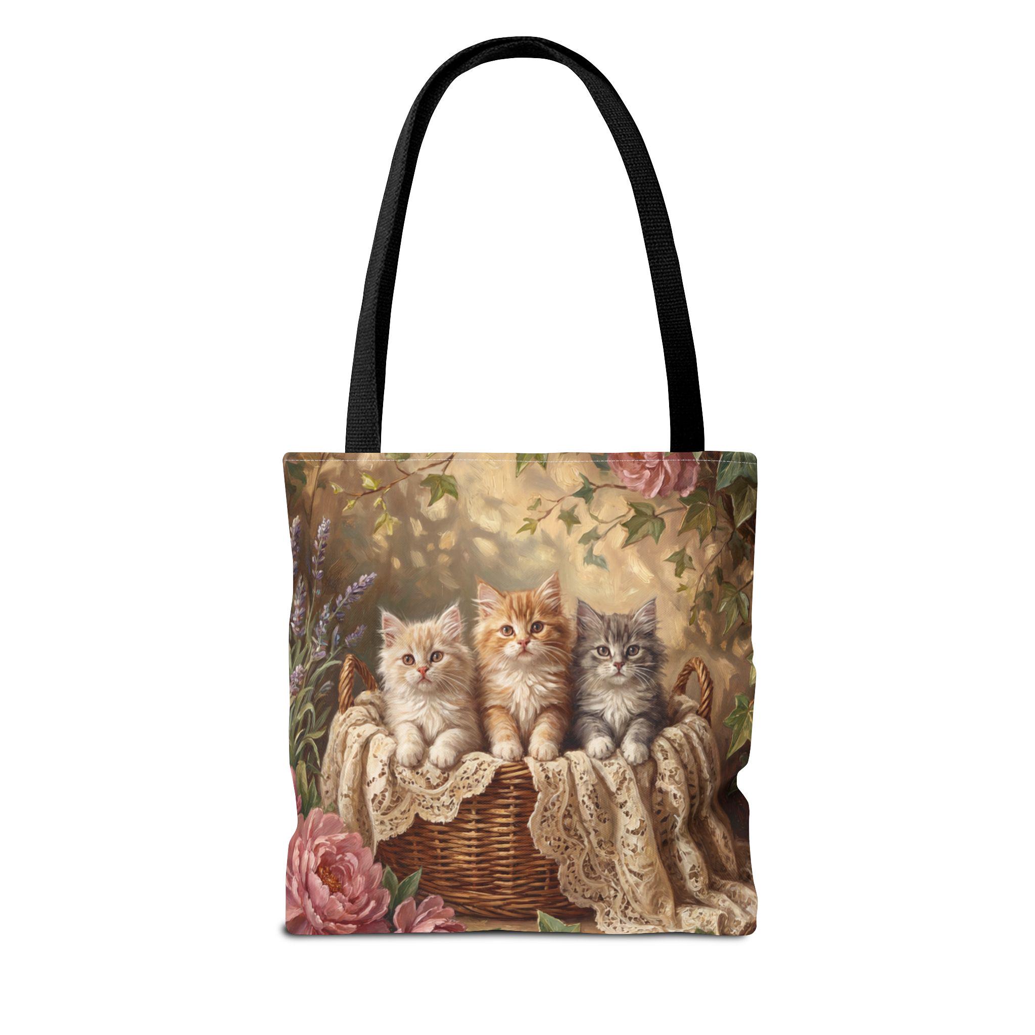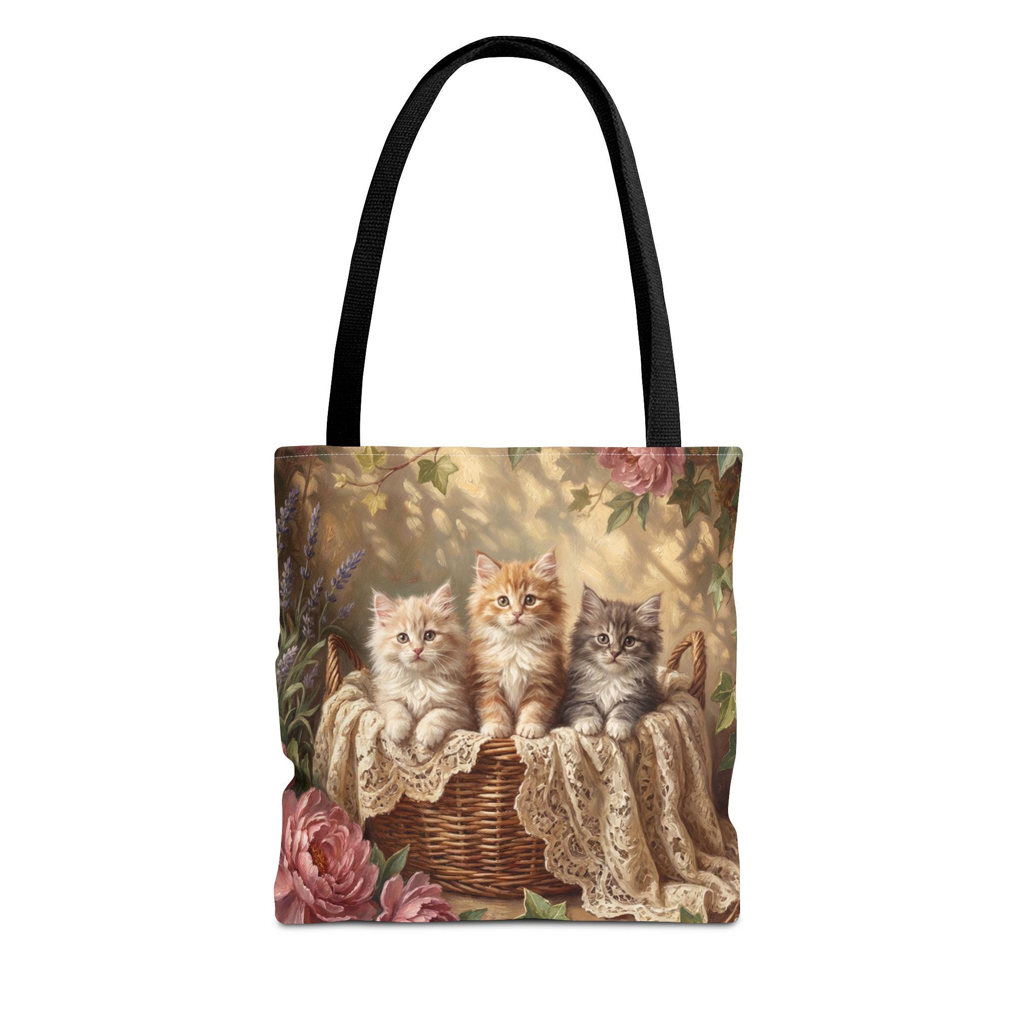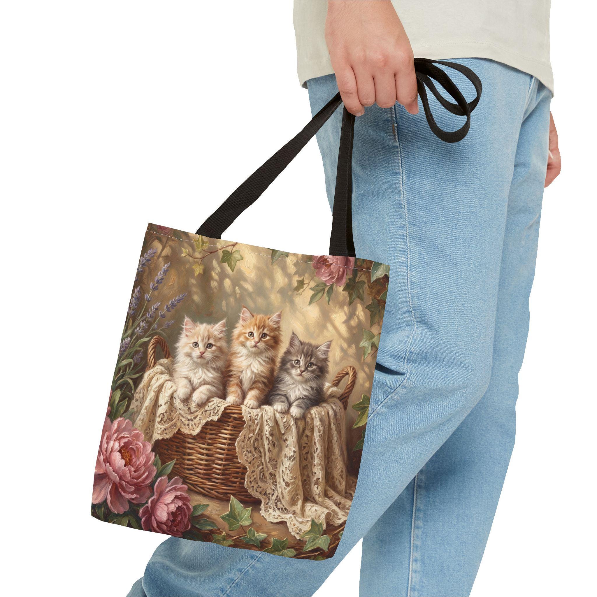 Nostalgia Cottage Kittens Tote Bag | Elegant Cat Illustration, Floral Accents