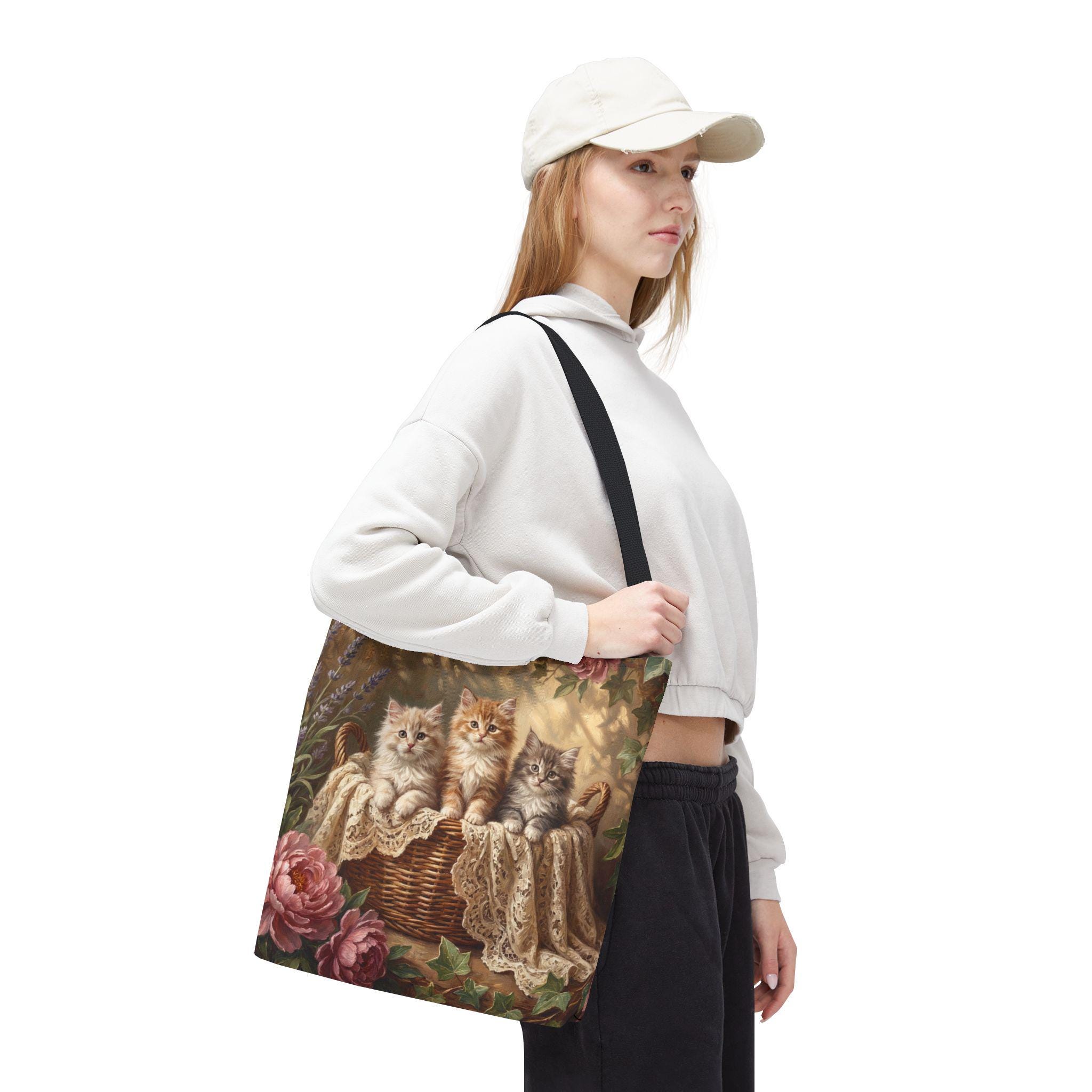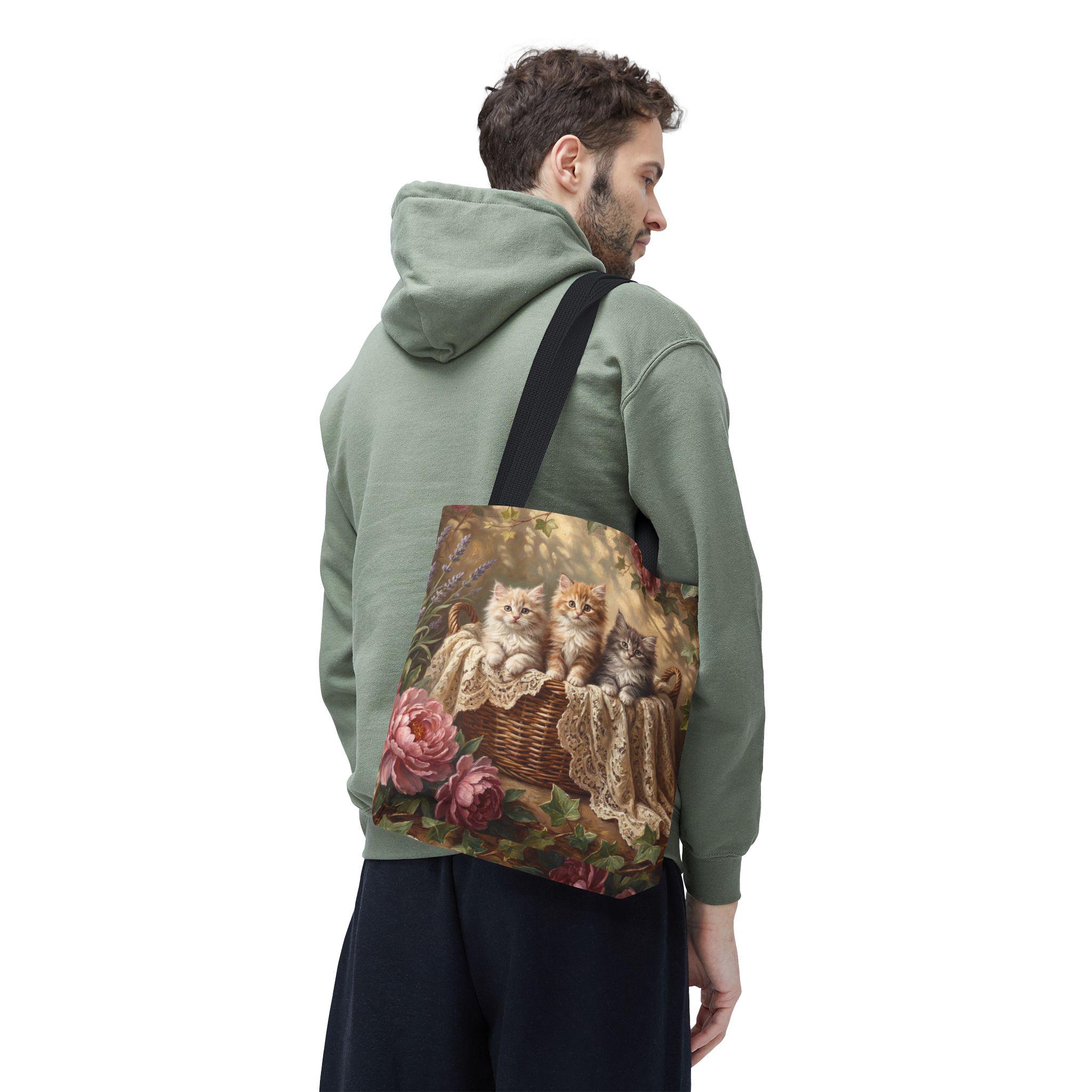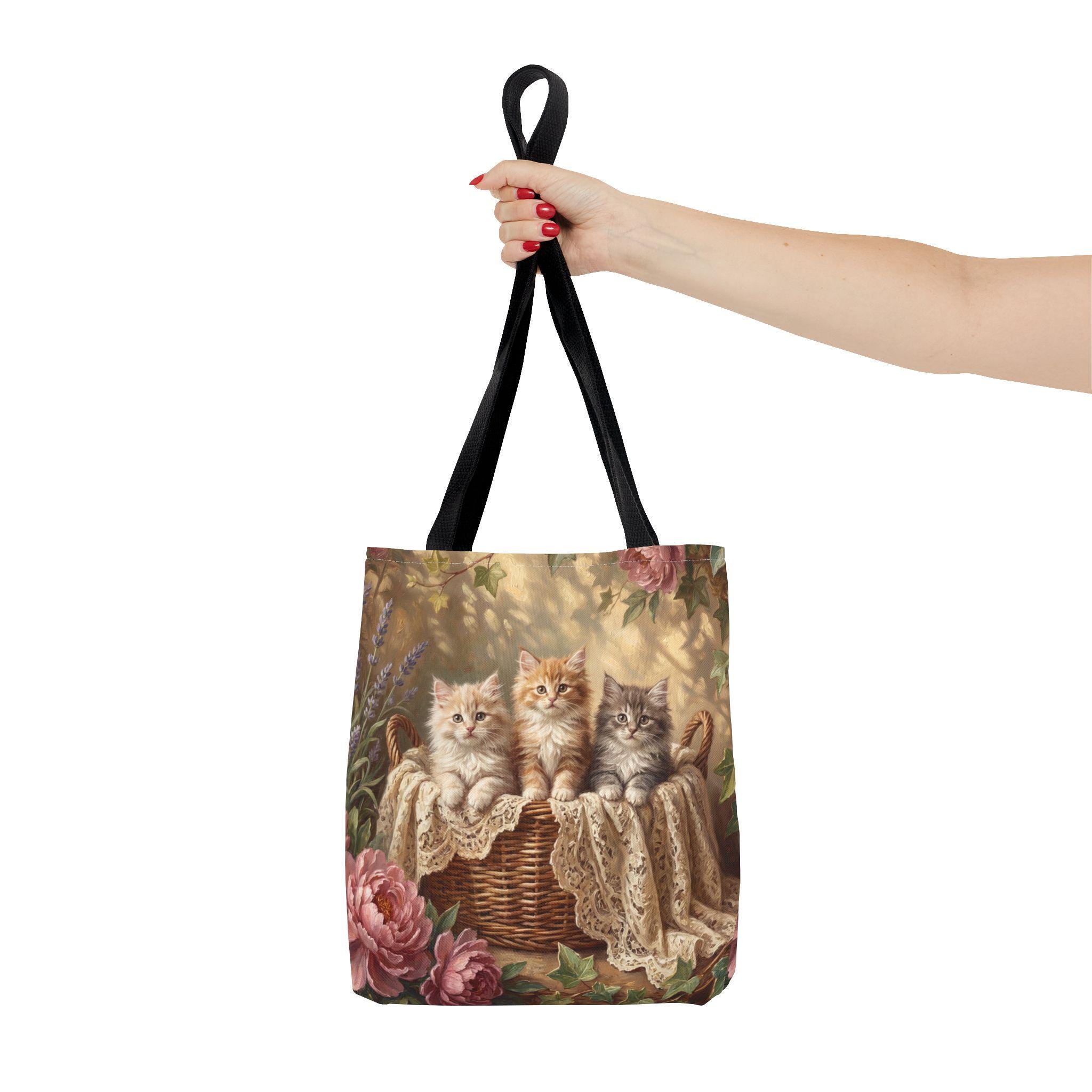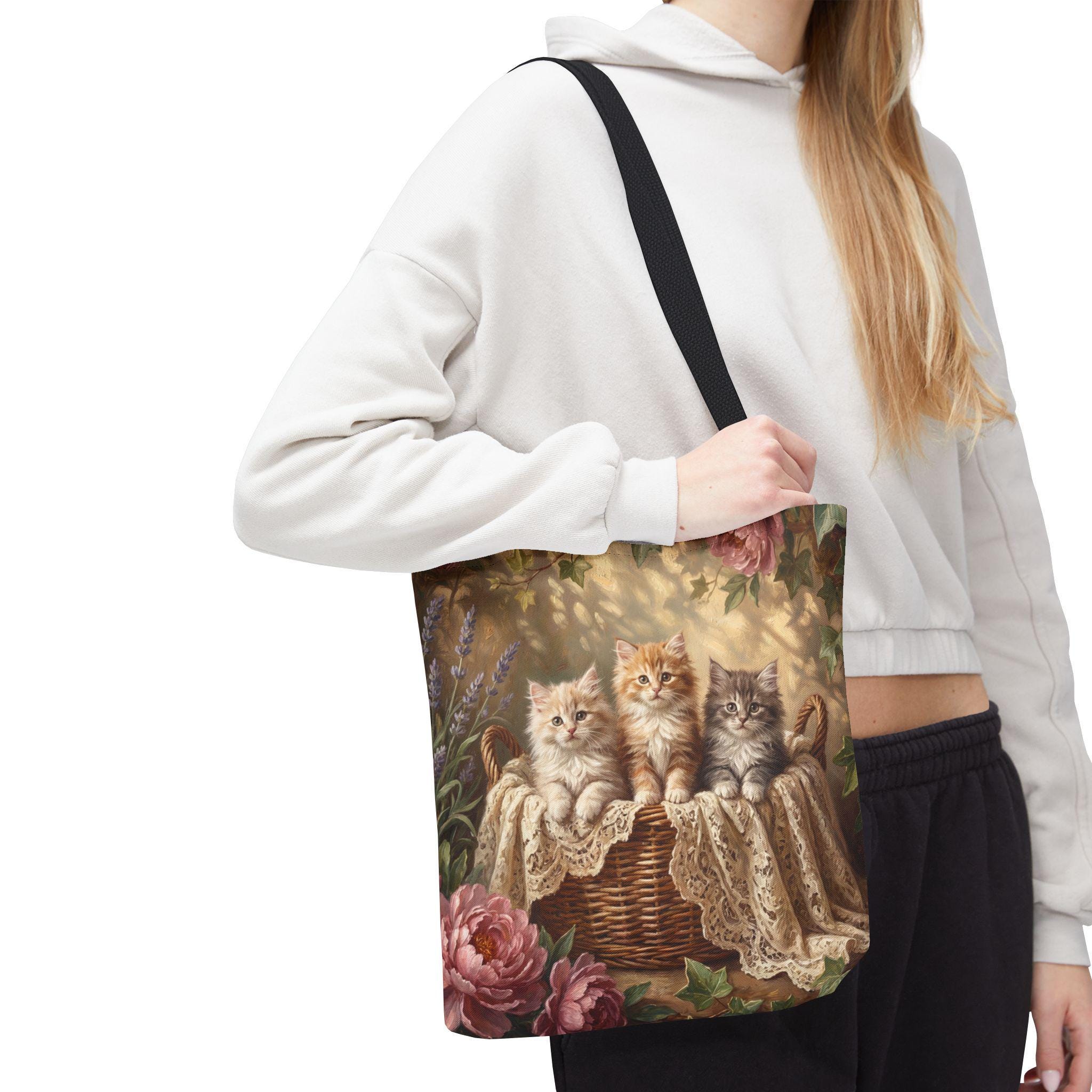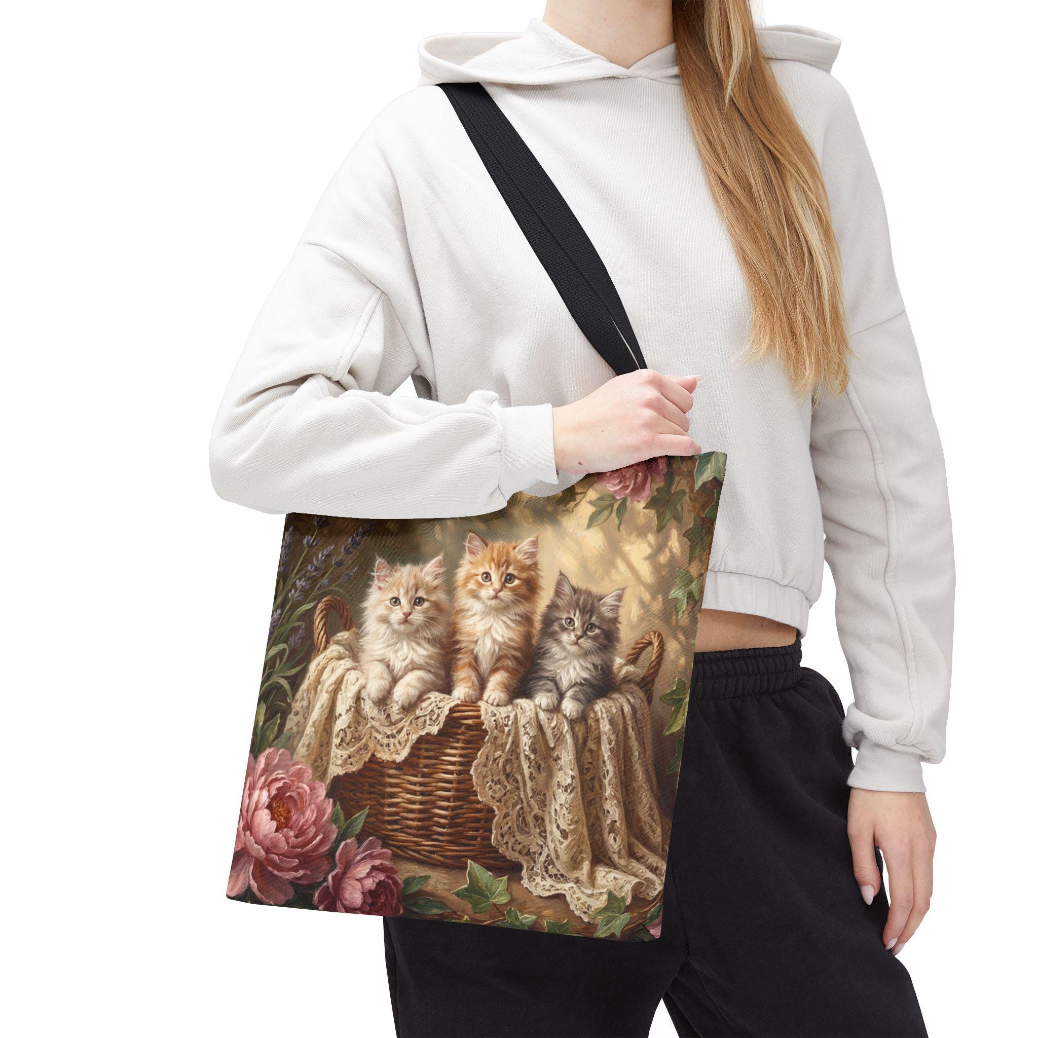 Nostalgia Cottage Kittens Tote Bag | Elegant Cat Illustration, Floral Accents