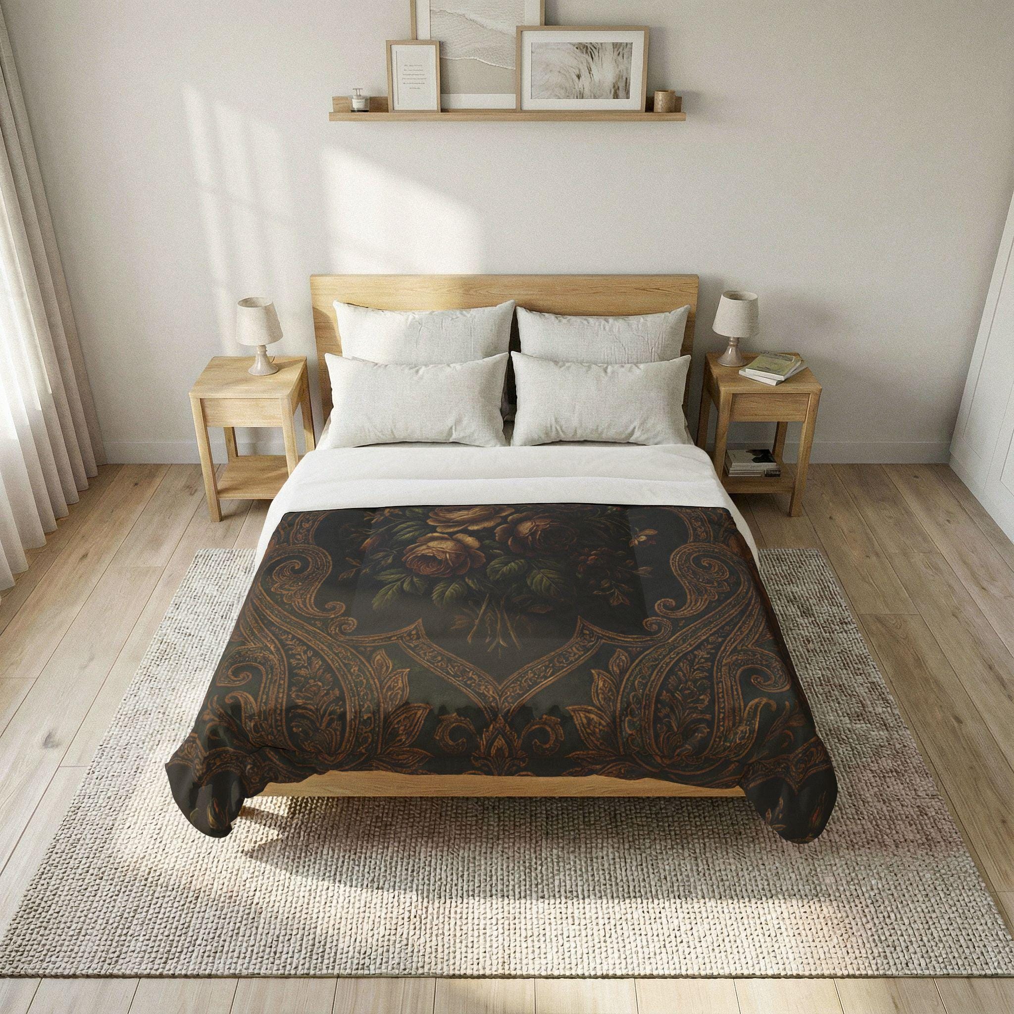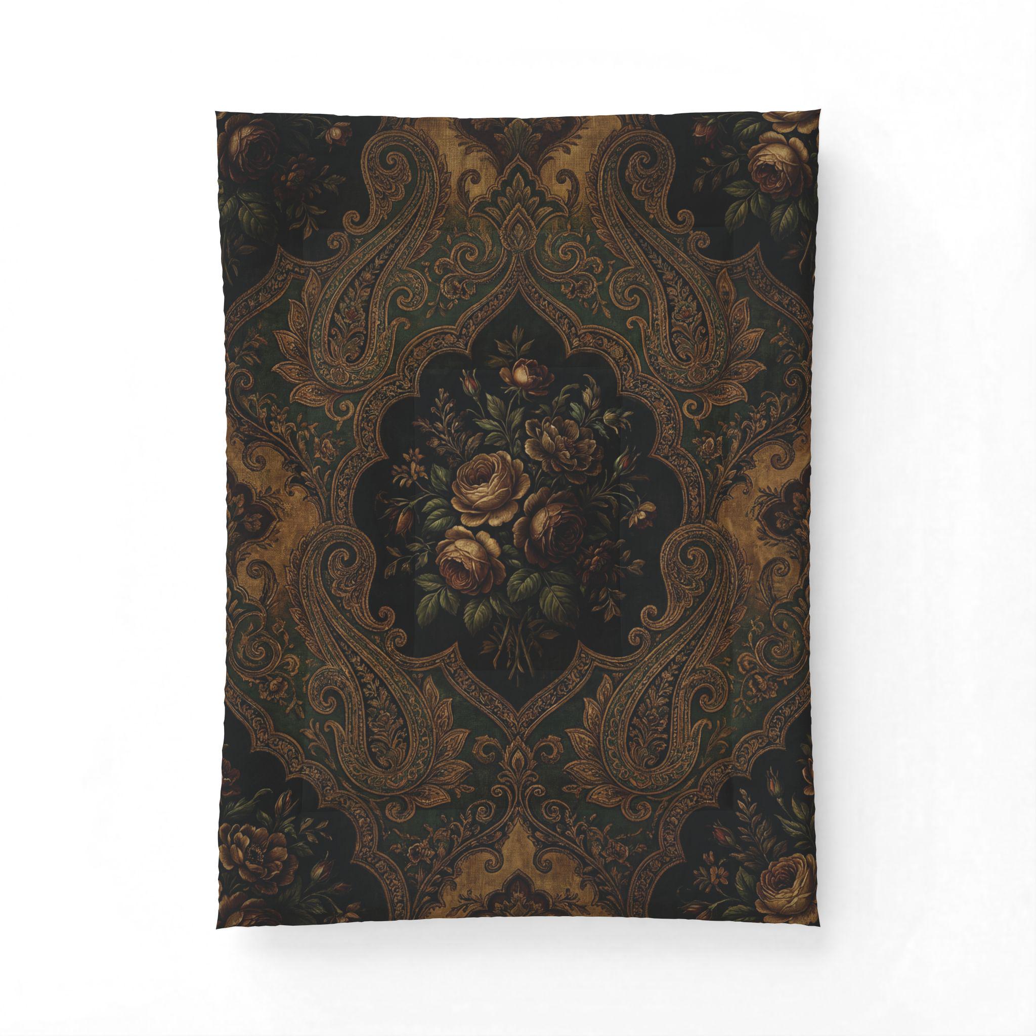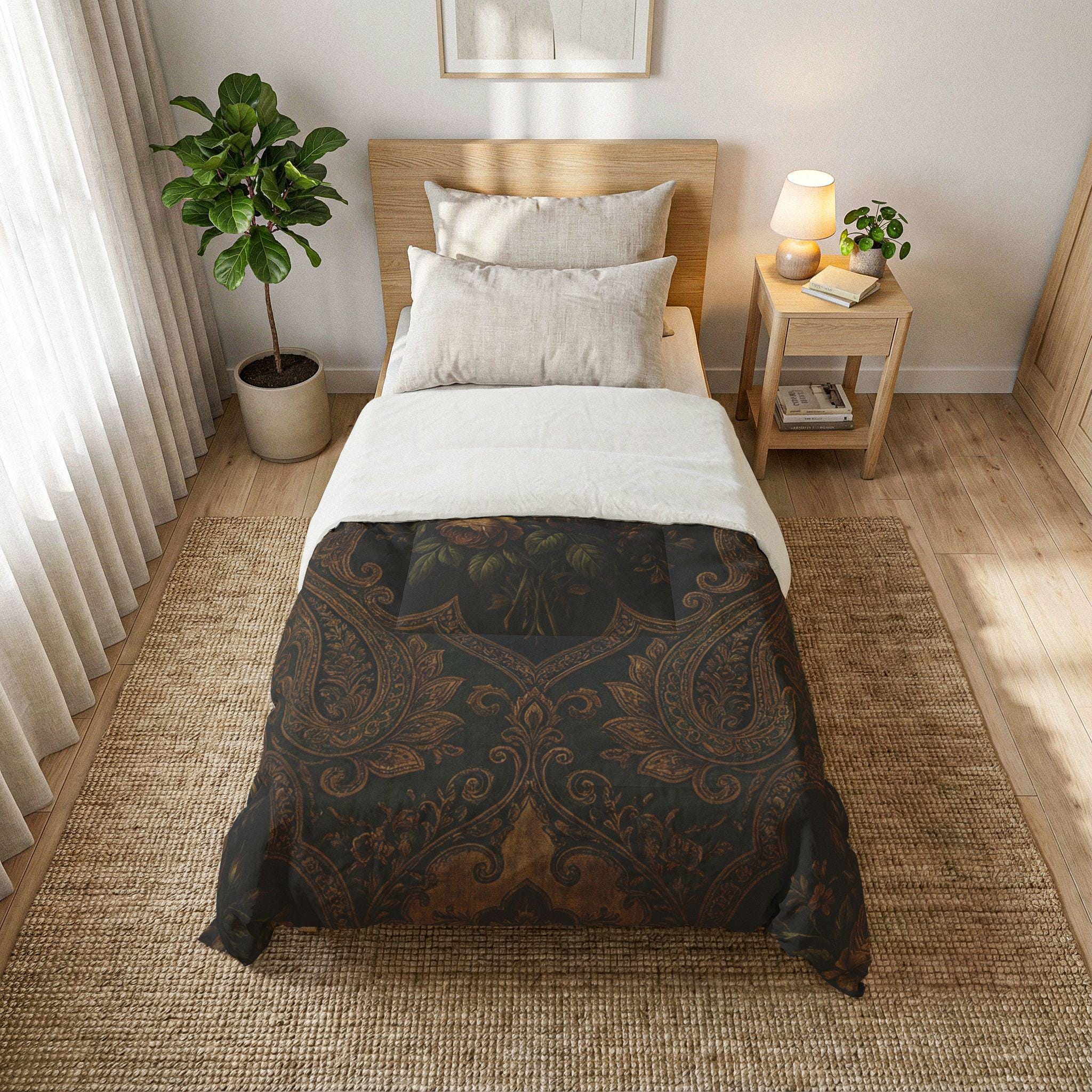 A lightweight cotton comforter that brings old-world warmth and artistry to your bedroom. The rich, painterly paisley and floral medallions sit on deep, moody tones that feel lived-in and layered, like the corner of a vintage parlor. The surface is a vivid edge-to-edge print on 100% Oeko‑Tex certified cotton, with a soft 0.75" batting for gentle warmth and a tidy double square quilting that keeps the fill even and the silhouette structured. One side shows the full decorative design; the reverse is clean white, letting the pattern be the focal point. This comforter slips over a bed for cozy evenings, quiet mornings with coffee, or for adding a cultivated, antique-inspired touch to a guest room or study.