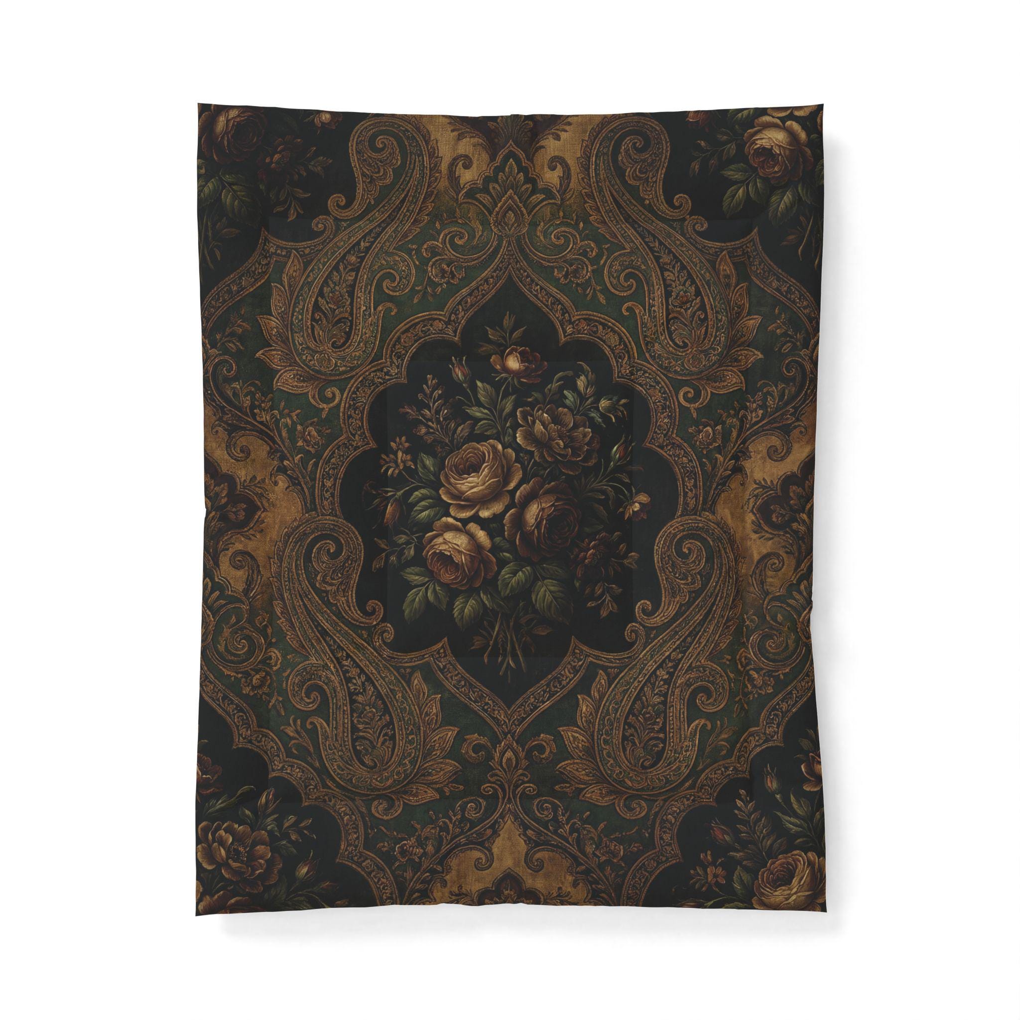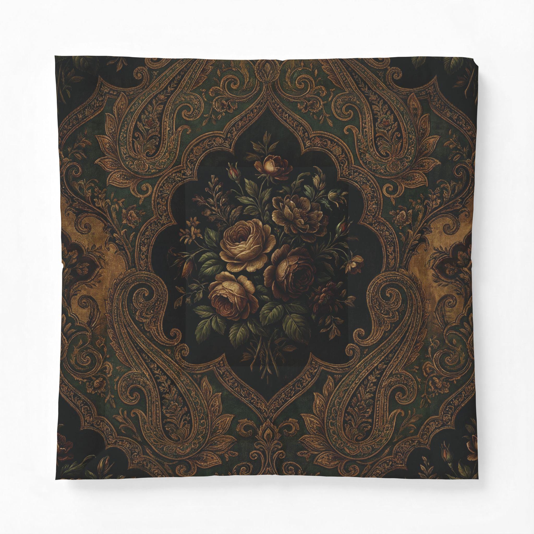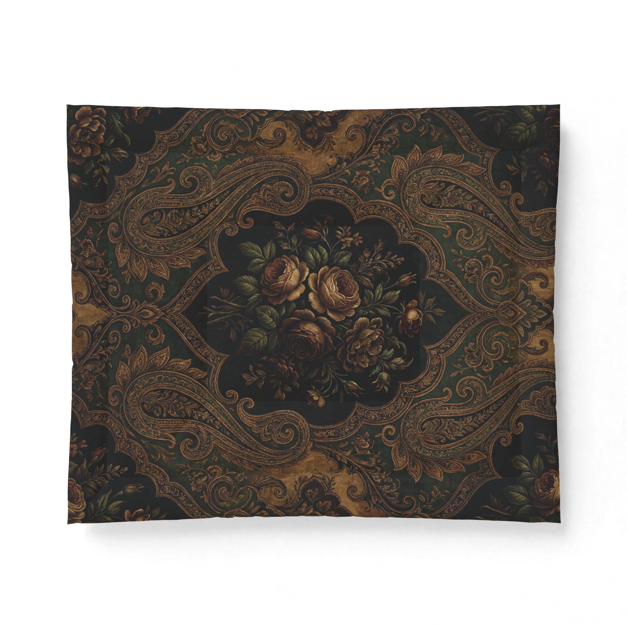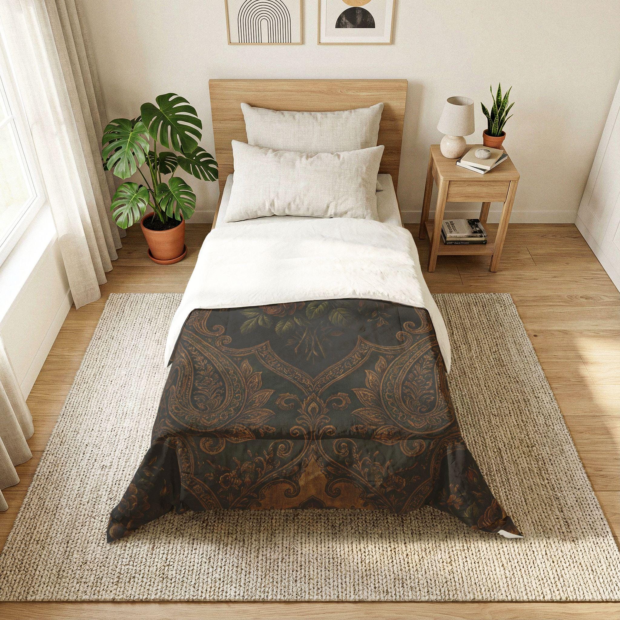 A lightweight cotton comforter that brings old-world warmth and artistry to your bedroom. The rich, painterly paisley and floral medallions sit on deep, moody tones that feel lived-in and layered, like the corner of a vintage parlor. The surface is a vivid edge-to-edge print on 100% Oeko‑Tex certified cotton, with a soft 0.75" batting for gentle warmth and a tidy double square quilting that keeps the fill even and the silhouette structured. One side shows the full decorative design; the reverse is clean white, letting the pattern be the focal point. This comforter slips over a bed for cozy evenings, quiet mornings with coffee, or for adding a cultivated, antique-inspired touch to a guest room or study.