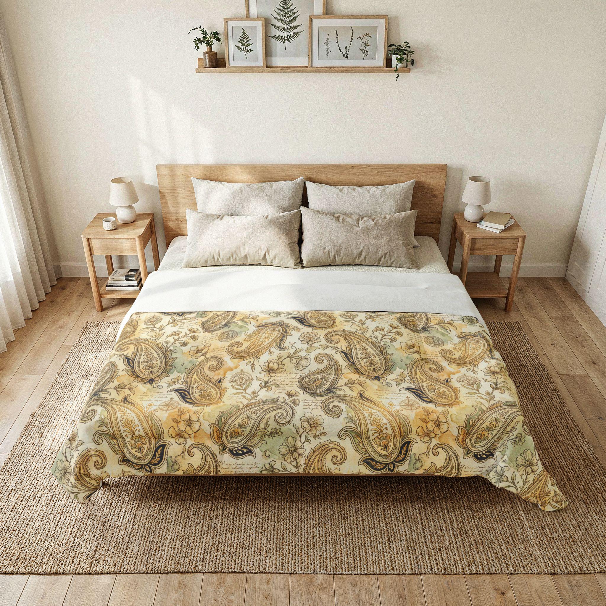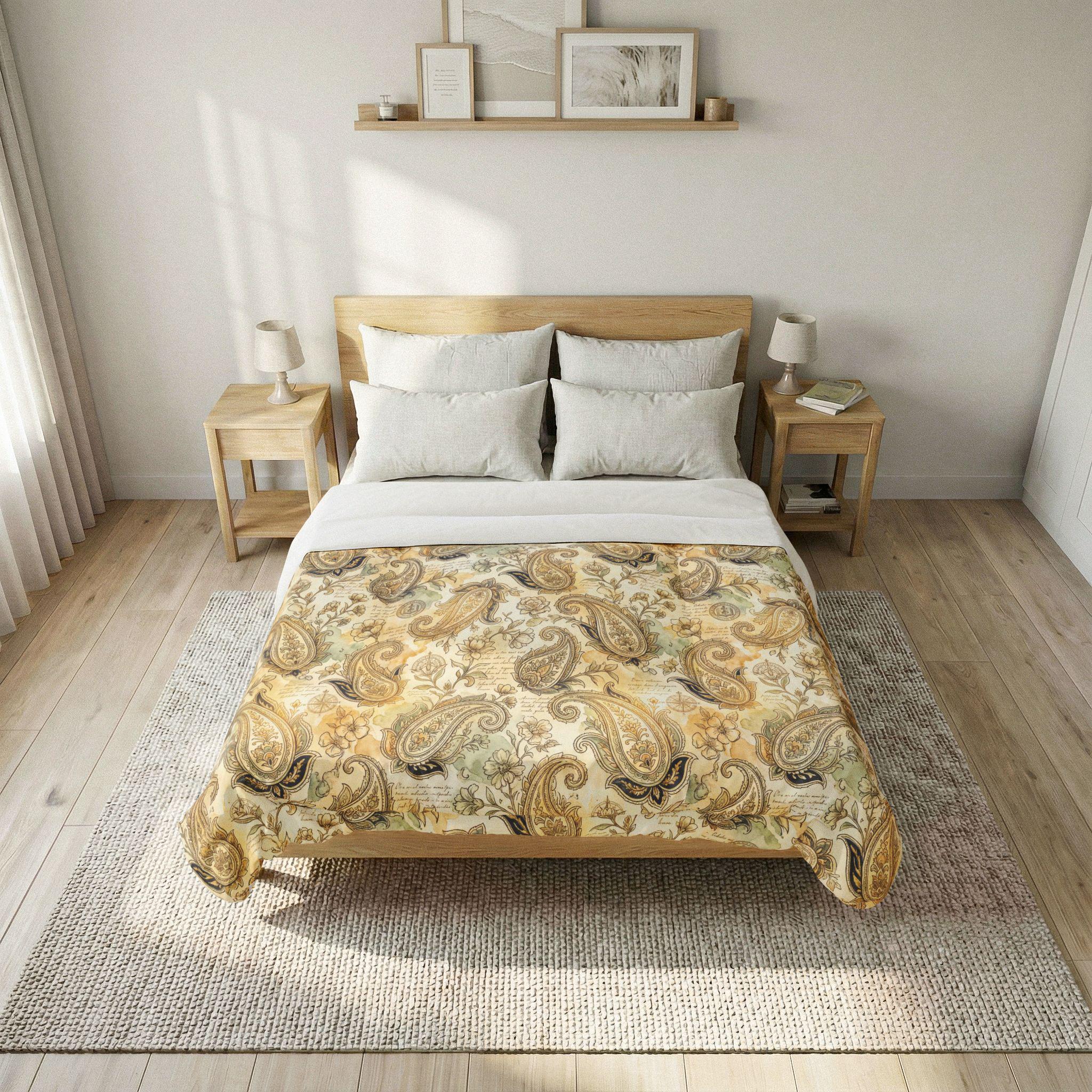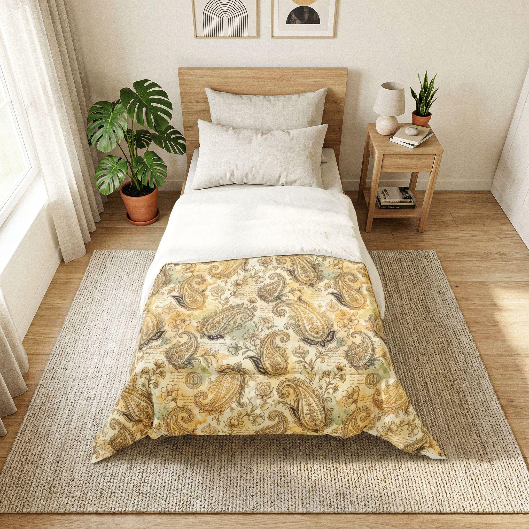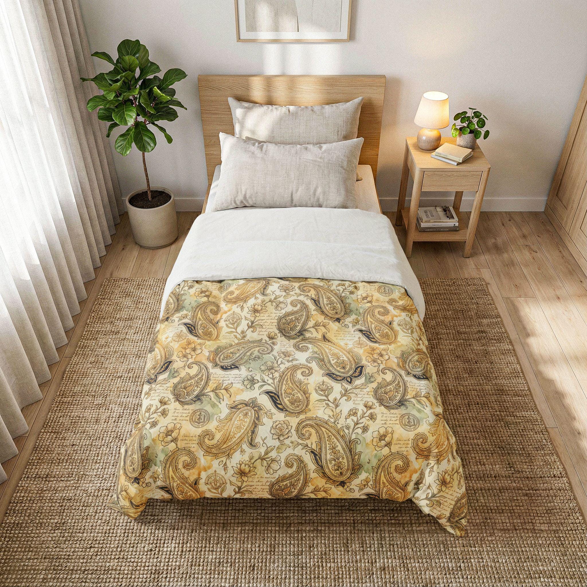 A bright, cotton comforter that brings a spirited Bright Academia and buta paisley floral energy to quiet mornings and shared late-night study sessions. The lightweight 100% Oeko-Tex certified cotton cover feels clean and breathable against the skin, while a 0.75" batting fill gives a gentle, cradling warmth without ever feeling heavy. The edge-to-edge direct-to-fabric print keeps every paisley curl and inked flourish lively and crisp, so the coverlet reads like a page from a well-loved journal draped across your bed. The tailored double-square quilting keeps the fill settled and the silhouette neat, and the white reverse lets you flip the mood to something calmer for sunlit afternoons. Made for adults who collect vintage-inspired prints and quiet rituals—this comforter lives at the intersection of thoughtful texture and bright, literary style.