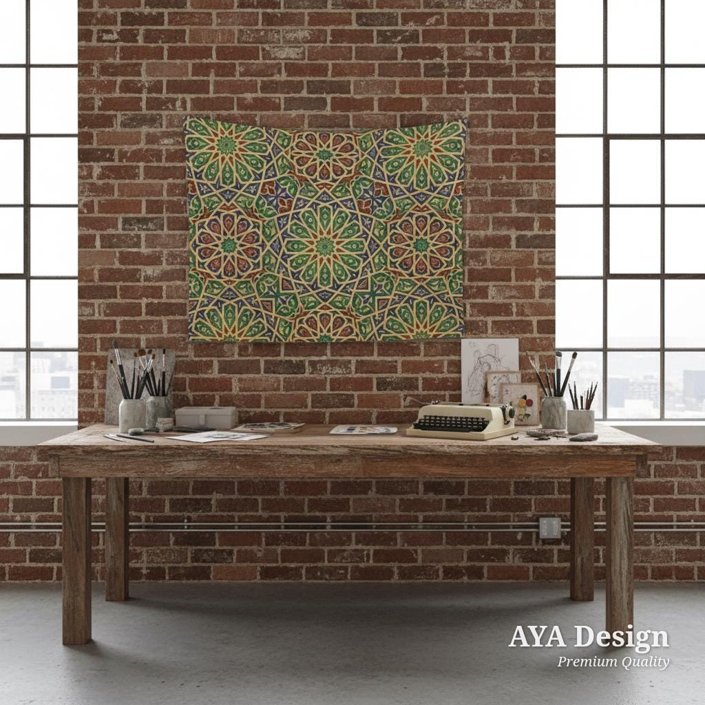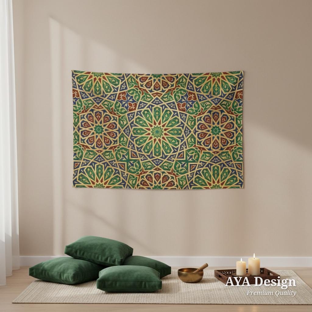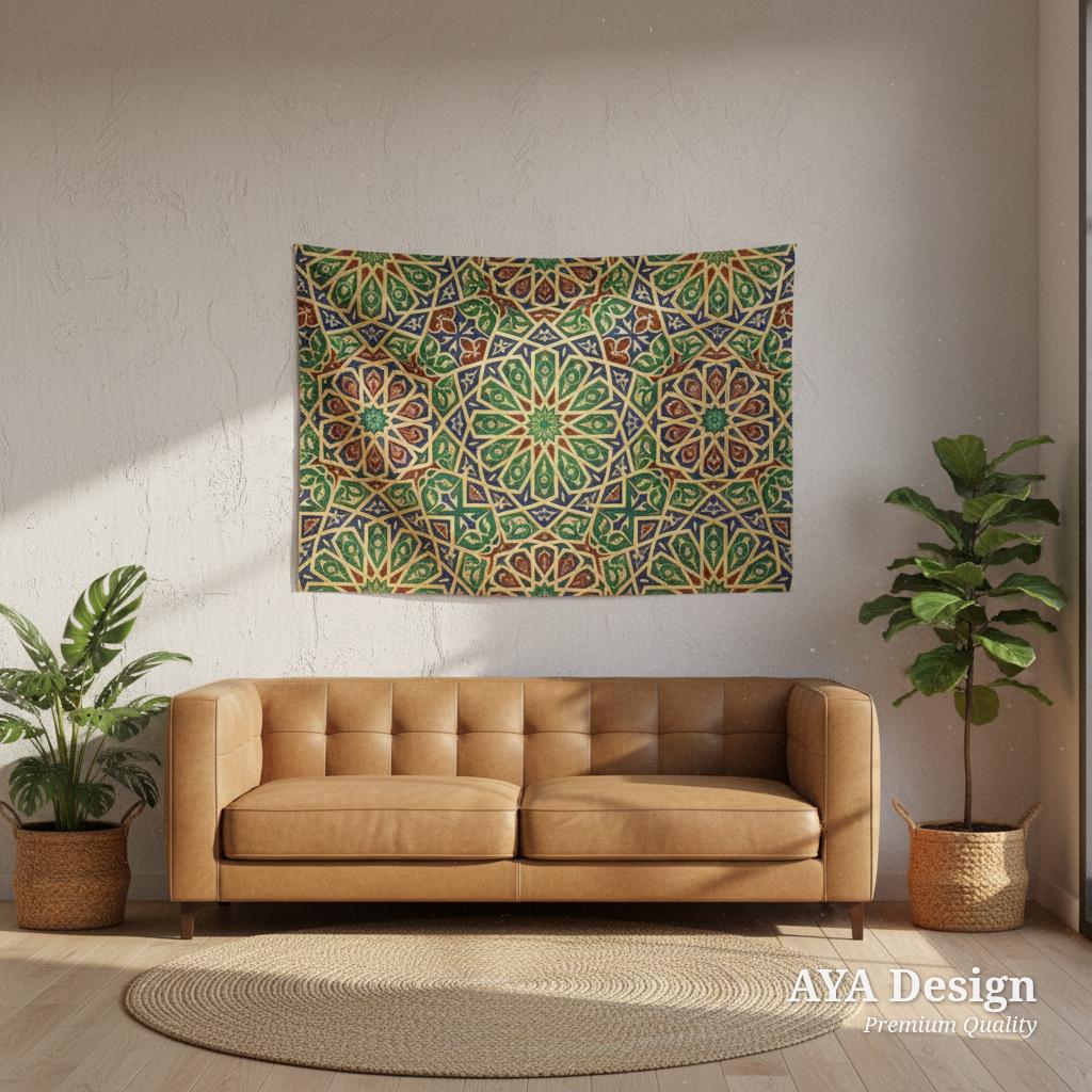 Bring the breathtaking beauty of Andalusian architecture and rich Middle Eastern heritage straight into your home. Featuring an exquisite, mesmerizing geometric star pattern in regal jewel tones of emerald green, sapphire blue, ruby red, and shimmering gold, this elegant tapestry is more than just wall decor—it’s a statement of culture and art.