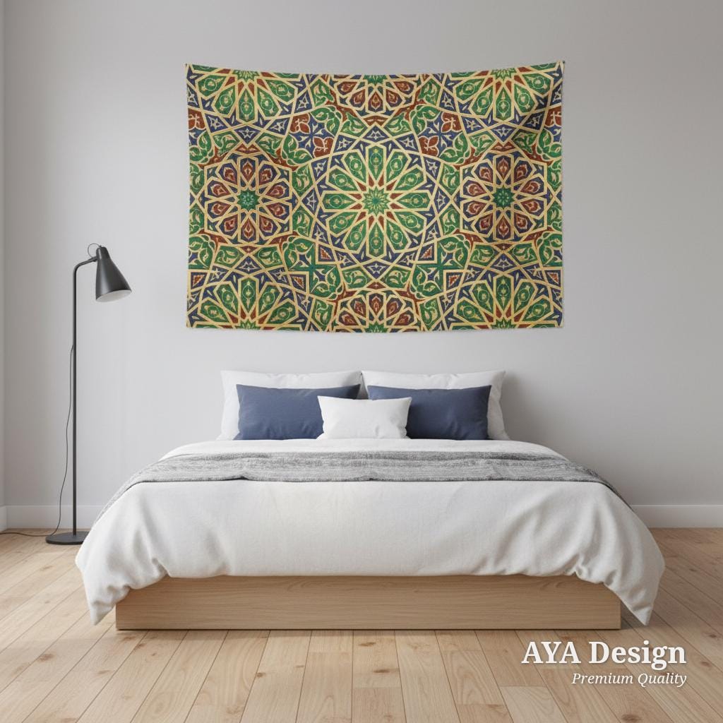 Whether you are looking to create a cozy, bohemian vibe in your living room, searching for the perfect elegant backdrop for Ramadan and Eid gatherings, or wanting a calming geometric focal point for your bedroom, this gorgeous tapestry effortlessly elevates any space.