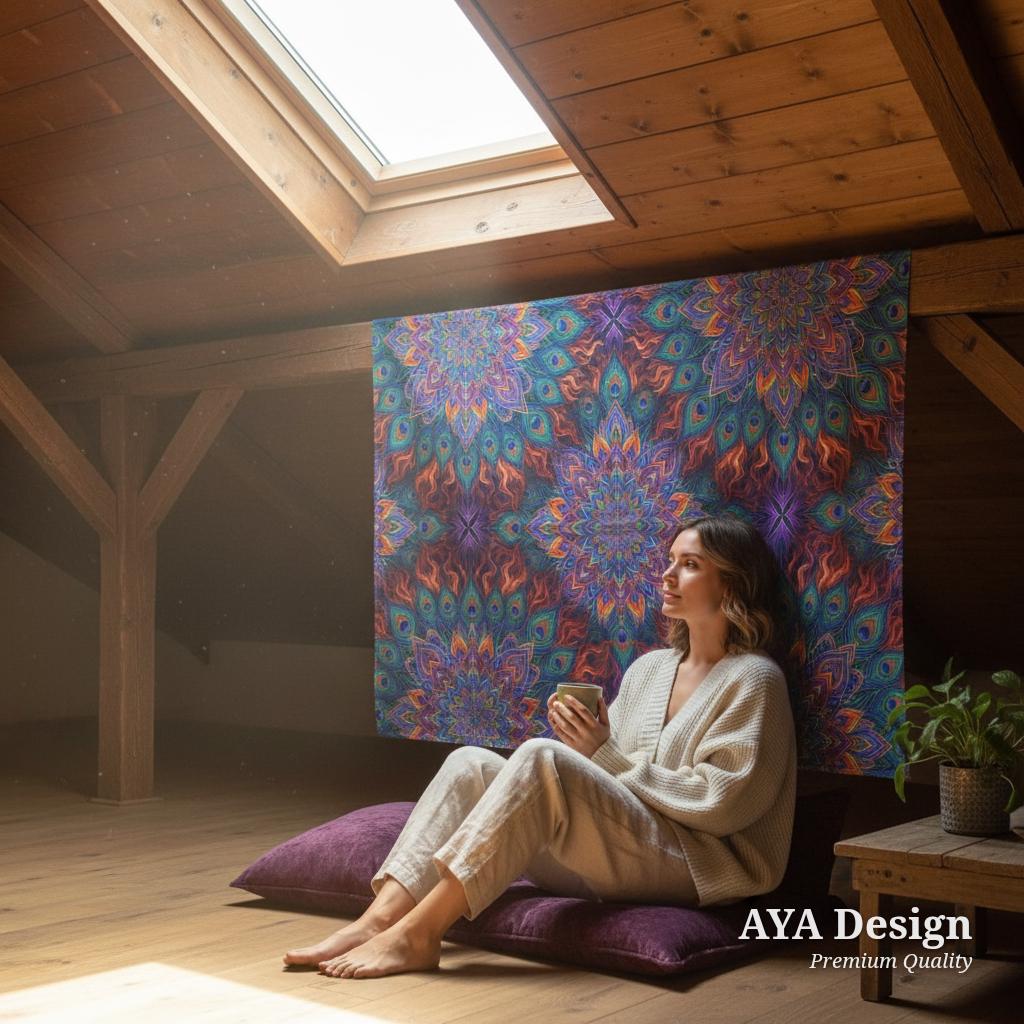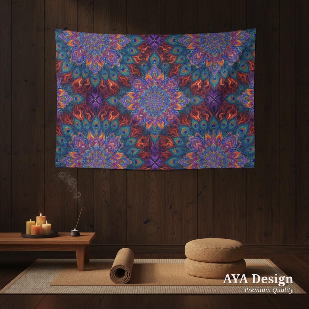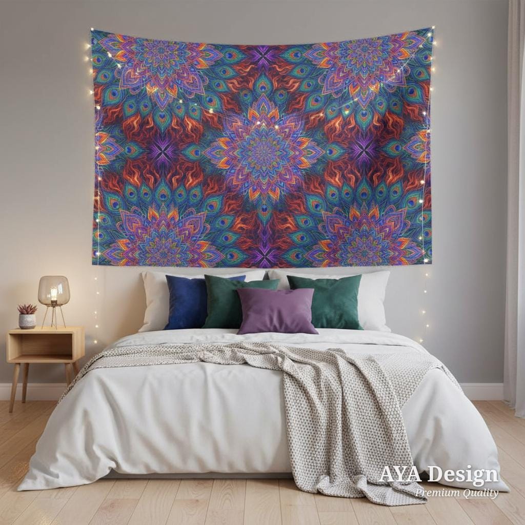 Are you tired of blank, uninspiring walls? Breathe life, energy, and rich color into your home with our Vibrant Peacock Mandala Tapestry. Featuring a mesmerizing kaleidoscope of fiery reds, deep purples, and brilliant peacock blues, this intricate piece is more than just a wall hanging—it’s a window into a mystical, creative world.