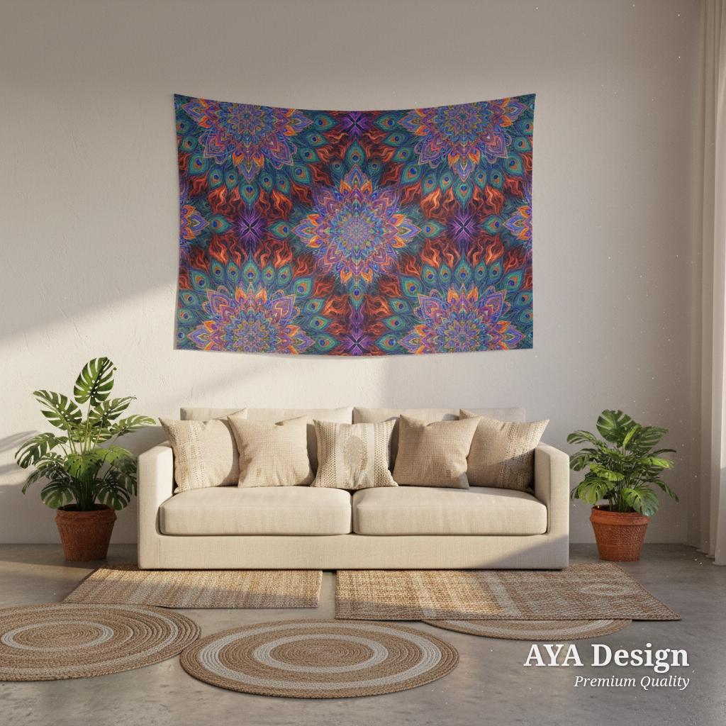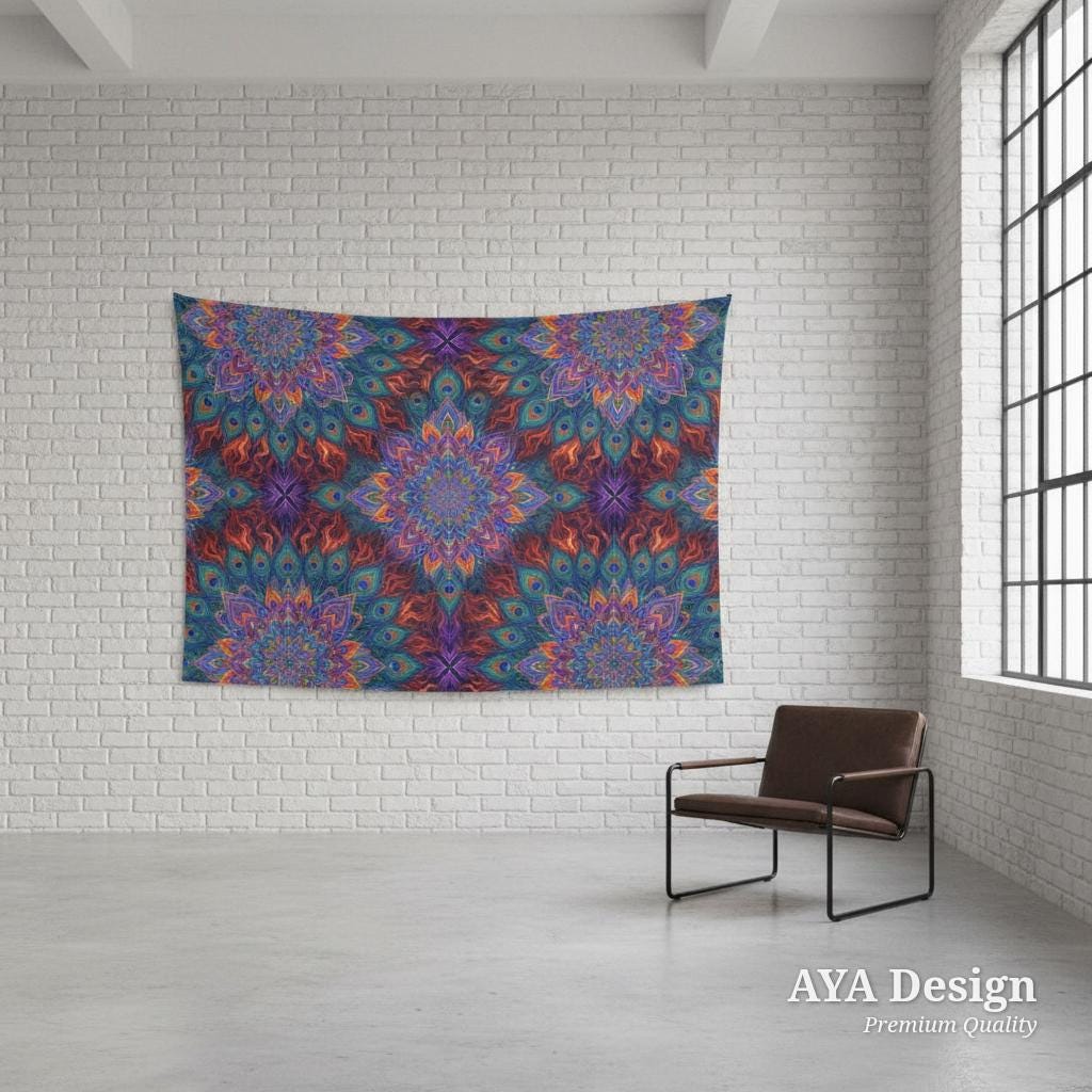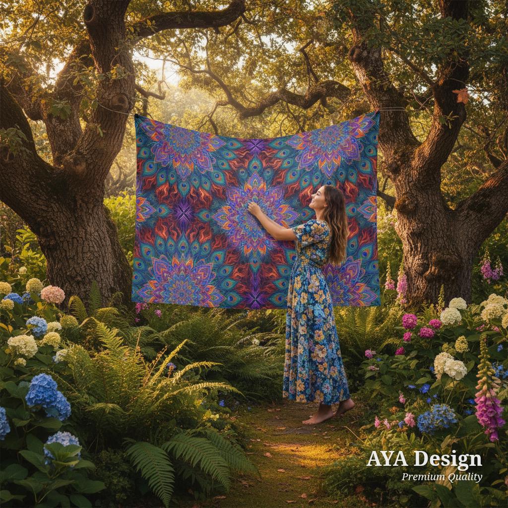 Are you tired of blank, uninspiring walls? Breathe life, energy, and rich color into your home with our Vibrant Peacock Mandala Tapestry. Featuring a mesmerizing kaleidoscope of fiery reds, deep purples, and brilliant peacock blues, this intricate piece is more than just a wall hanging—it’s a window into a mystical, creative world.