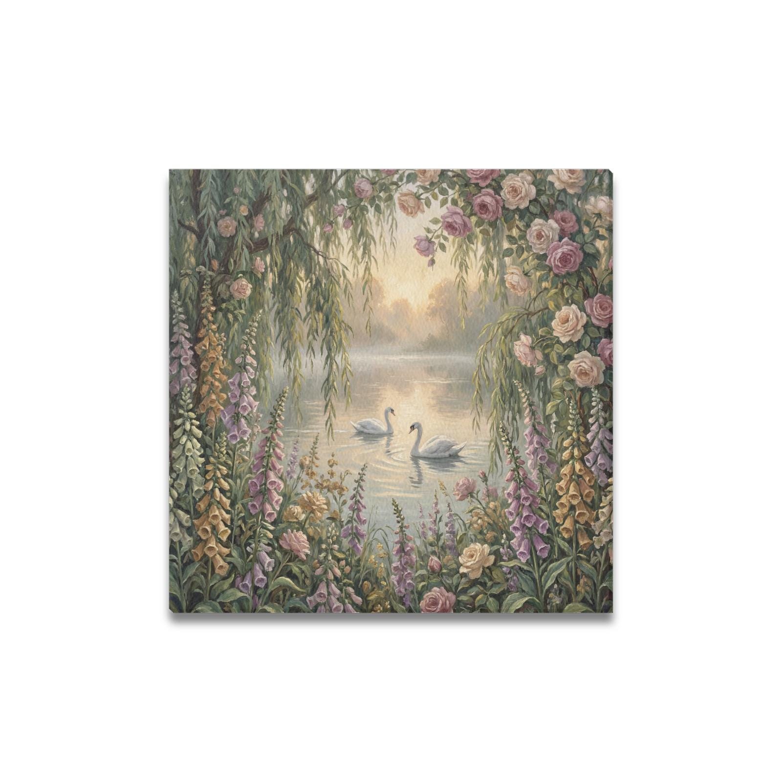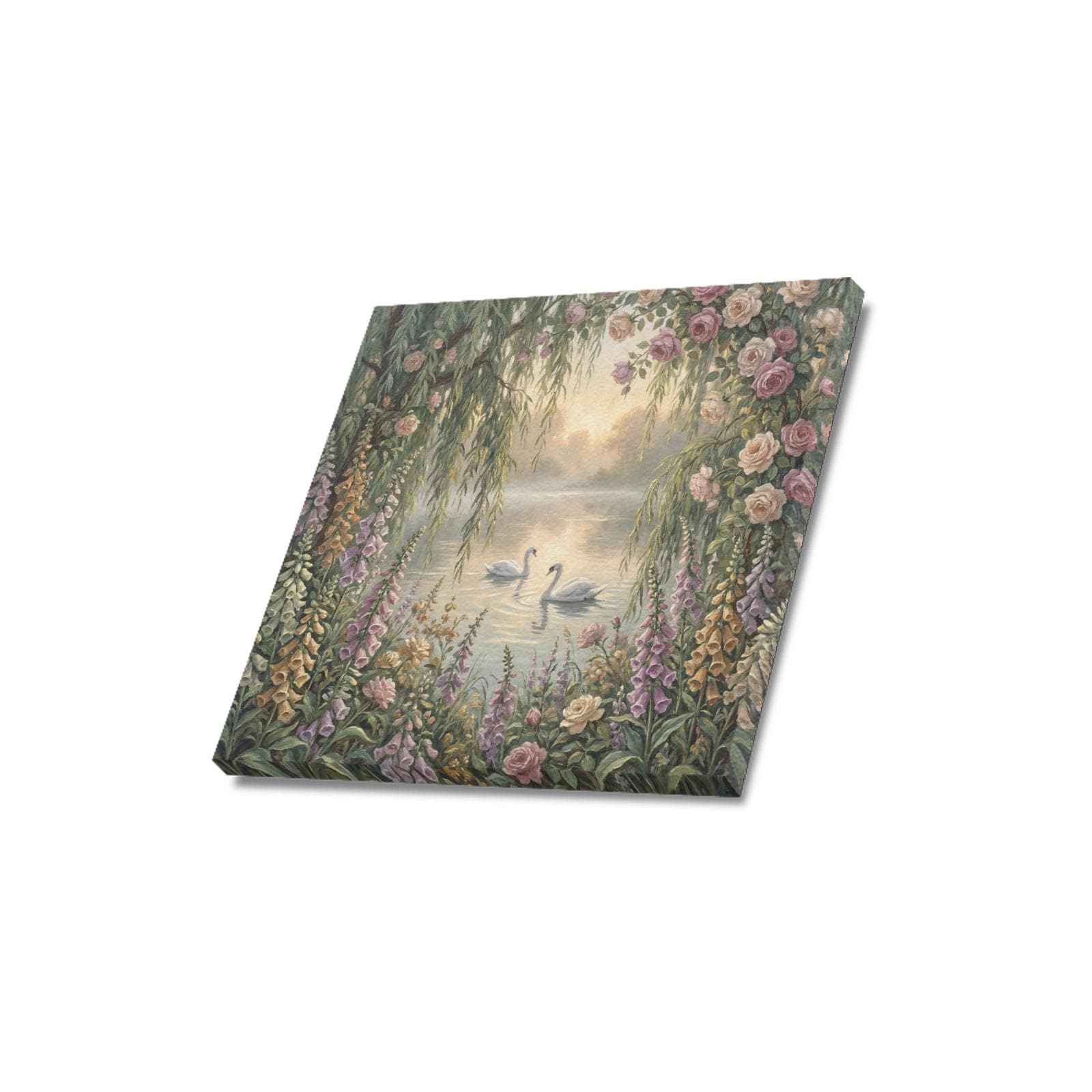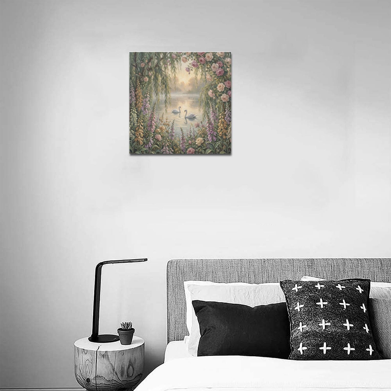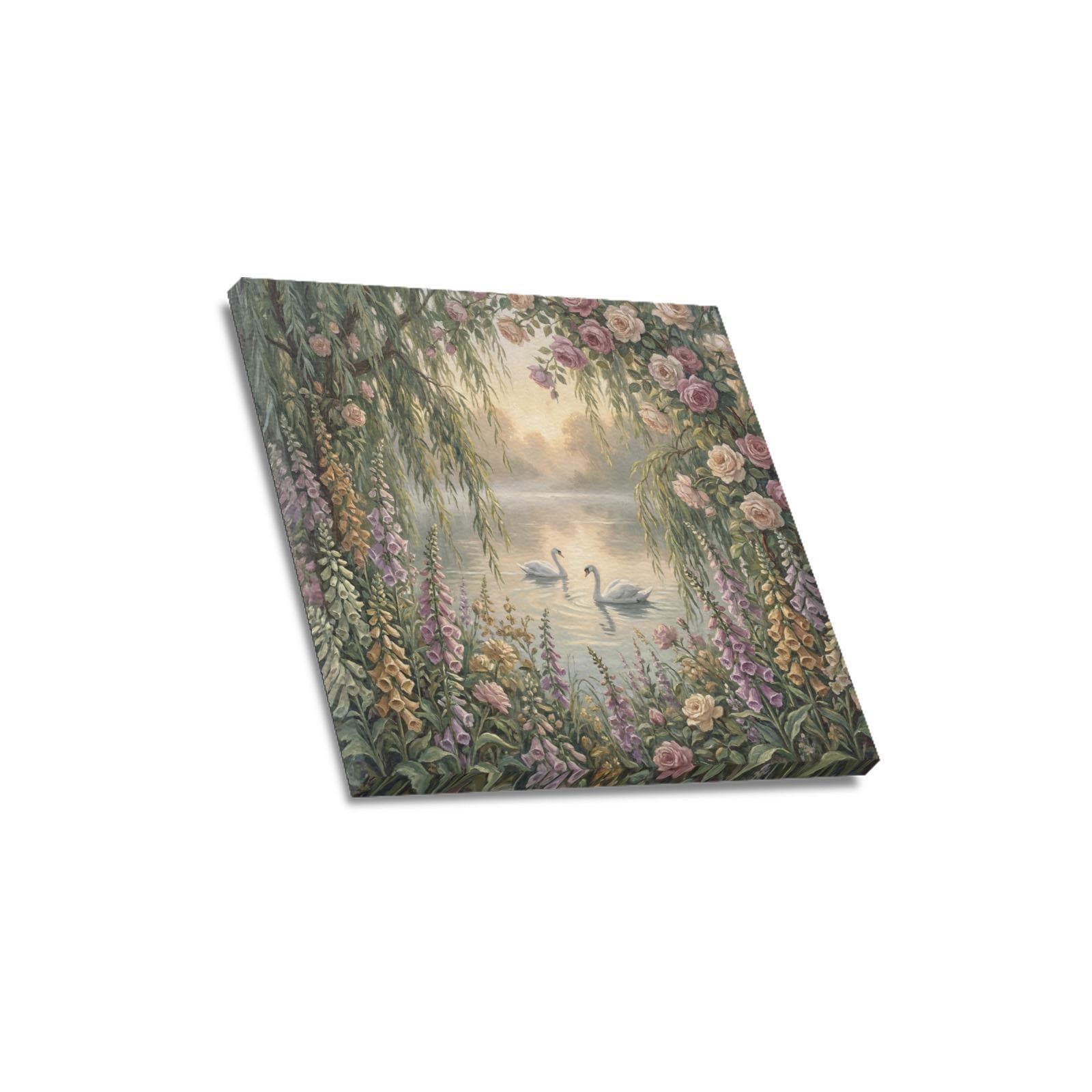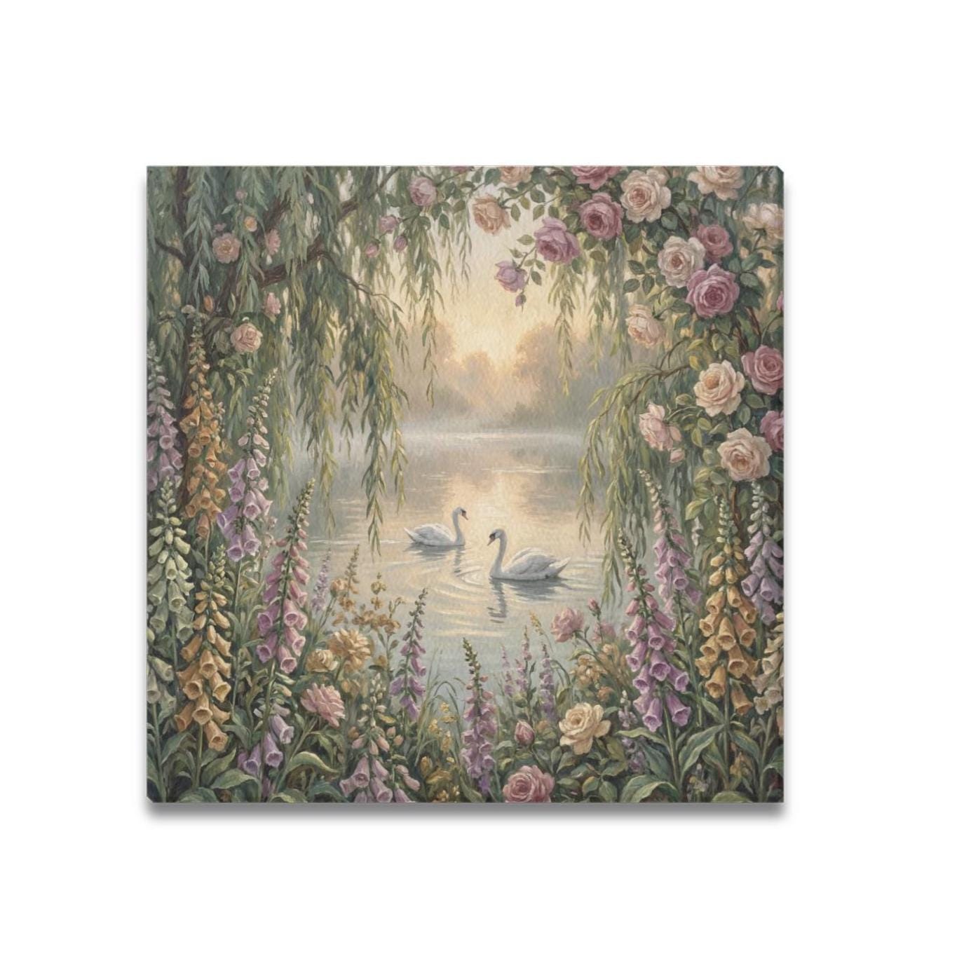 Step into a dreamy fairy tale with our "Swan Lake" canvas print. Featuring two elegant swans gliding across a serene, sunlit lake framed by lush, blooming foxgloves and weeping willows, this artwork captures the ultimate essence of peace and romance. Because swans mate for life, this beautiful piece isn't just wall art—it’s a symbol of eternal love.