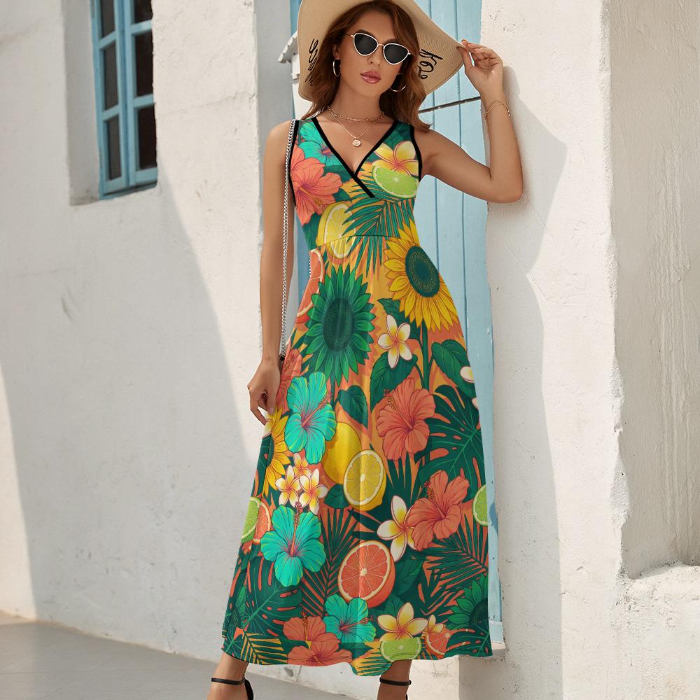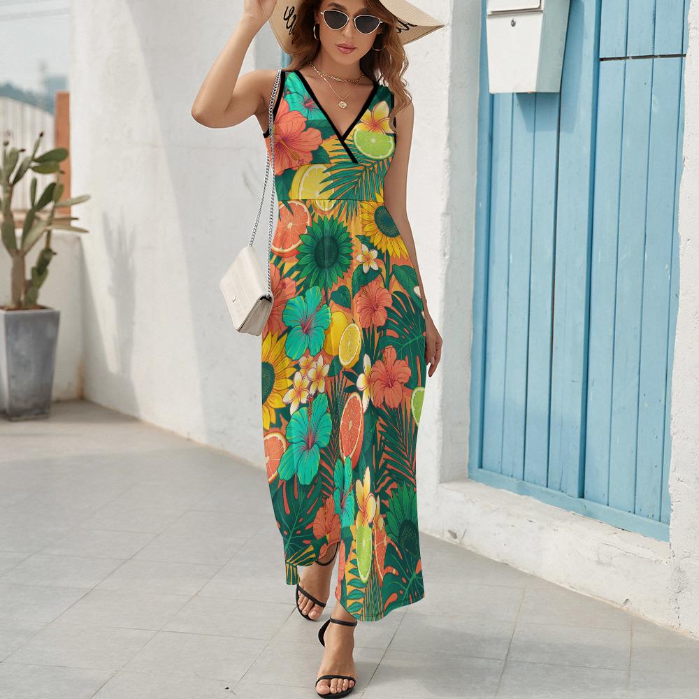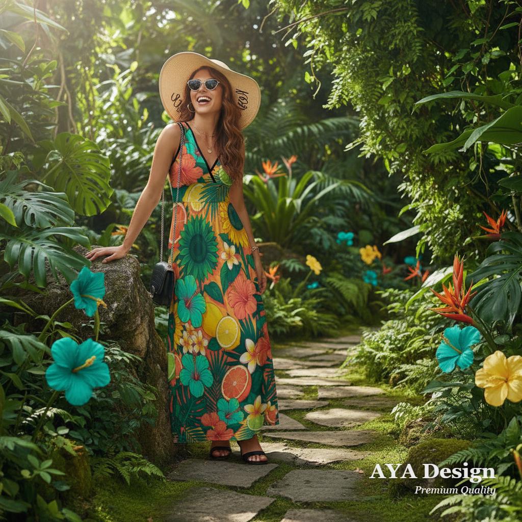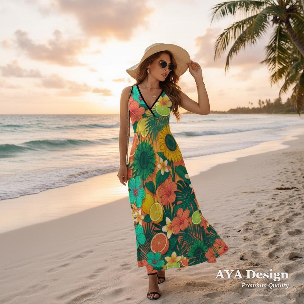 Close your eyes and imagine feeling the warm ocean breeze, sipping a cool drink, and looking absolutely effortless. Whether you're strolling barefoot along a sandy beach, exploring a tropical resort, or just wanting to bring a splash of sunshine to your everyday errands, this Vibrant Tropical Citrus & Floral Maxi Dress is your new go-to.