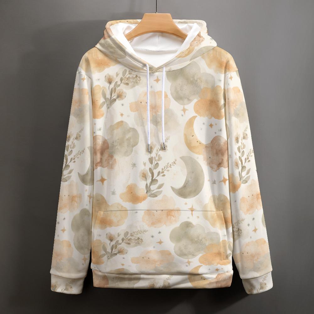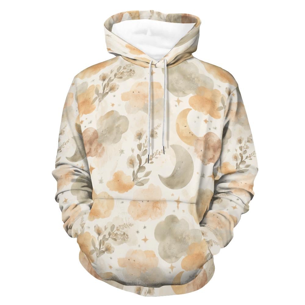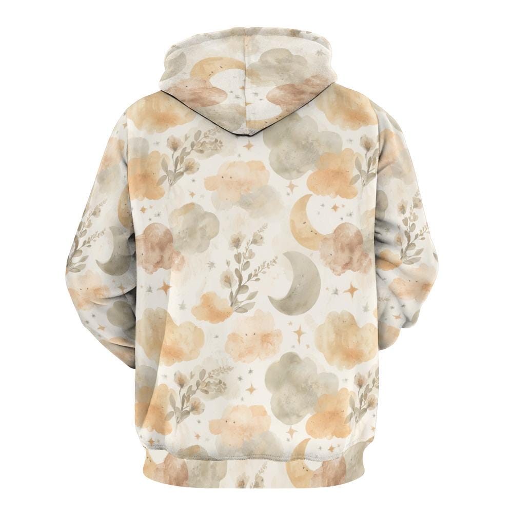 Wrap yourself in the comfort of a dreamy, starlit sky. Featuring a breathtaking all-over watercolor print of crescent moons, soft fluffy clouds, and delicate botanical leaves, this boho hoodie is designed for those chilly mornings, quiet coffee moments, and warm embraces.