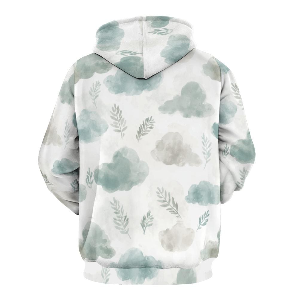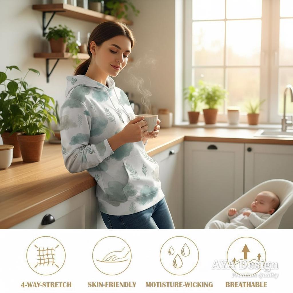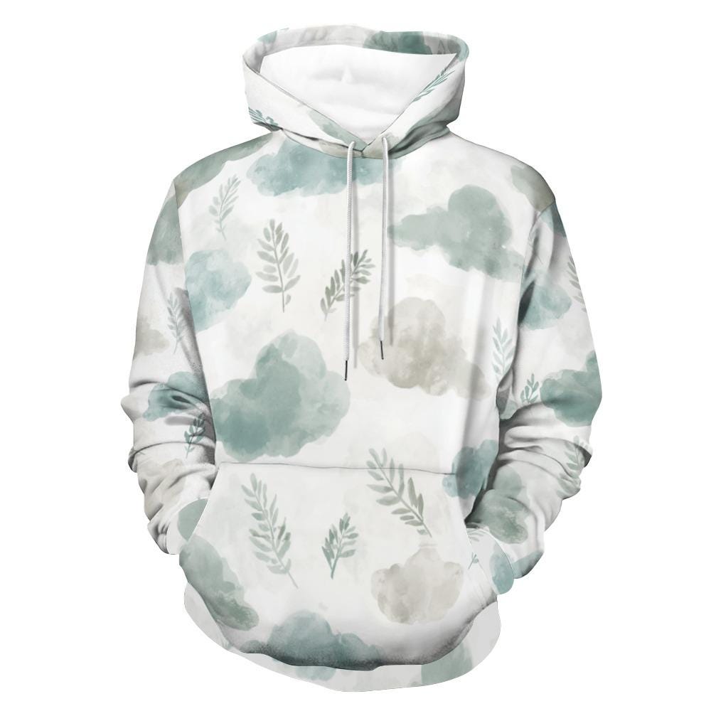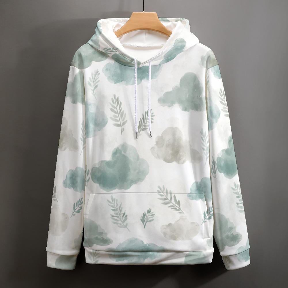 Featuring a delicate, nature-inspired pattern of sage green leaves and soft watercolor clouds, this hoodie brings a touch of calm to your busy life. Whether you are lounging at home, running errands, or enjoying a peaceful walk in the park, this pullover effortlessly blends timeless cottagecore aesthetics with premium, breathable comfort.
