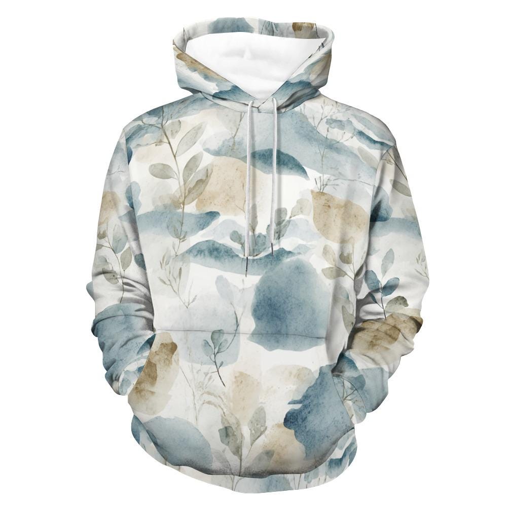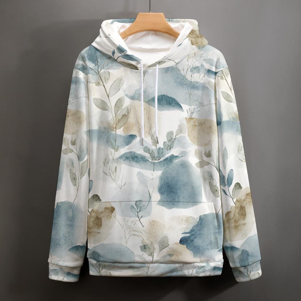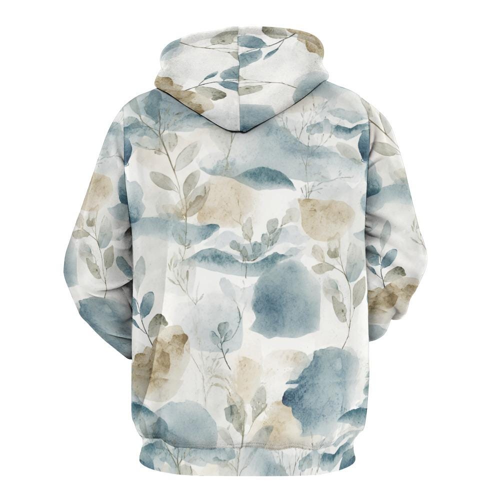 Featuring a beautifully serene, hand-painted style watercolor print of soft eucalyptus leaves and abstract earth tones, this hoodie brings a touch of nature's tranquility to your everyday wardrobe. The loose, forgiving fit drapes beautifully on all body types, making it the ultimate comfort piece for mothers, nature lovers, and anyone who cherishes the "slow living" aesthetic.