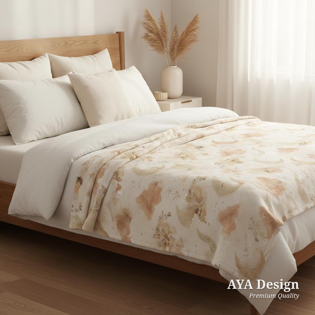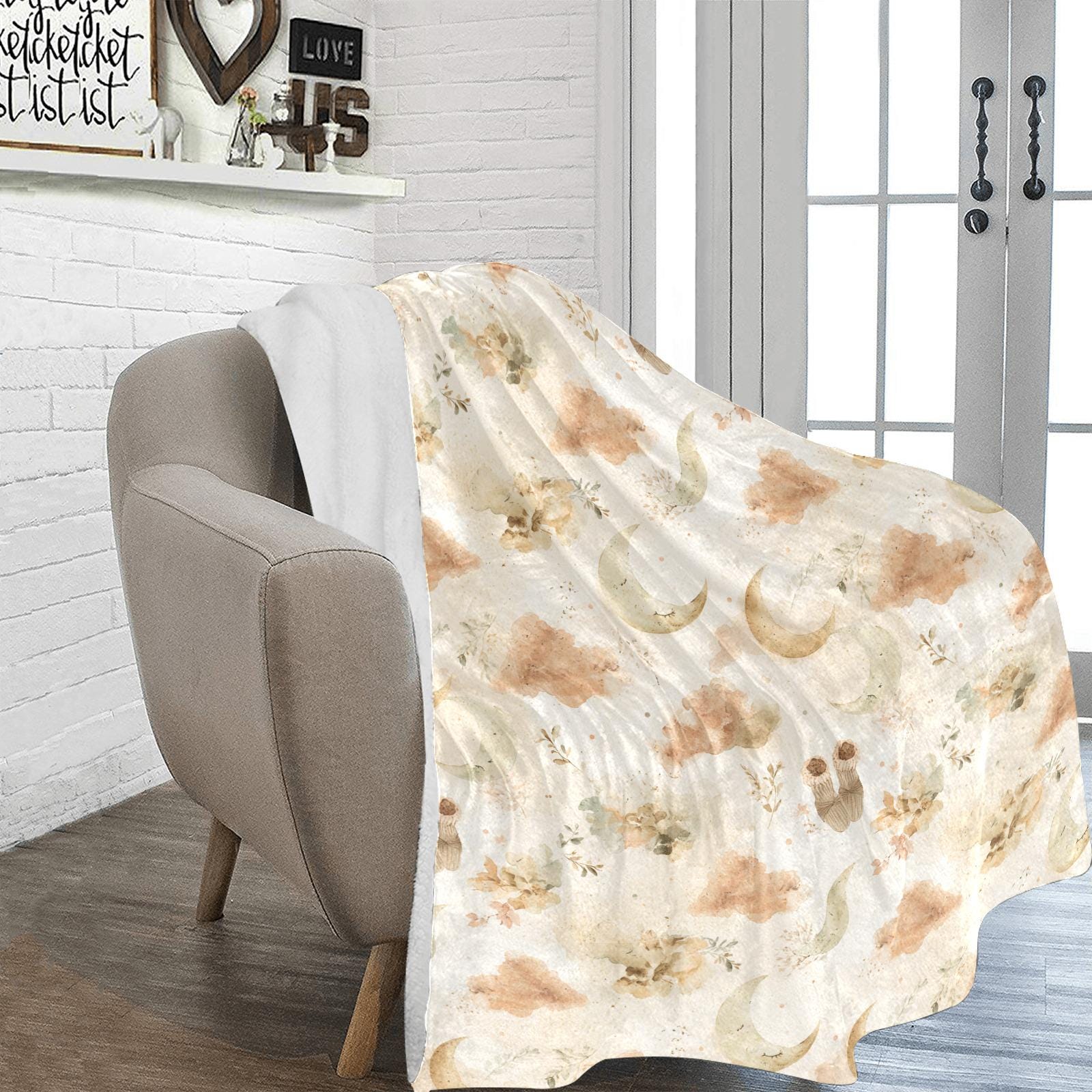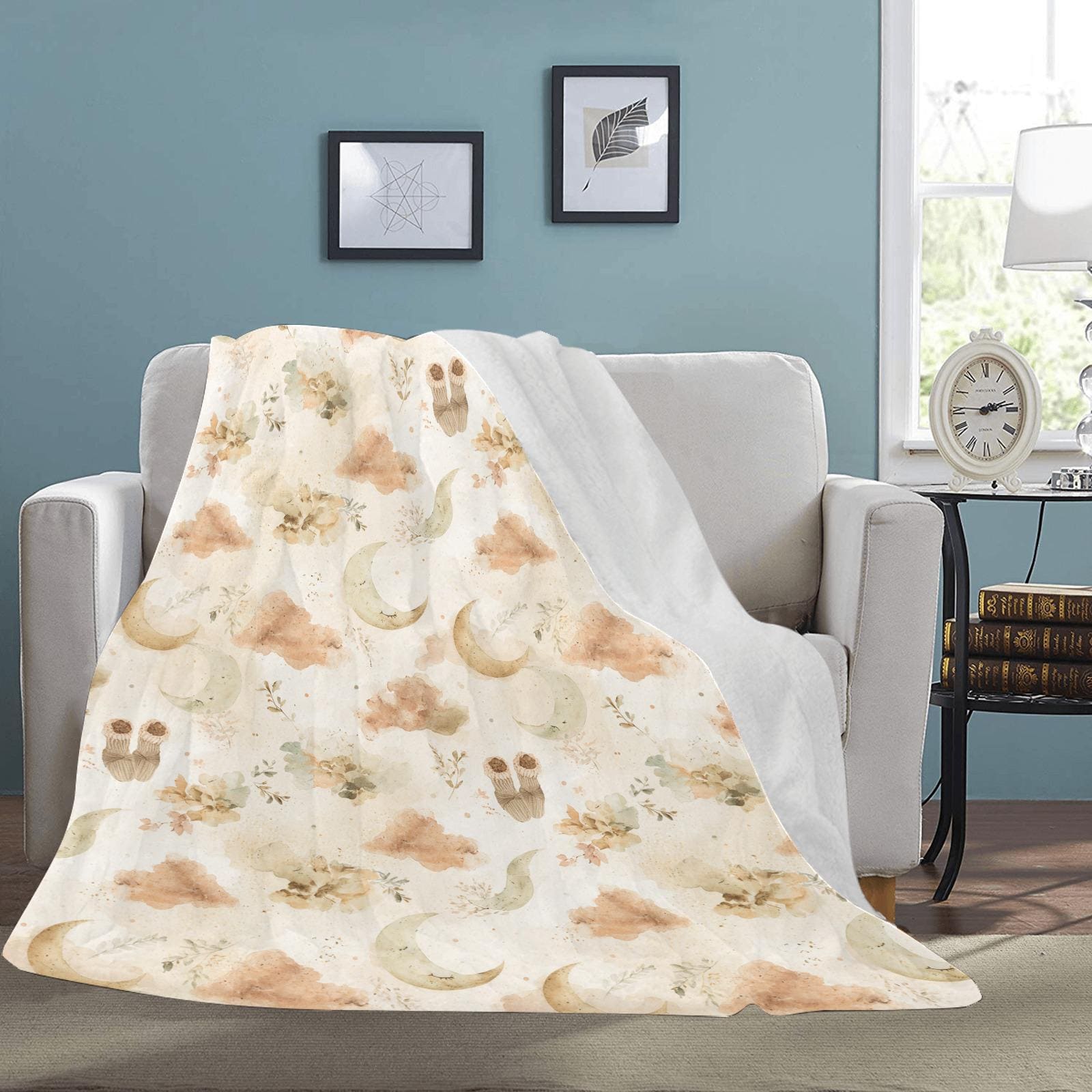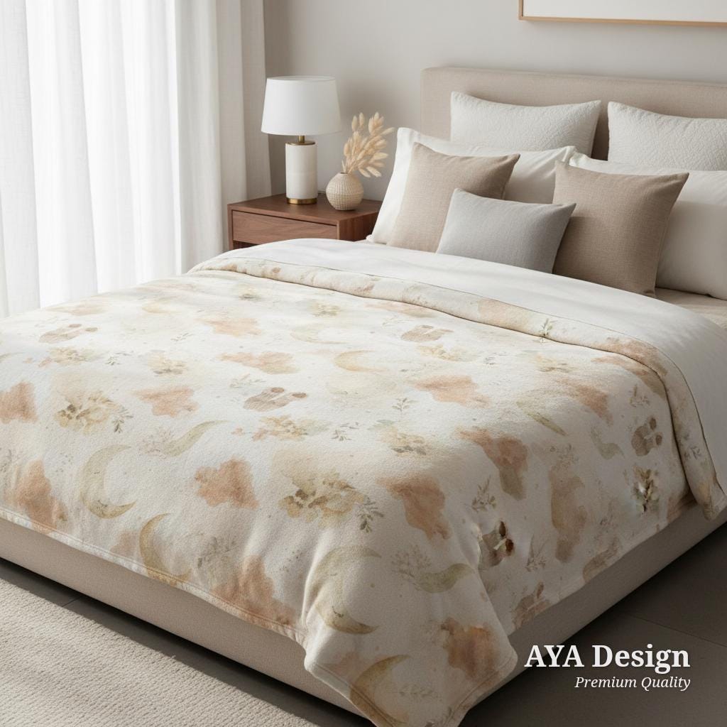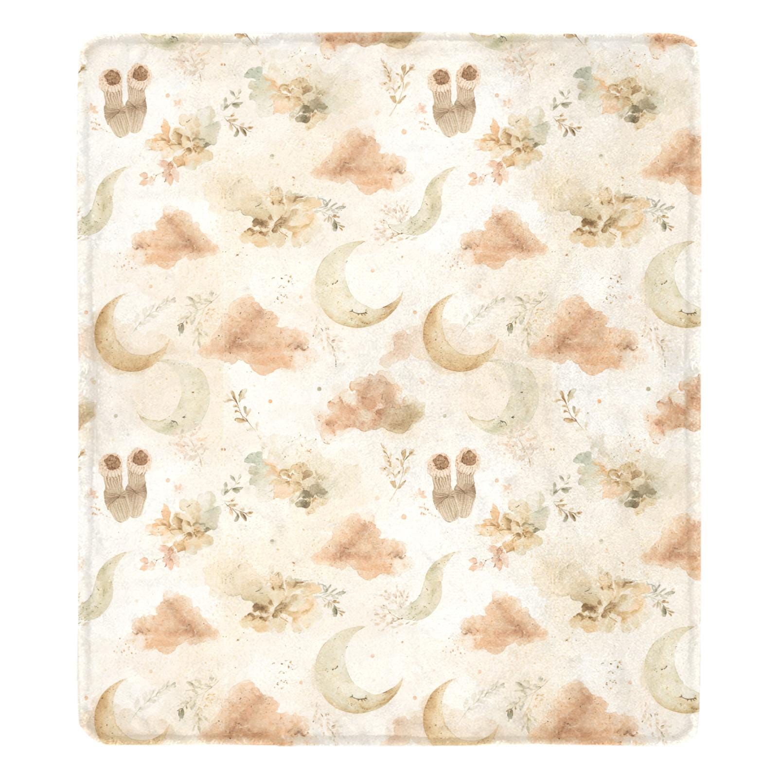 Featuring a gentle, gender-neutral watercolor design, this blanket is sprinkled with sleeping crescent moons, soft earthy clouds, delicate botanicals, and sweet little baby socks. The calming beige and cream color palette makes it an ideal match for boho, minimalist, cottagecore, or celestial nursery themes.
