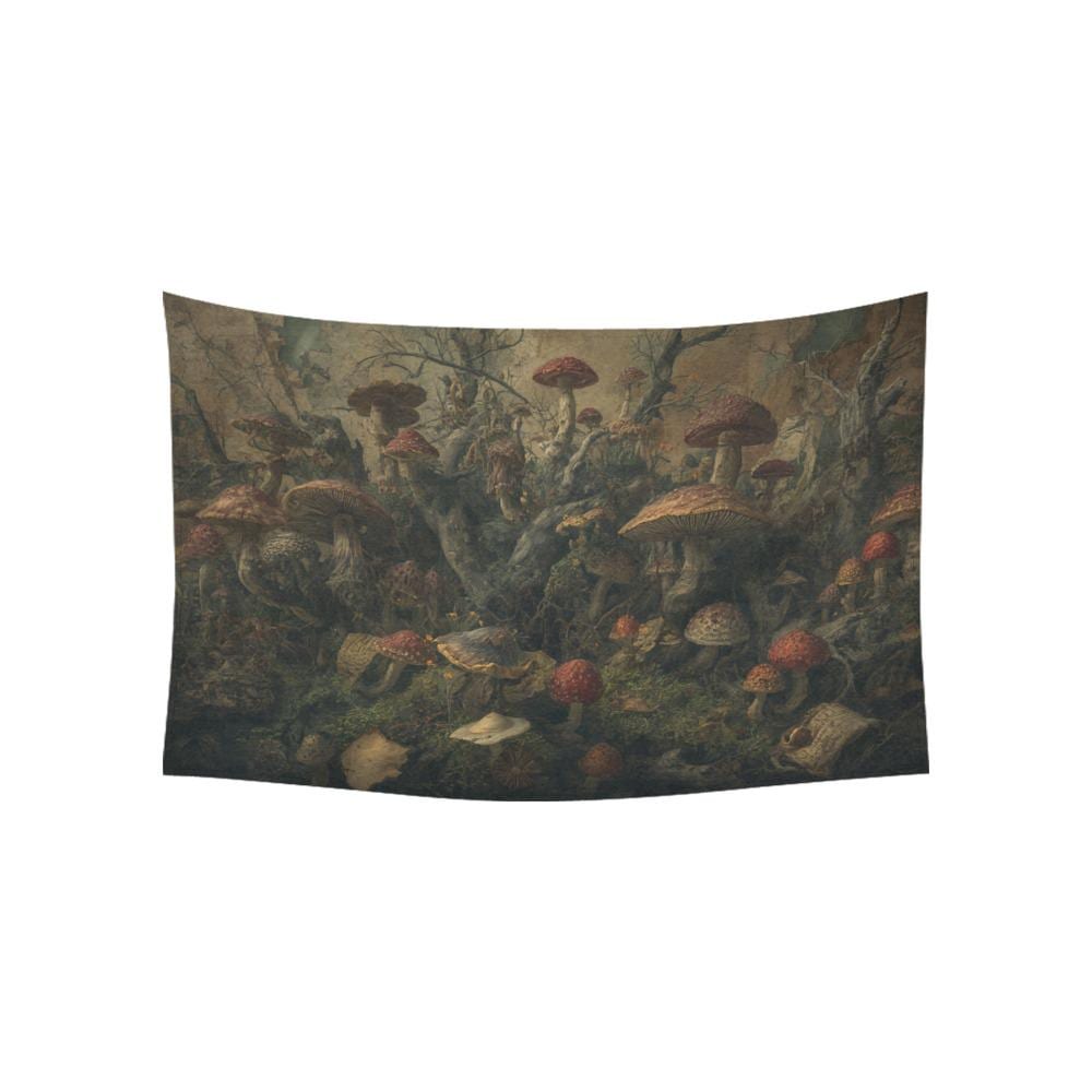 Step into a world of shadowed forests and arcane knowledge. This maximalist Dark Academia tapestry is a portal to a mystical, moss-draped forest floor. Designed in the style of an intricate vintage 19th-century lithograph, this piece features a dense cluster of wild fungi, enchanting bioluminescent mushrooms, damp moss, and scattered antique parchment scraps.