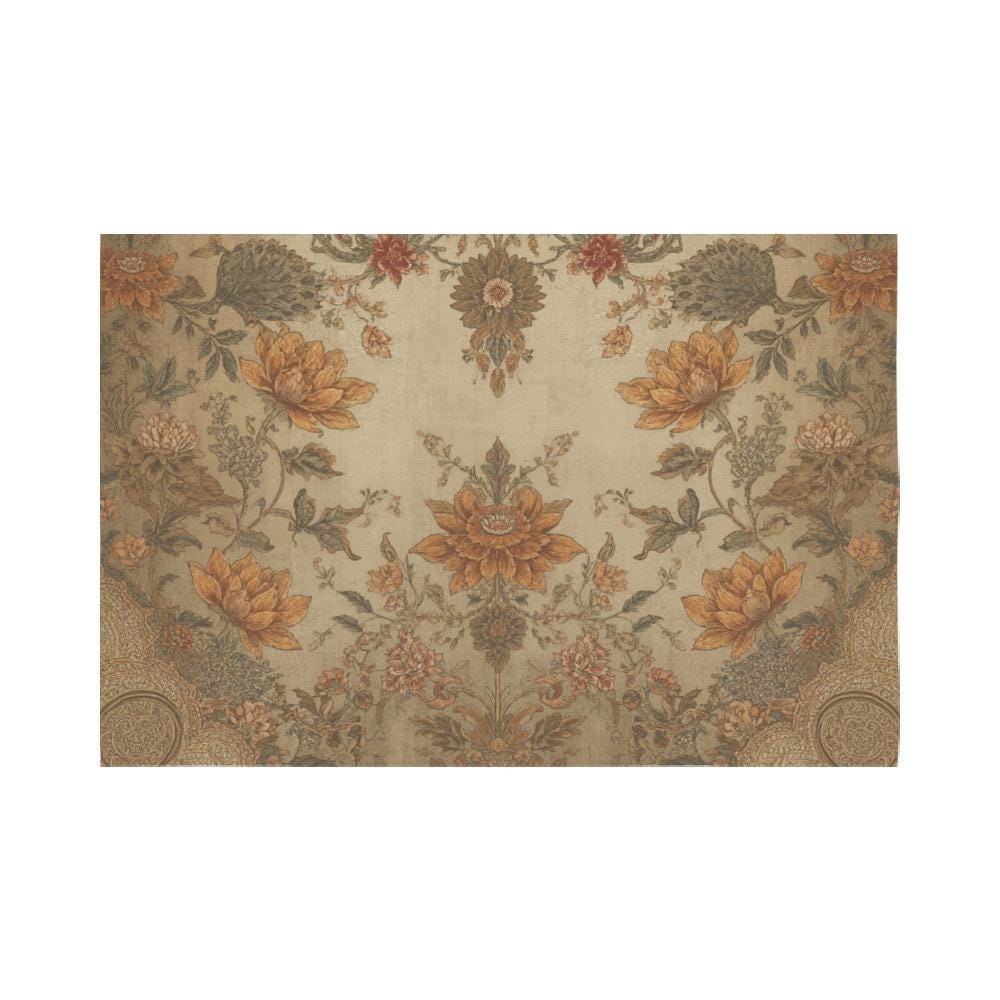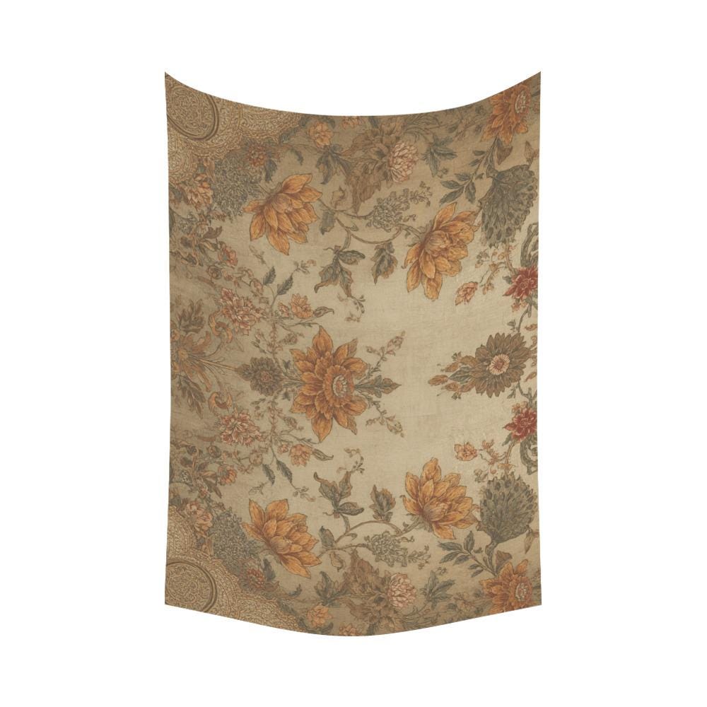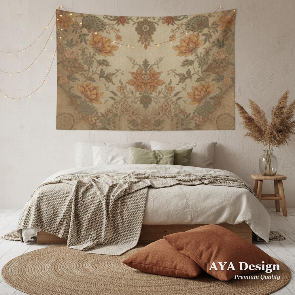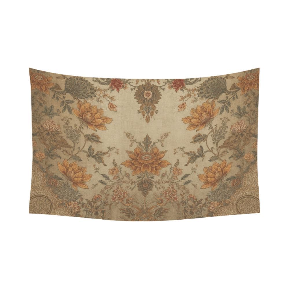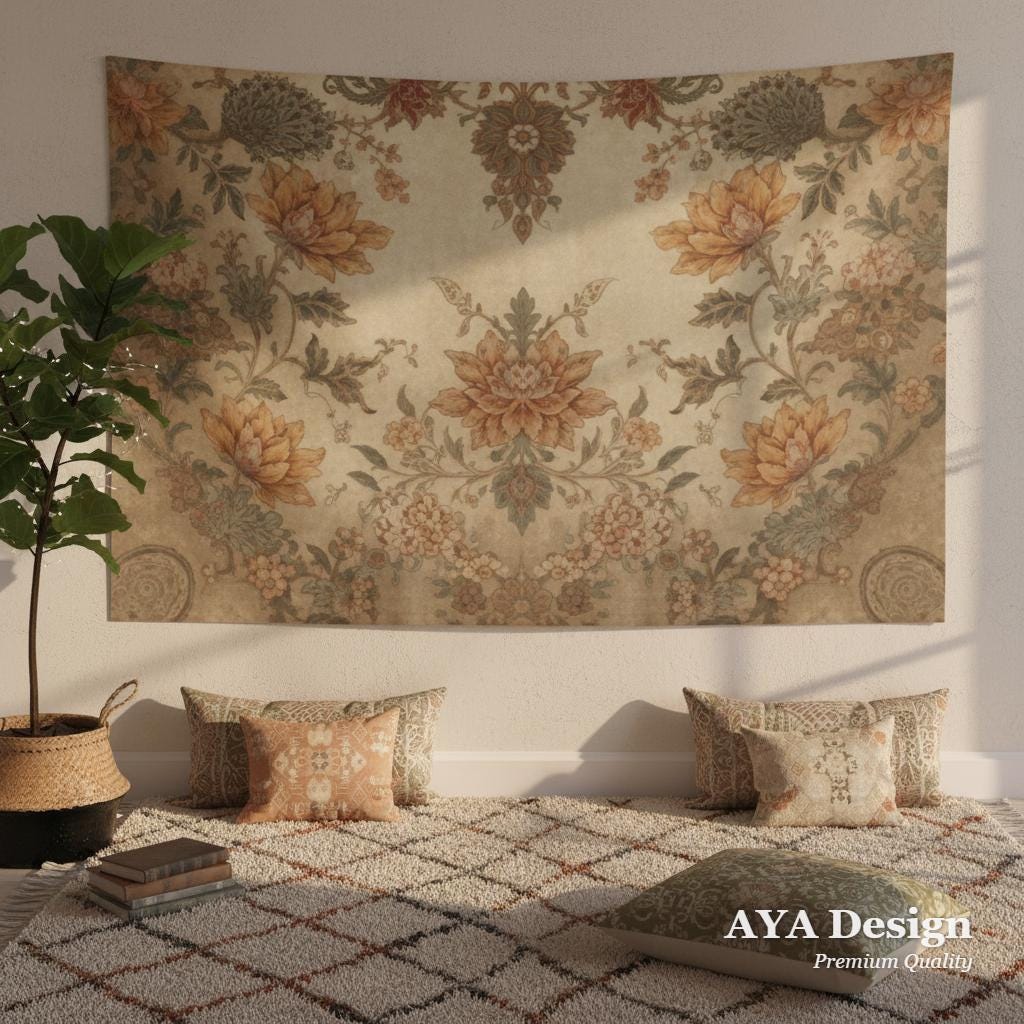 Imagine stepping into a room that immediately wraps you in the warmth and romance of a bygone era. Featuring intricate Persian-inspired botanical motifs and a rich palette of warm earthy tones—muted peach, rust, and sage green—this breathtaking vintage floral tapestry is the perfect statement piece to anchor your space.