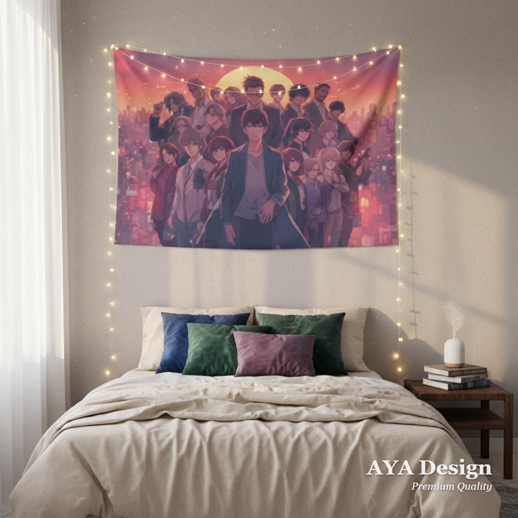 Featuring a breathtaking, high-definition print of an anime ensemble cast against a gorgeous cyberpunk-style sunset cityscape, this massive 90" x 60" tapestry completely changes the vibe of your room the second you hang it up. Whether you are creating the ultimate gaming den, setting up a sick background for your stream, or just making your dorm room feel like home, this tapestry brings your space to life.
