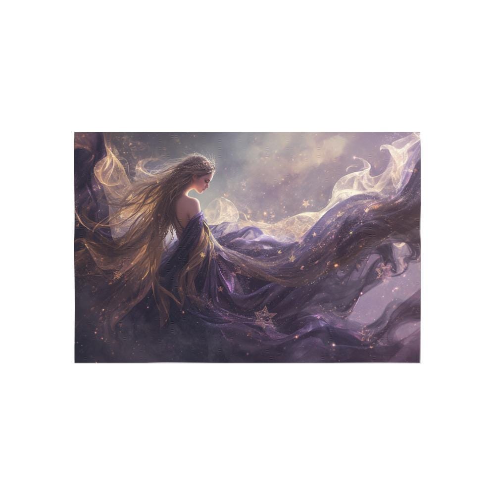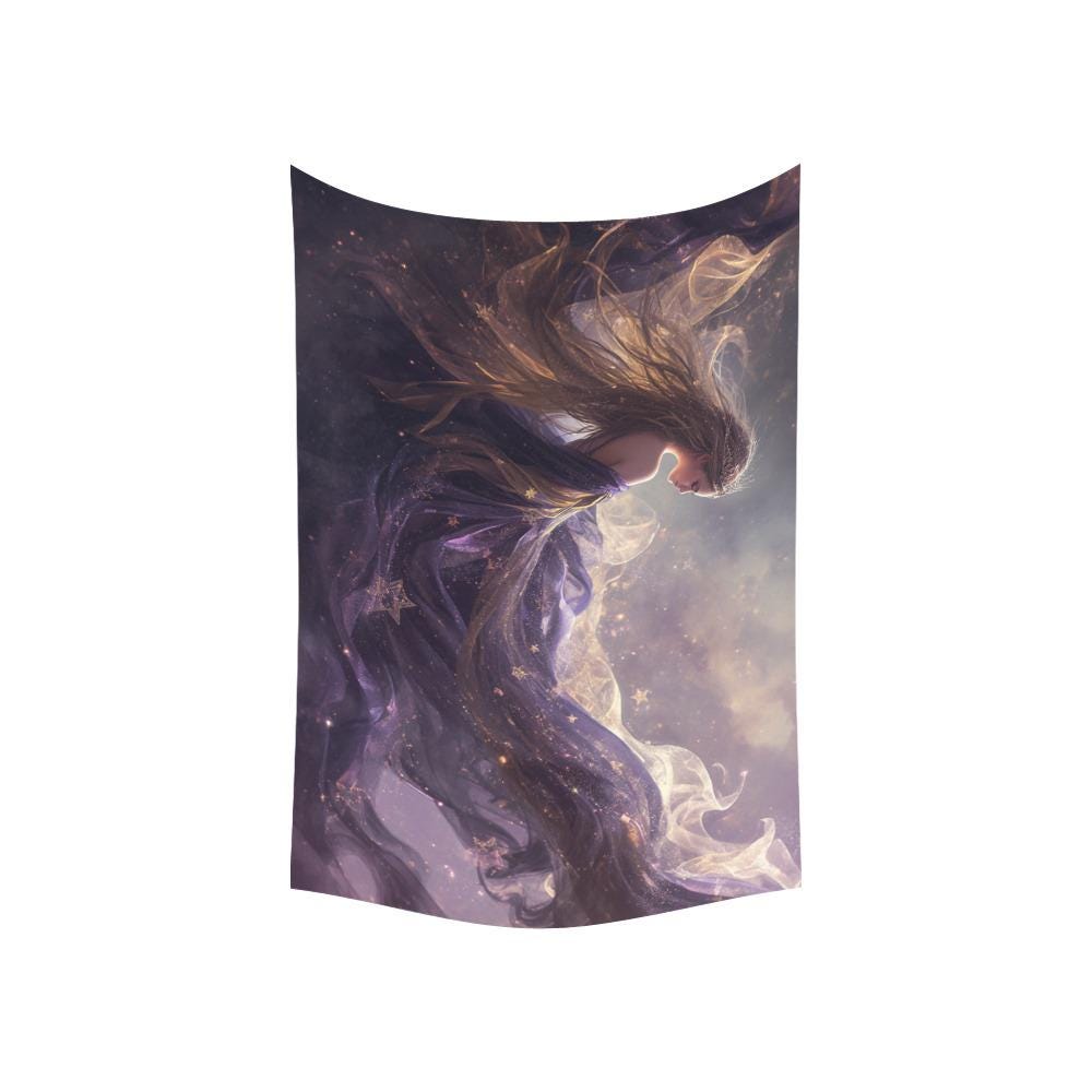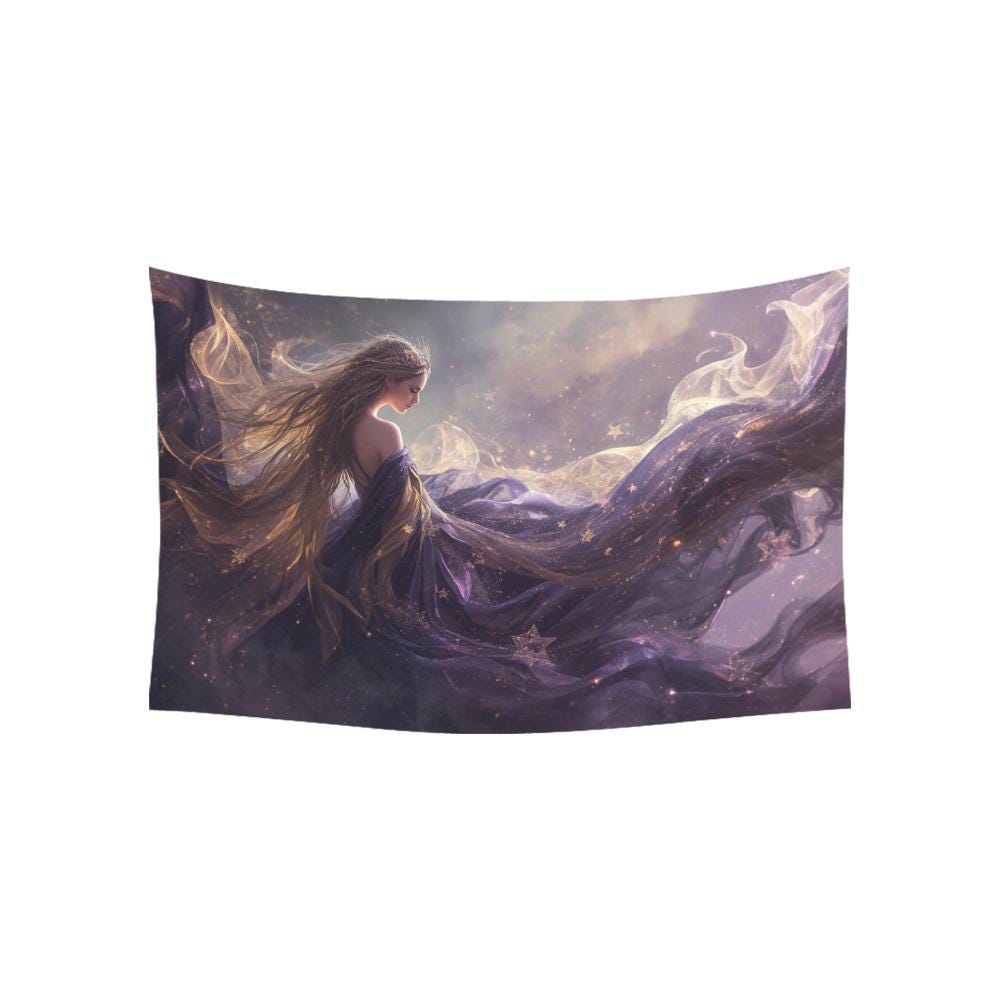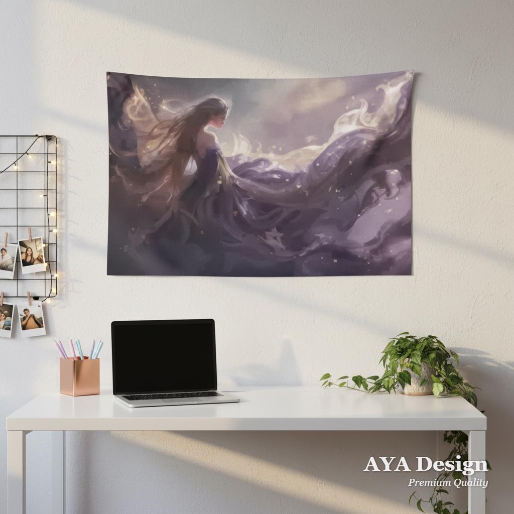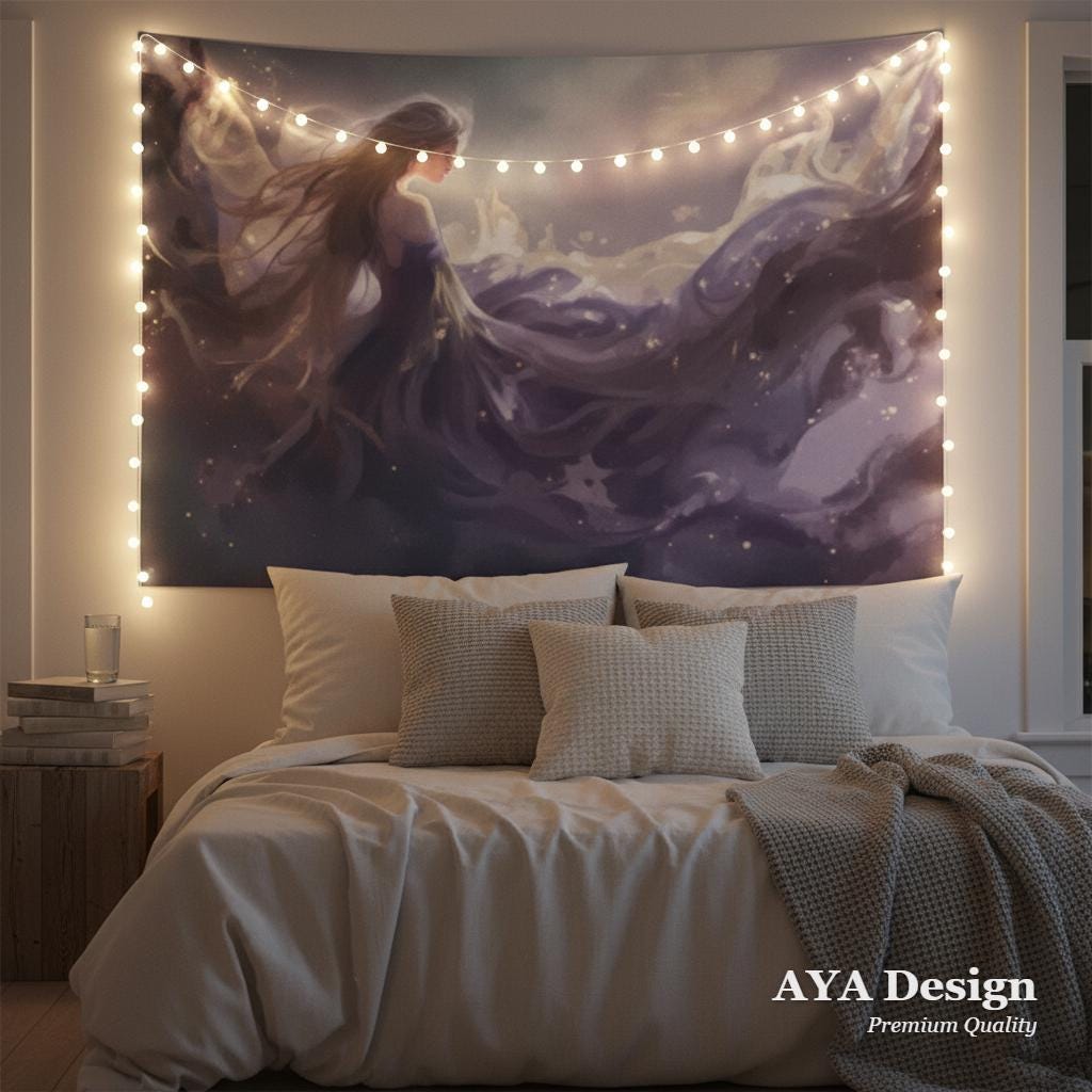 Have a blank wall that needs a touch of magic? Drift into a world of dreams, stars, and cosmic beauty with our Ethereal Celestial Goddess tapestry. Featuring a breathtaking, Art Nouveau-inspired fantasy illustration, this piece captures a dreamy starry night, flowing purple and gold fabrics, and the serene energy of a cosmic maiden.