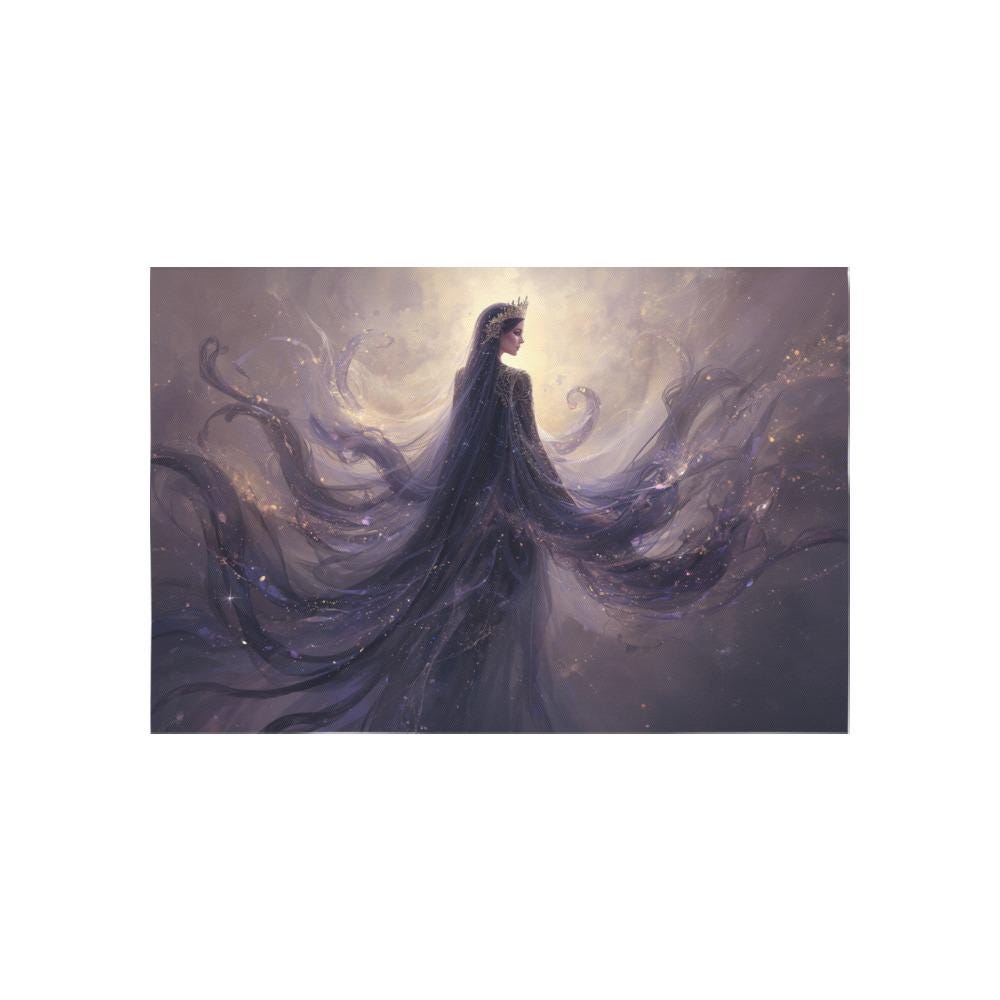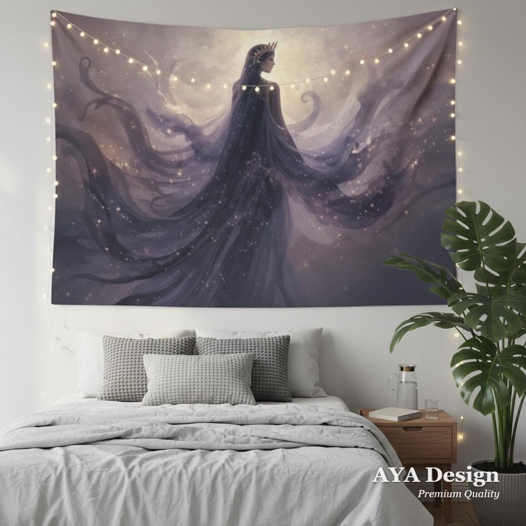 Designed for those who find peace in the shadows and magic in the stars, this tapestry features a fusion of flowing Alphonse Mucha-inspired linework and a mystical, ethereal queen. Whether you’re styling a Dark Academia study, a witchy bedroom, or a meditation corner, this piece adds an instant aura of mystery and sophistication.