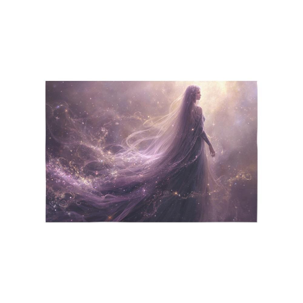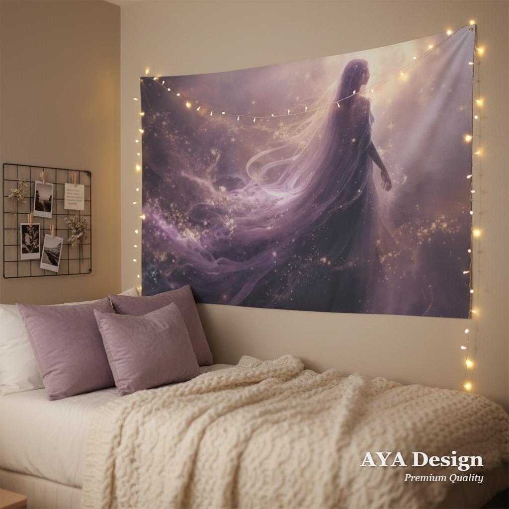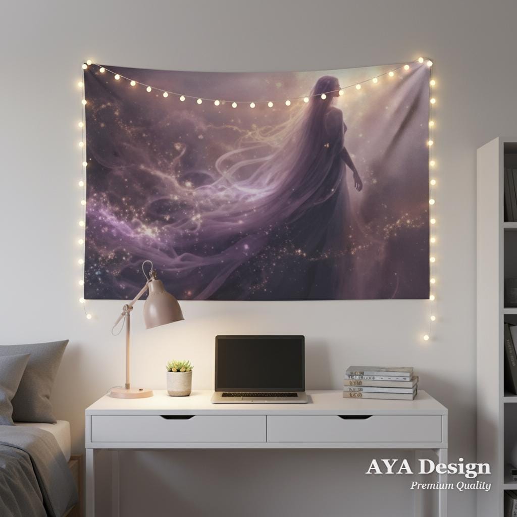 Escape the ordinary and step into a realm of pure magic. This breathtaking Ethereal Goddess Tapestry blends the whimsical beauty of an anime illustration with the elegant, flowing lines of Art Nouveau. Featuring a stunning celestial maiden wandering through a starlit purple nebula, this piece isn’t just wall decor—it’s a portal to a fantasy world.