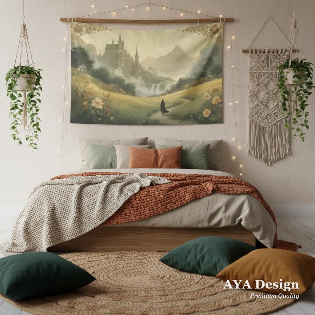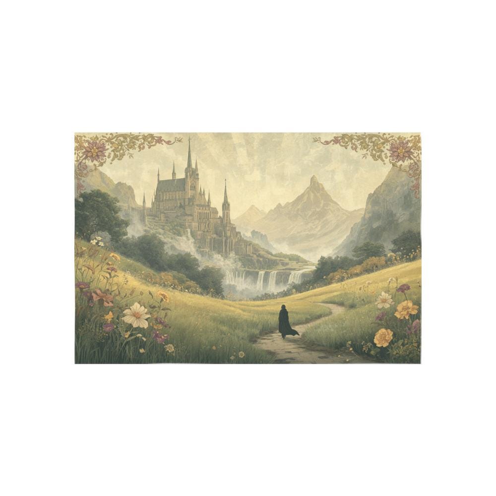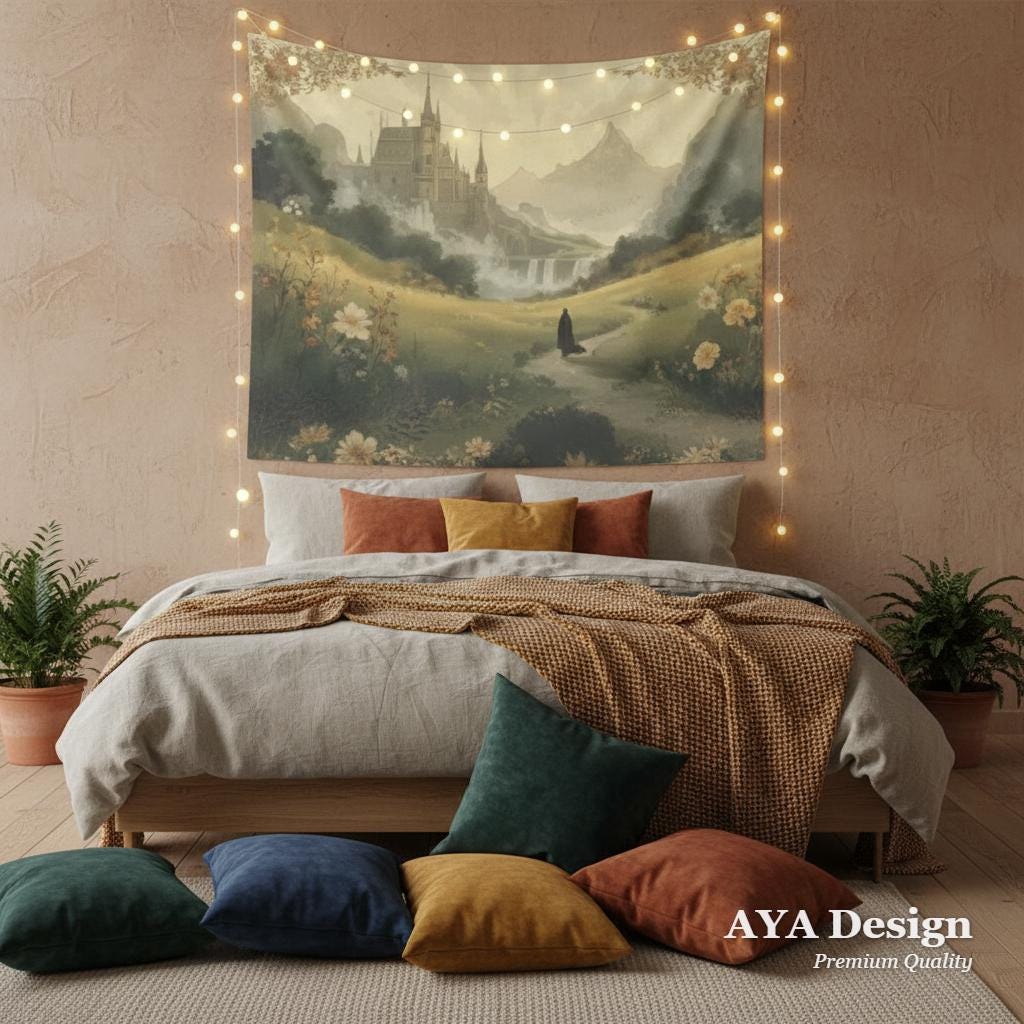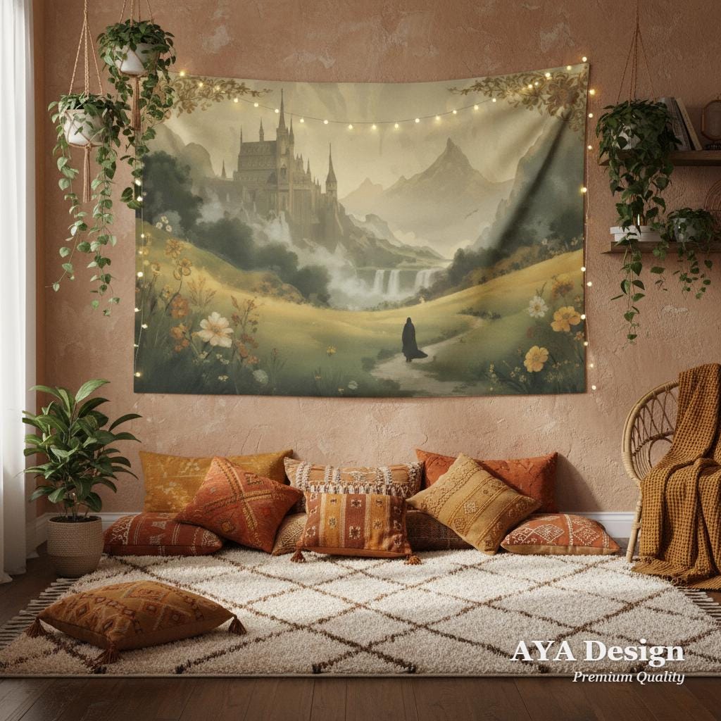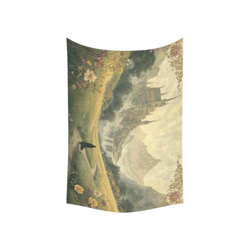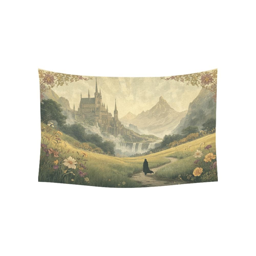 Transform your space into a realm of magic, wanderlust, and untamed beauty. Featuring a lone wanderer walking through a lush, sun-dappled meadow toward a majestic, towering citadel, this "Fantasy Fellowship Journey" tapestry feels like a page pulled straight from a vintage storybook.