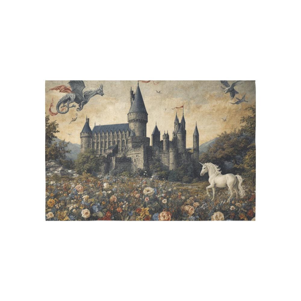 🐉 Epic Storytelling Design: Featuring a majestic medieval castle, a soaring dragon, and a graceful unicorn amidst a vintage floral meadow.