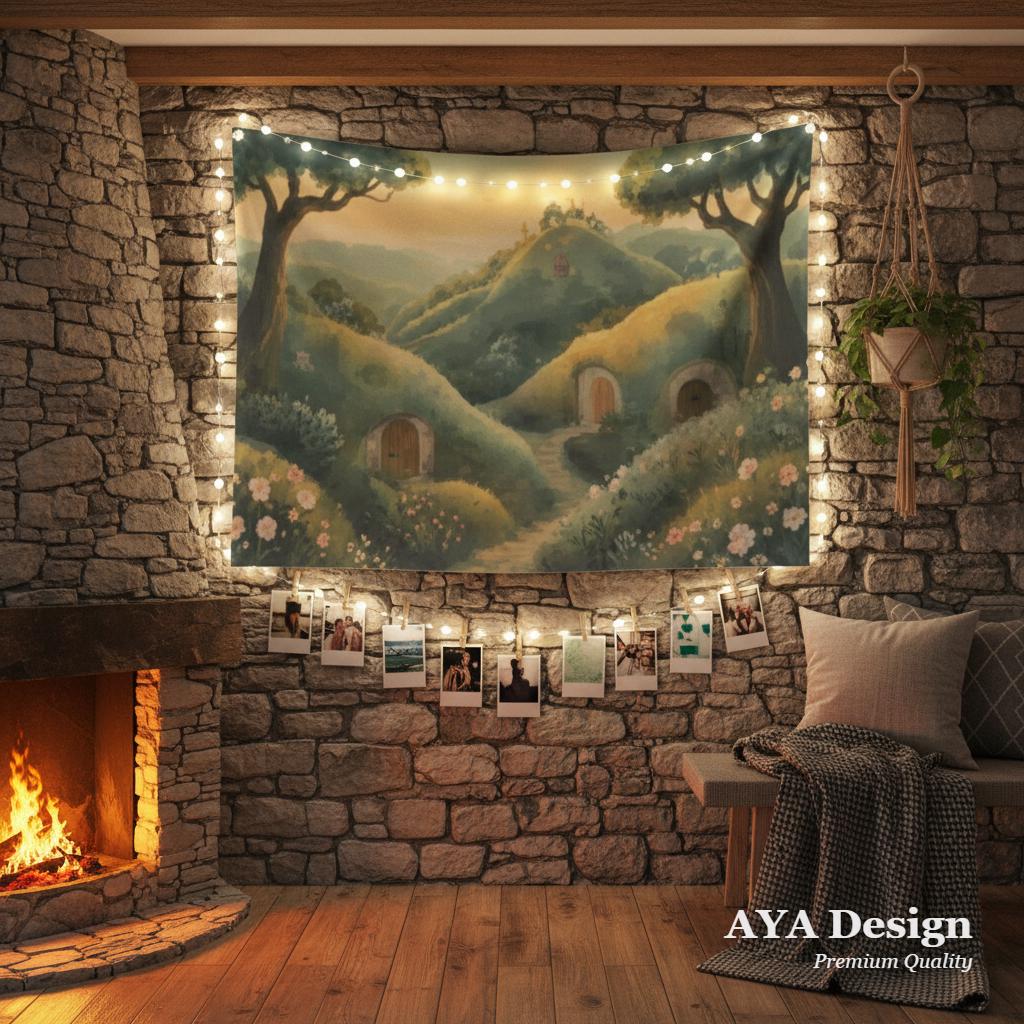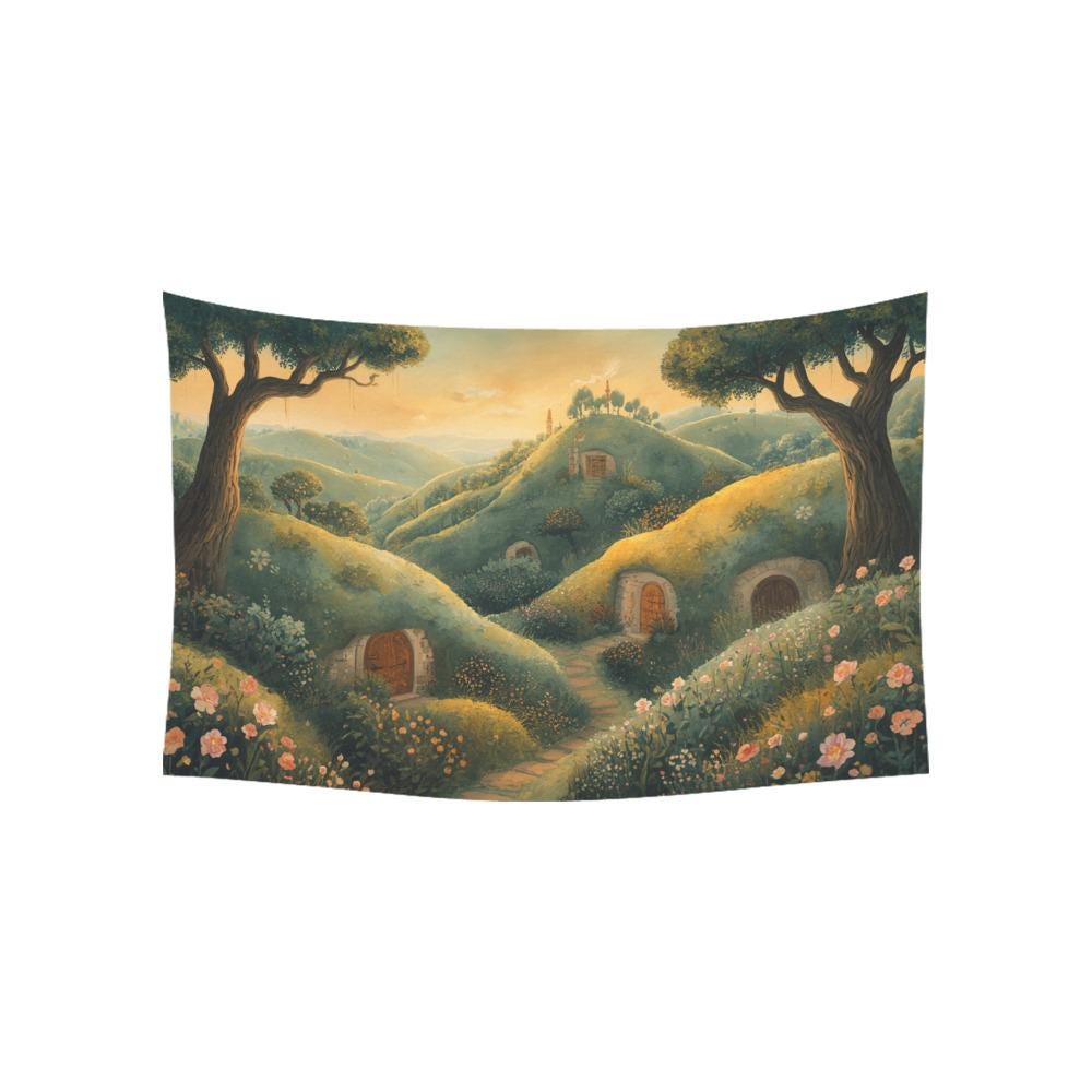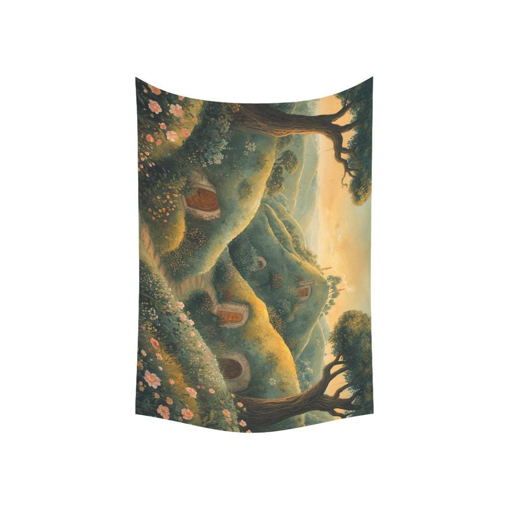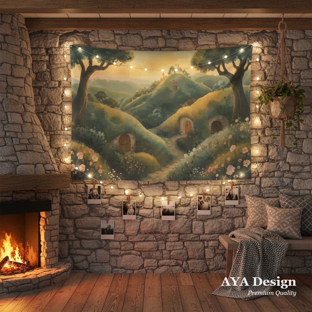 Bring the peaceful charm of a hidden halfling village straight into your home with our "Hobbit Valley at Golden Hour" Tapestry. Featuring rolling green hills, blooming wildflowers, whimsical round doors, and the warm, nostalgic glow of a sunset, this tapestry isn't just wall art—it’s a window to a more peaceful, magical world.