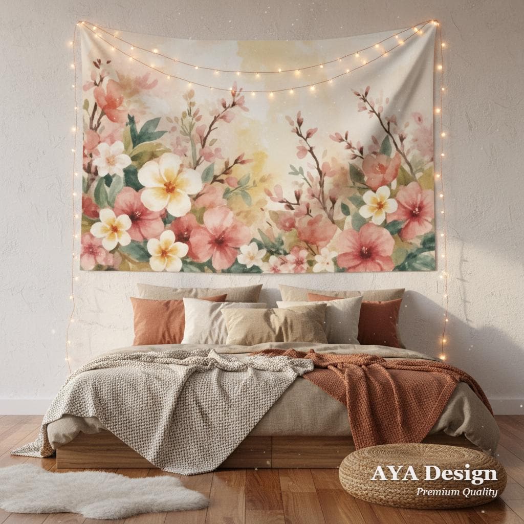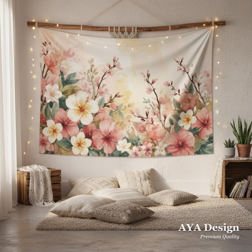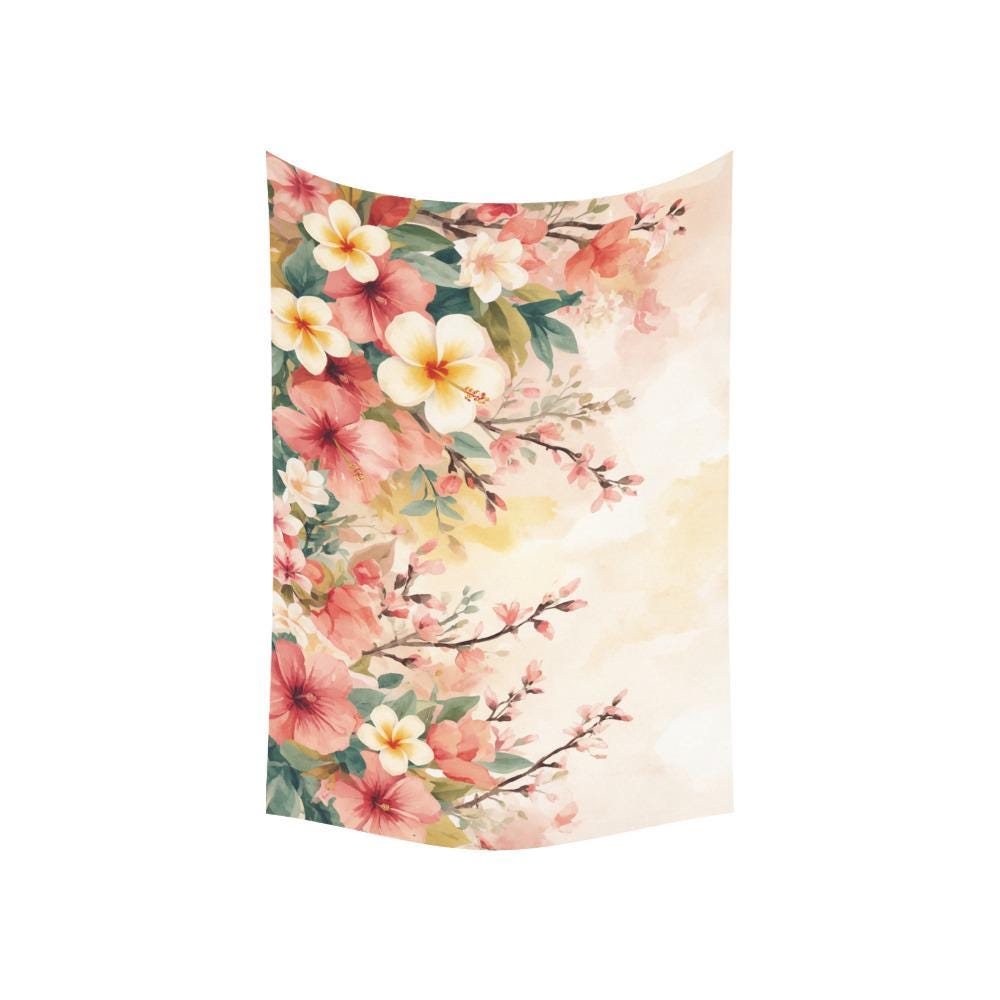 Are you tired of staring at blank, uninspiring walls? Instantly breathe life, warmth, and tranquility into your room with our ethereal Watercolor Tropical Floral Tapestry. Featuring a dreamy blend of delicate cherry blossoms, vibrant tropical hibiscus, and sweet plumeria against a warm pastel background, this tapestry acts as a giant window to a serene, sunlit garden.