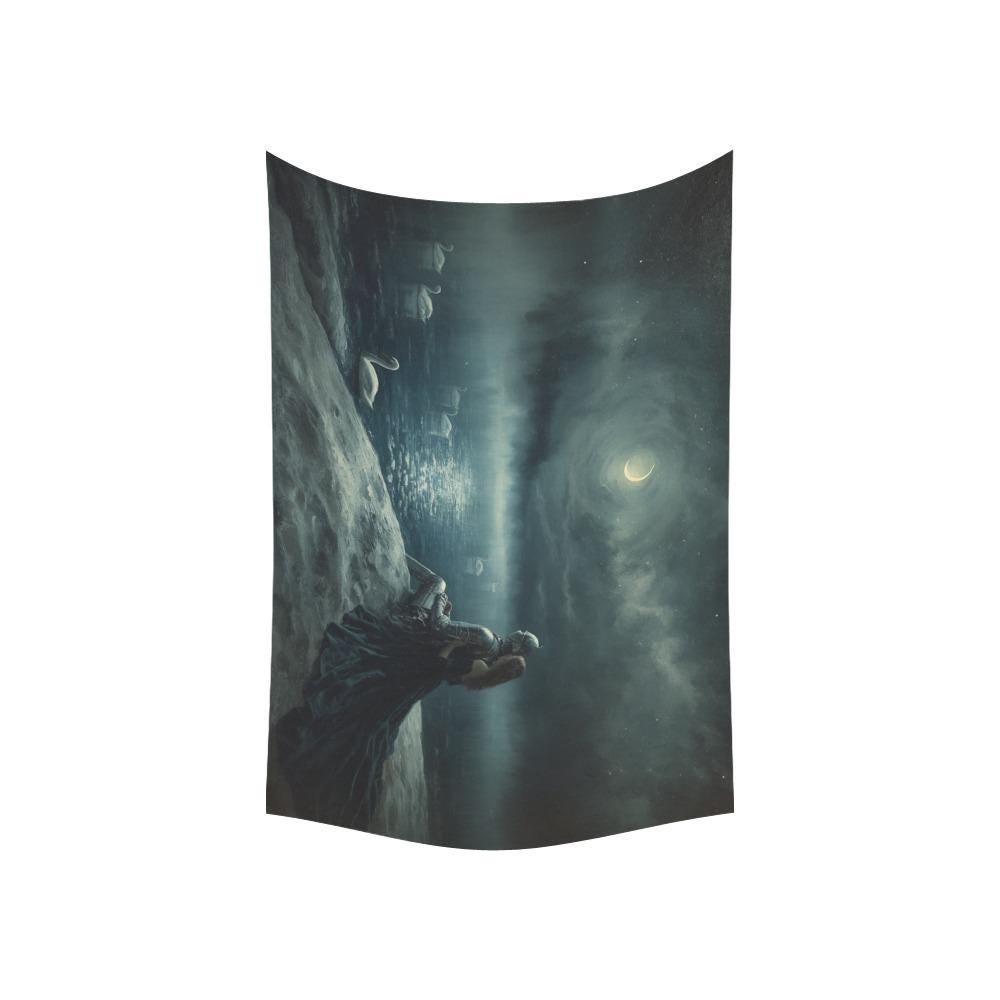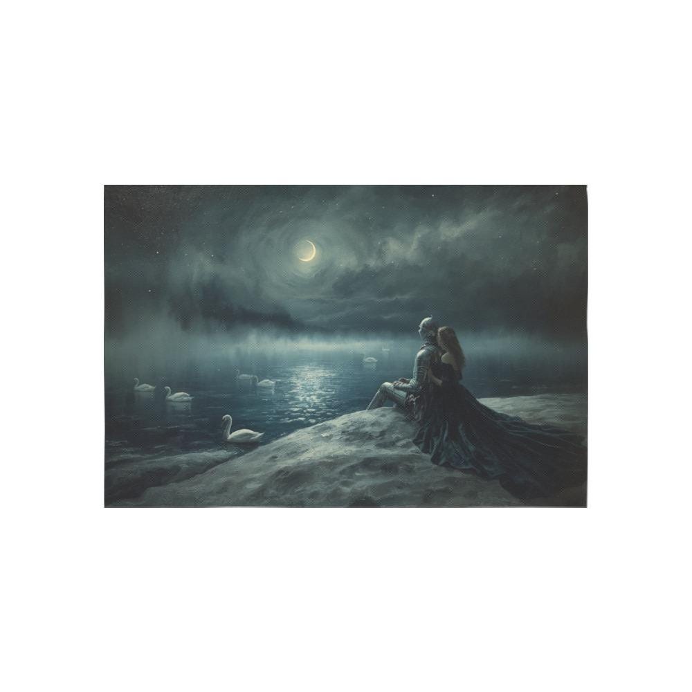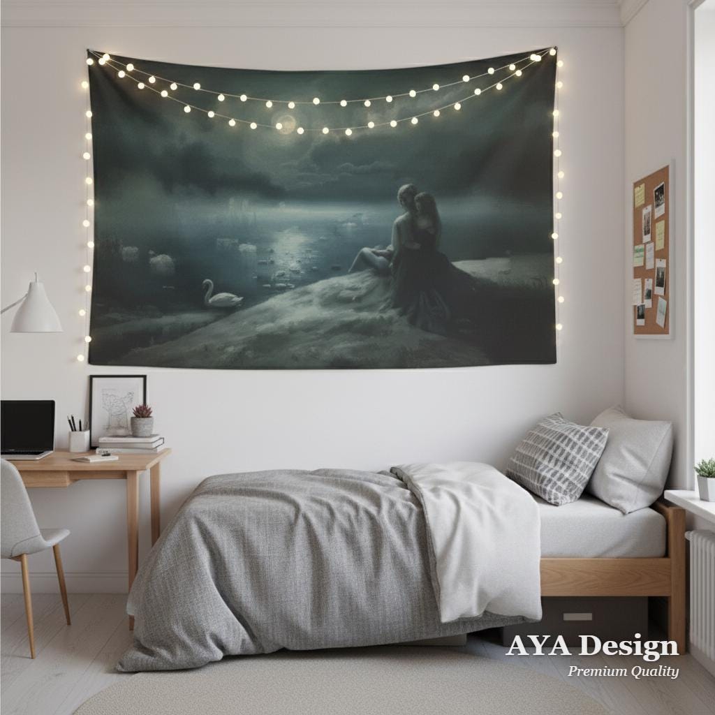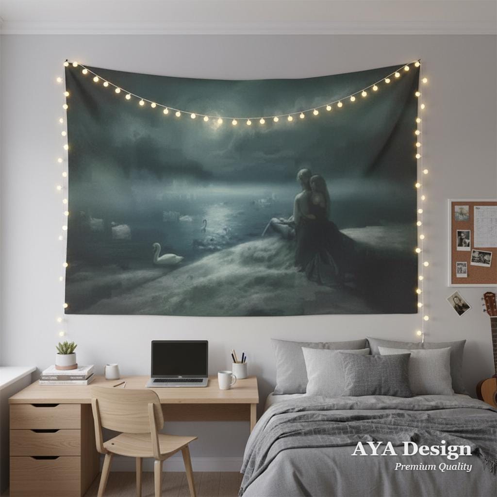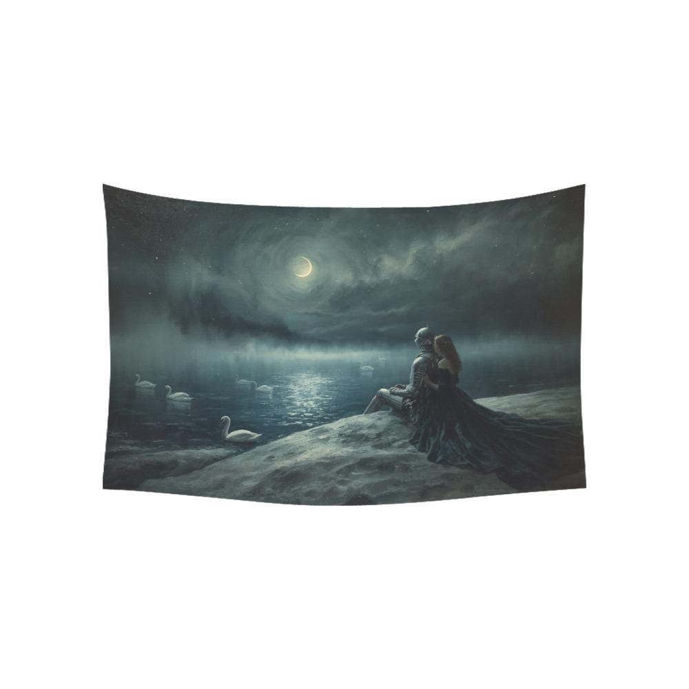 Transform your sanctuary into a scene from a forgotten legend. This "Swan Lake" inspired tapestry captures the quiet, powerful devotion of a knight and his lady under the silver glow of a crescent moon. As the mist rolls over the water and white swans glide in silent witness, this piece brings a sense of ancient romance and protective peace to any room.