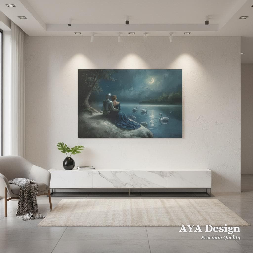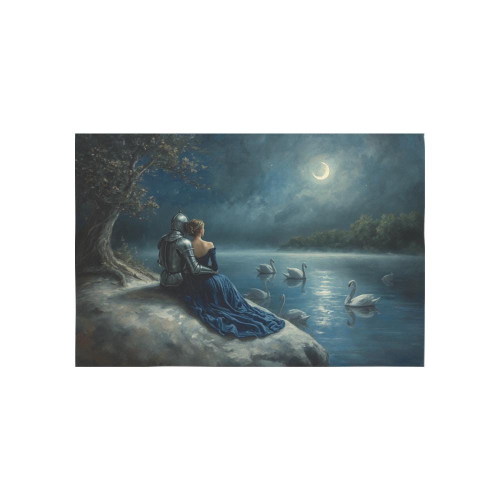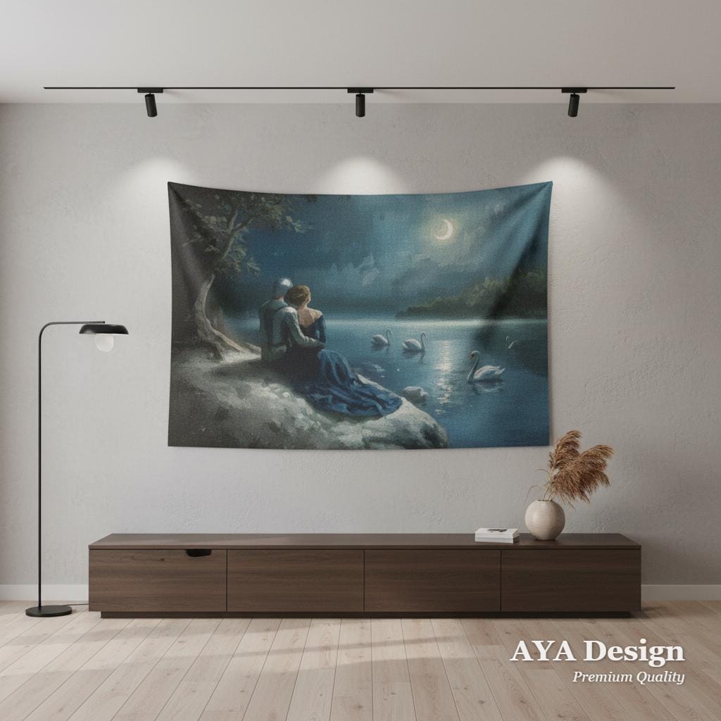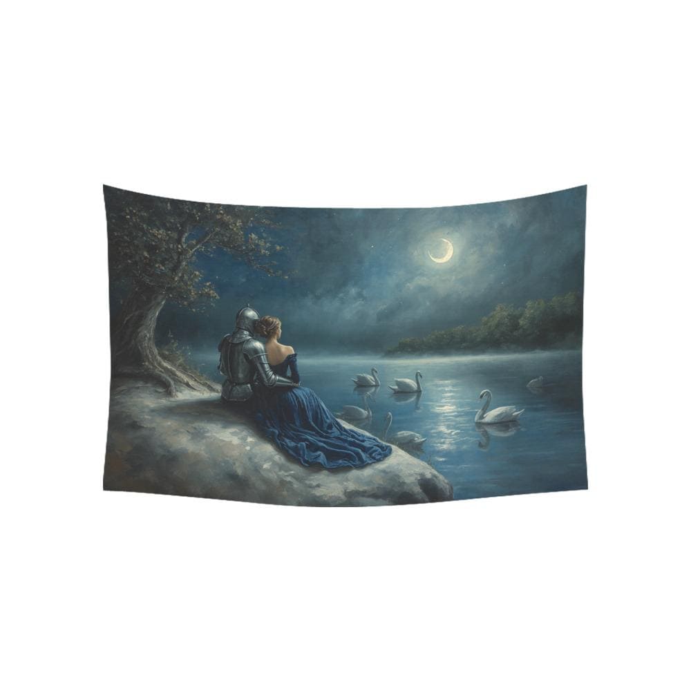 Step into a world of magic, chivalry, and timeless love with our "Moonlit Swan Lake" tapestry. Featuring a breathtaking medieval scene of a knight in shining armor and his beloved sitting by a misty, swan-filled lake under a crescent moon, this tapestry is an absolute dream for fantasy lovers and hopeless romantics alike.