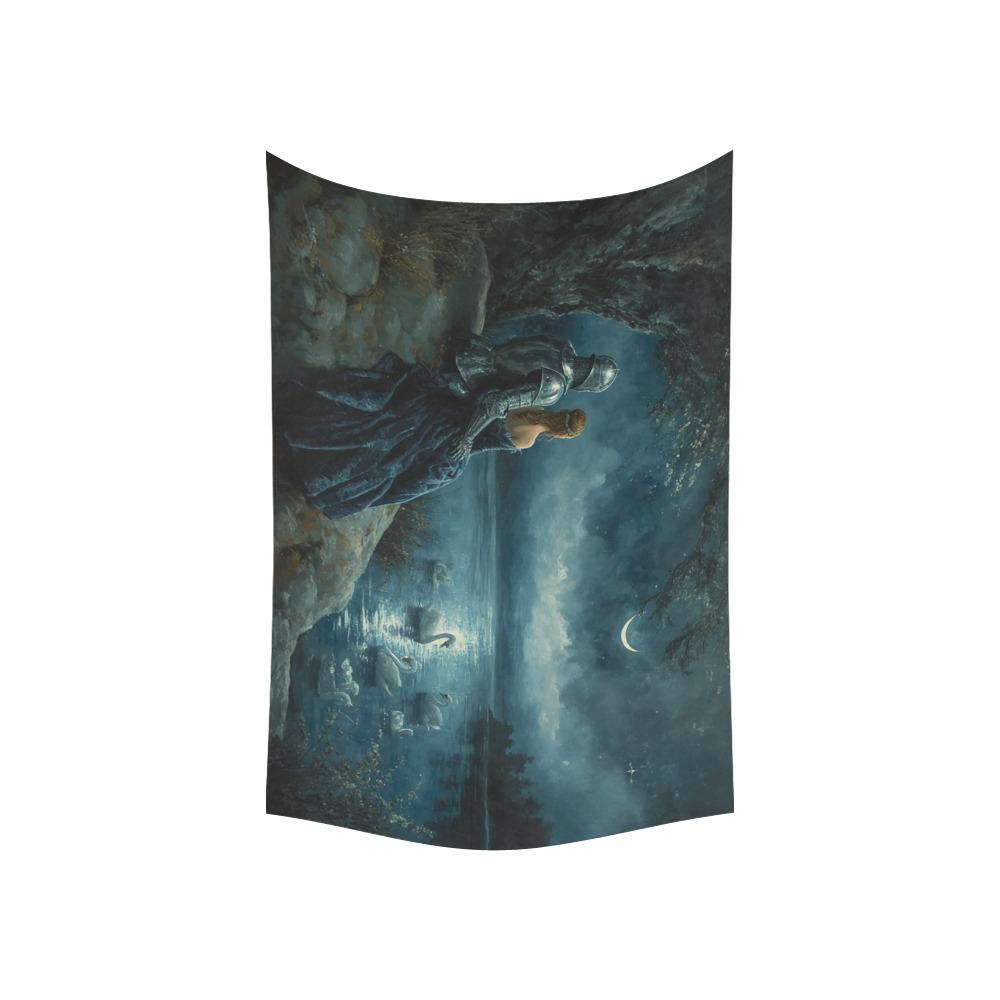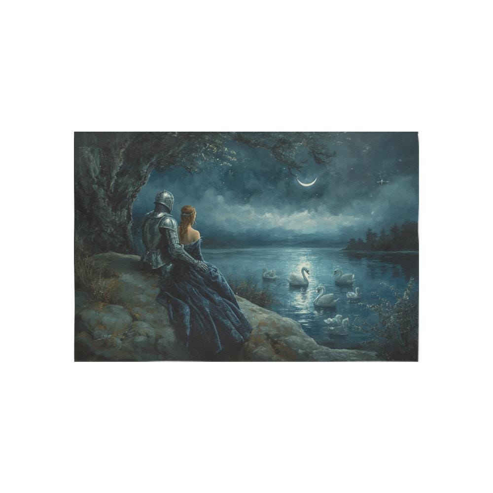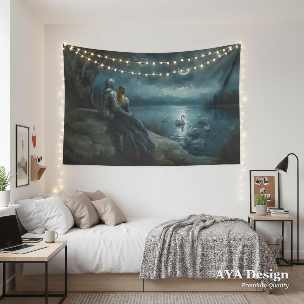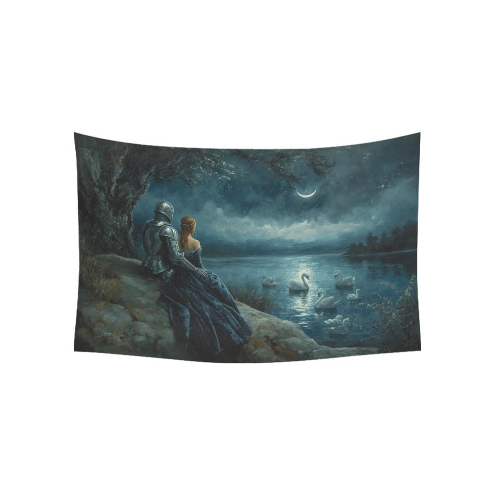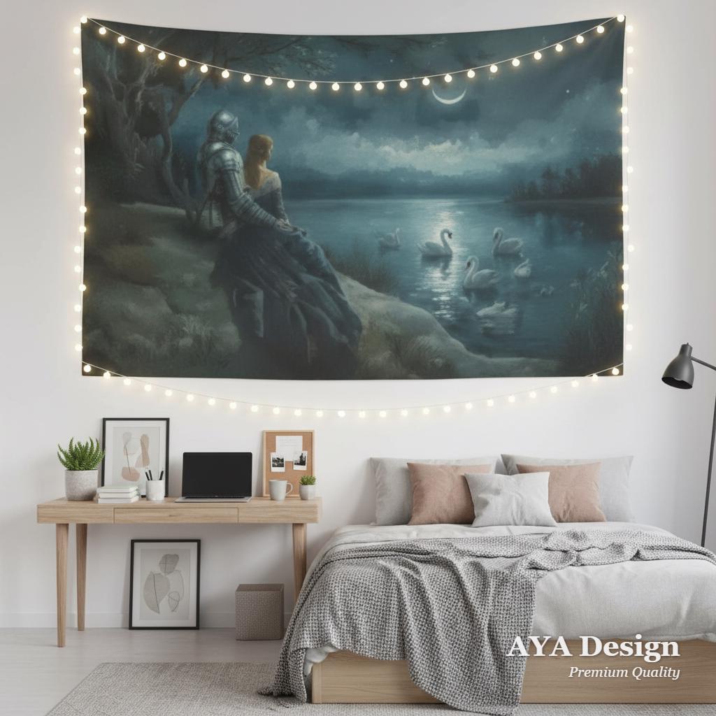 Transform your sanctuary into a scene from a forgotten legend. This "Swan Lake" inspired tapestry captures the quiet, moonlit moment between a silver-clad knight and his princess as they overlook a misty lake filled with ethereal swans. Whether you are a lover of Arthurian lore, a fan of romantic fantasy novels, or simply someone who finds peace in the glow of a crescent moon, this wall hanging brings a touch of magic to any room.