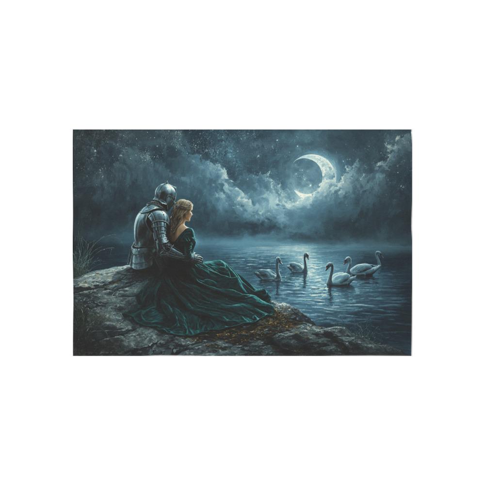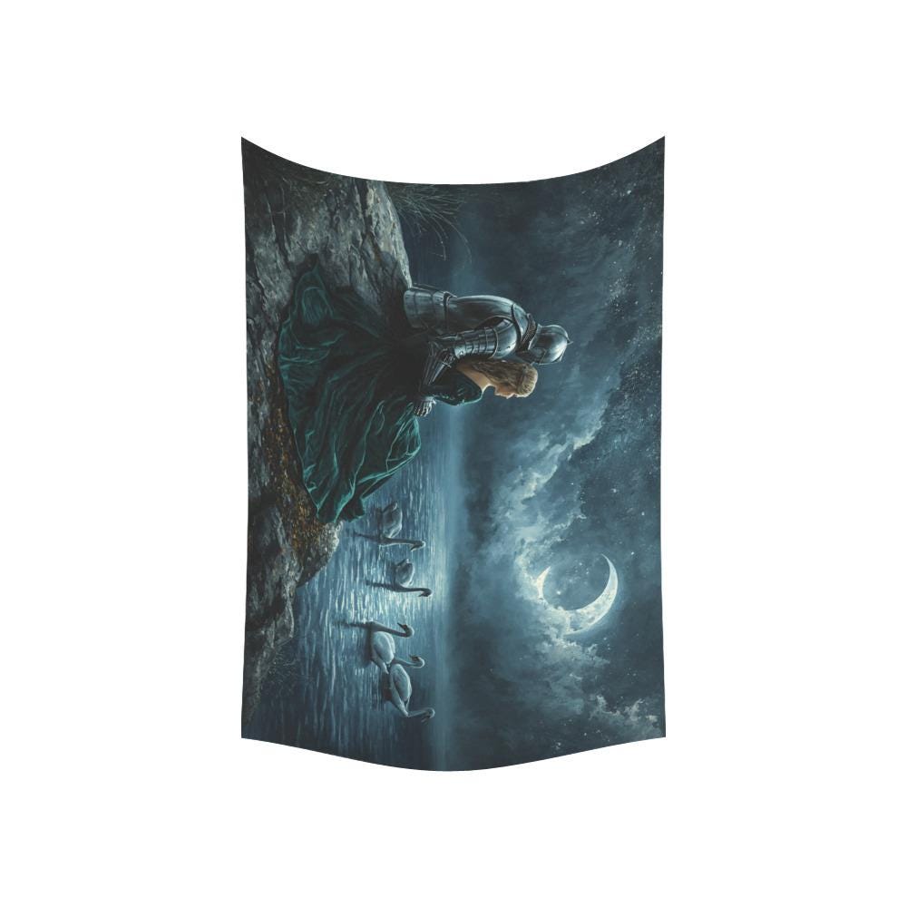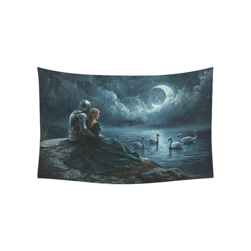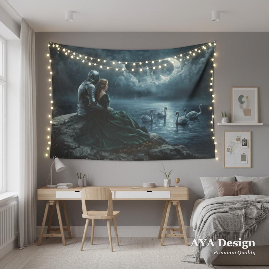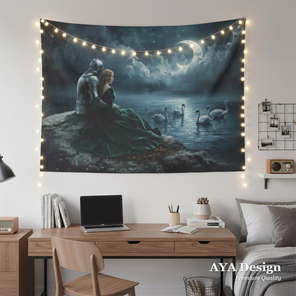 Transform your blank walls into a breathtaking portal to a forgotten realm. This stunning "Swan Lake" tapestry captures a quiet, moonlit moment between a valiant knight in shining armor and his beautiful princess. Sitting by the tranquil, sparkling waters as graceful swans glide by, this piece exudes the magical, moody atmosphere of your favorite fantasy romance novels and epic fairy tales.