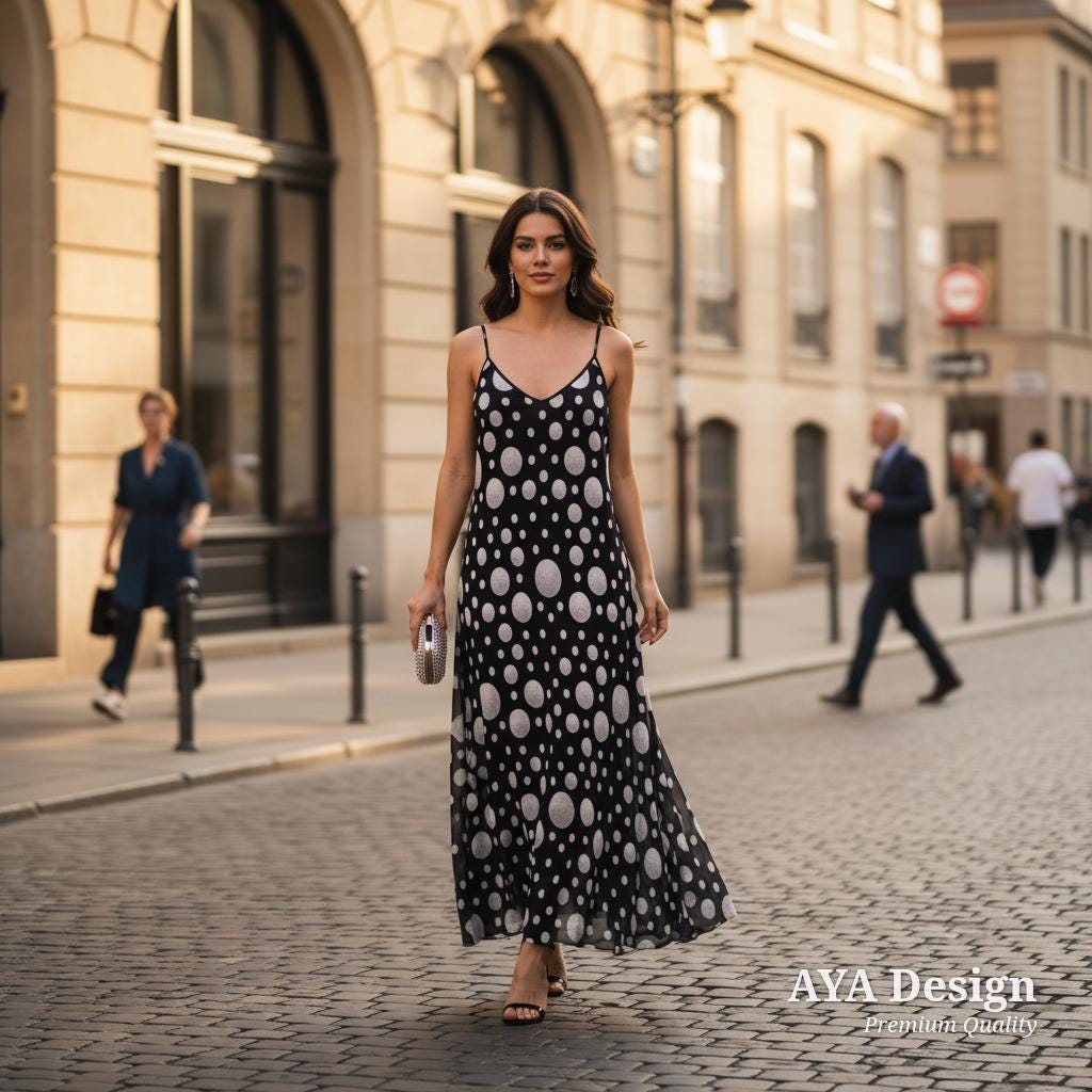 Meet your new wardrobe staple: The AYA Design Abstract Pearl-Dot Maxi Dress.